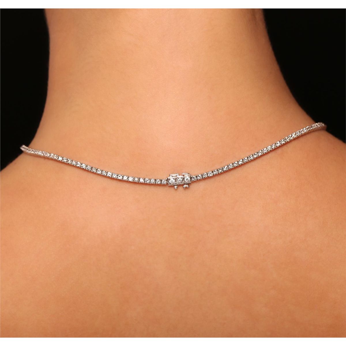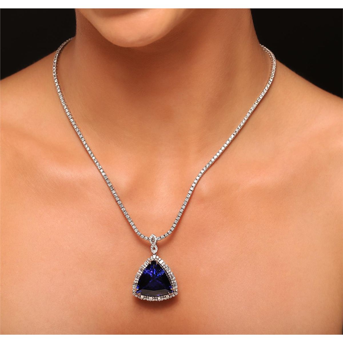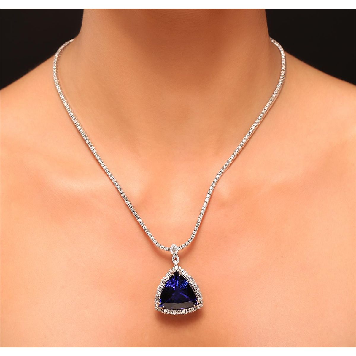 One electronically tested 14KT white gold Ladies combination cast & assembled pendant & chain 16.8 inch long, medium with a hidden box clasp with a bright polish finish. Condition is new. Identified with markings of "14K". Containing: One prong set triangle modified brilliant cut natural tanzanite, measuring 21.60 x 21.95 x 14.97mm, exact weight 46.34ct., clarity is eye clean, type I, medium, moderately strong, violetish blue color, (GIA vB 5/4), cut is very good. GIA Report: 2161000229. Eighty-Seven prong set round brilliant cut diamonds, measuring 2.00 - 2.00 x 1.20mm (depth est.) approximate. Total Weight of 87 Stones = 2.54ct. . Clarity: I-1 to I-2. Color: J - K, Cut is Good. Seventy-Eight prong set round brilliant cut diamonds, measuring 1.10 - 1.10 x 0.66mm (depth est.) approximate. Total Weight of 78 Stones = 0.37ct. . Clarity: I-1 to I-2. Color: H - I, Cut is Good. Fifteen prong set baguette cut diamonds, measuring 2.60 x 1.50 x 1.28mm (depth est.) approximate. Total Weight of 15 Stones = 0.68ct. . Clarity: SI-1. Color: G - H, Cut is Very Good. Total Weight of Colored Stones 46.34ct. Total Weight of Diamonds 3.60ct. Total Weight of Pendant & Chain 39.20 grams. GGL Appraised at $81,200.00.
