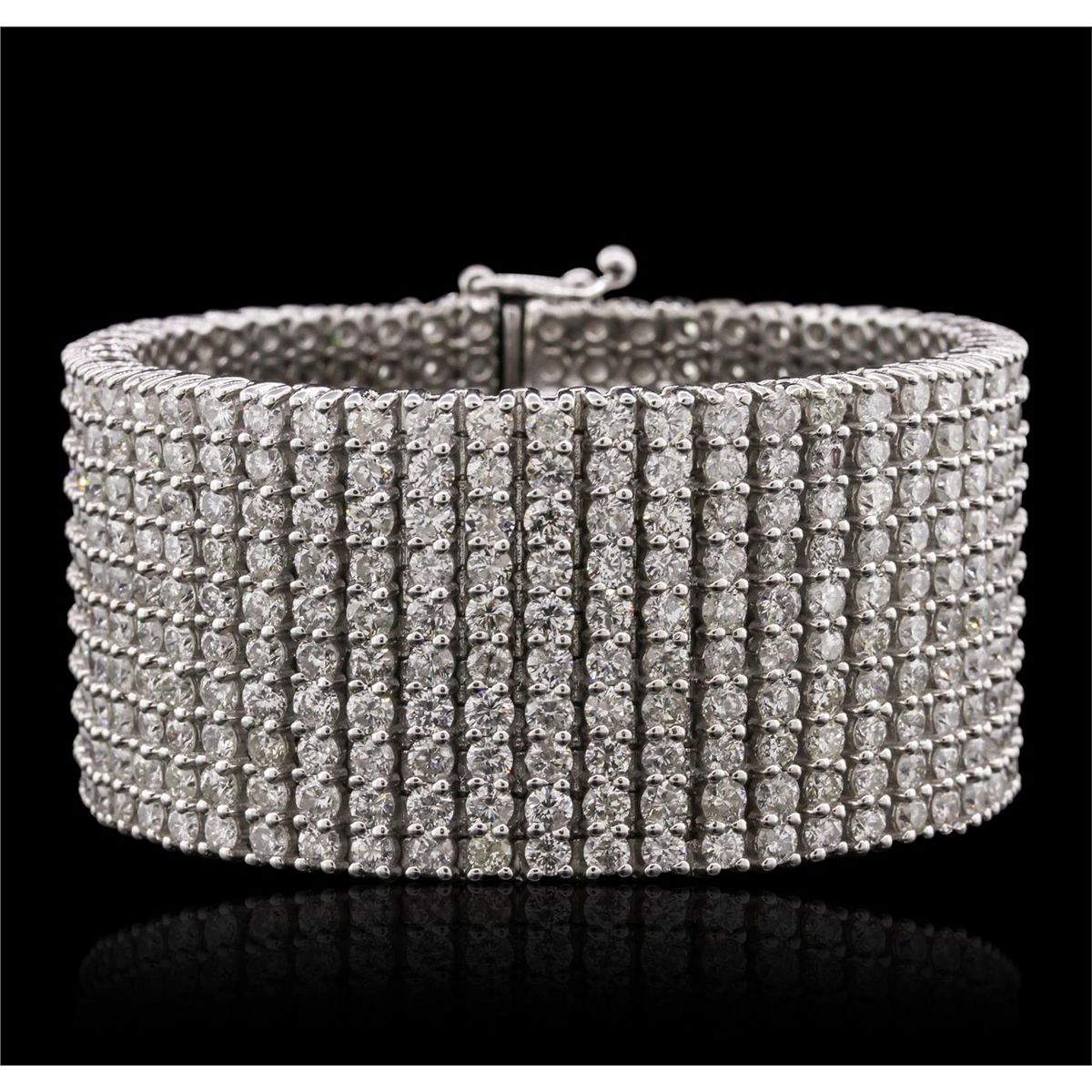 One electronically tested 14KT white gold ladies cast & assembled diamond bracelet with a bright polish finish. Condition is new, good workmanship. The bracelet features a ribbon of diamonds seven inch length and one one-quarter inch width, terminating in a concealed box clasp with twin safeties. Identified with markings of "14K". Containing: Five Hundred prong set round brilliant cut diamonds, measuring 3.00 - 2.90 x 1.77mm (depth est.) approximate. Total Weight of 500 Stones = 47.05ct. Graded in the setting. Clarity: I-1 to I-2. Color: G - J. Total Weight of Diamonds 47.05ct. Total Weight of Bracelet166.80 grams. AIG Appraised at $131,015.00.