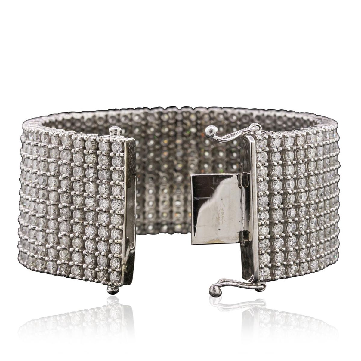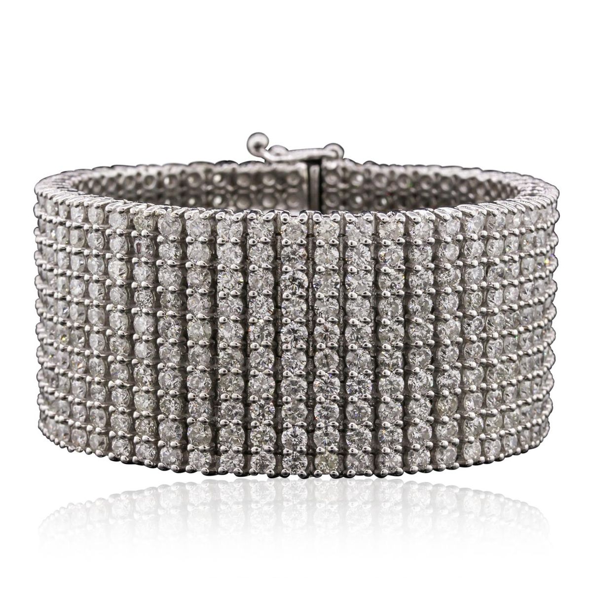 One electronically tested 14KT white gold ladies cast & assembled diamond bracelet with a bright polish finish. Condition is new, good workmanship. The bracelet features a ribbon of diamonds seven inch length and one one-quarter inch width, terminating in a concealed box clasp with twin safeties. Identified with markings of "14K". Containing: Five Hundred prong set round brilliant cut diamonds, measuring 3.00 - 2.90 x 1.77mm (depth est.) approximate. Total Weight of 500 Stones = 47.05ct. Graded in the setting. Clarity: I-1 to I-2. Color: G - J. Total Weight of Diamonds 47.05ct. Total Weight of Bracelet166.80 grams. AIG Appraised at $131,015.00.