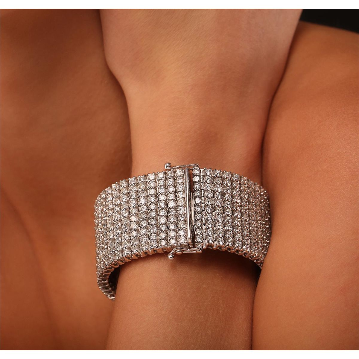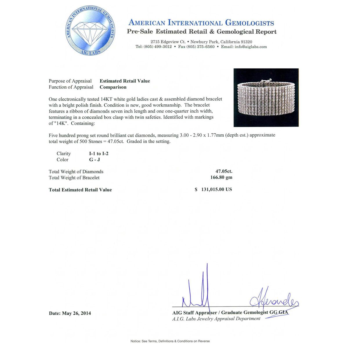 One electronically tested 14KT white gold ladies cast & assembled diamond bracelet with a bright polish finish. Condition is new, good workmanship. The bracelet features a ribbon of diamonds seven inch length and one one-quarter inch width, terminating in a concealed box clasp with twin safeties. Identified with markings of "14K". Containing: Five Hundred prong set round brilliant cut diamonds, measuring 3.00 - 2.90 x 1.77mm (depth est.) approximate. Total Weight of 500 Stones = 47.05ct. Graded in the setting. Clarity: I-1 to I-2. Color: G - J. Total Weight of Diamonds 47.05ct. Total Weight of Bracelet166.80 grams. AIG Appraised at $131,015.00.