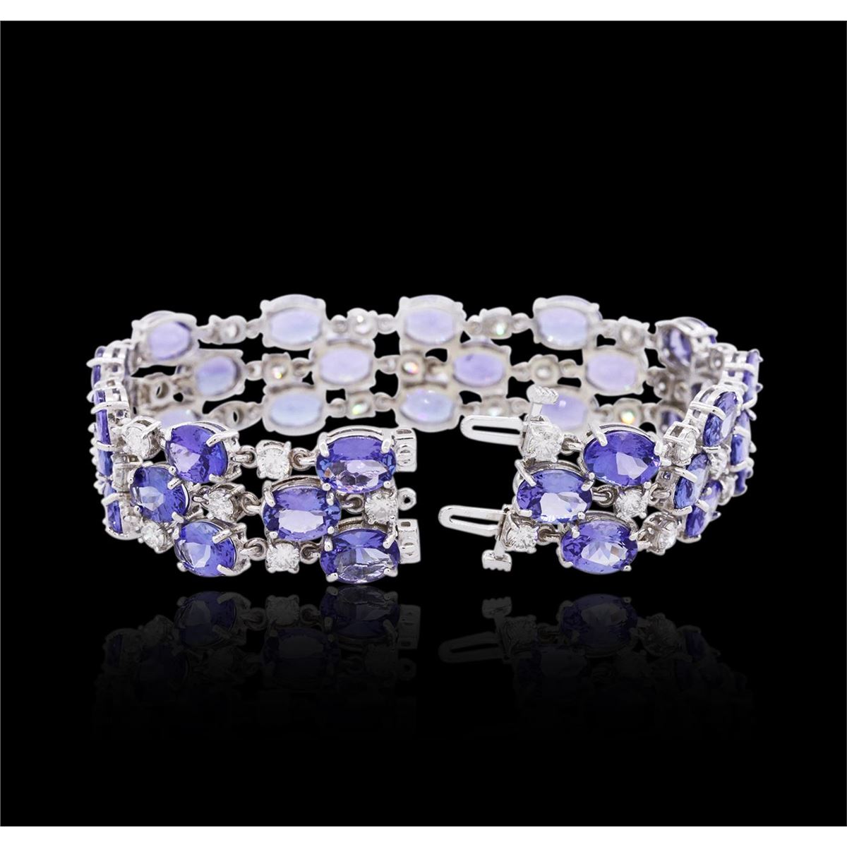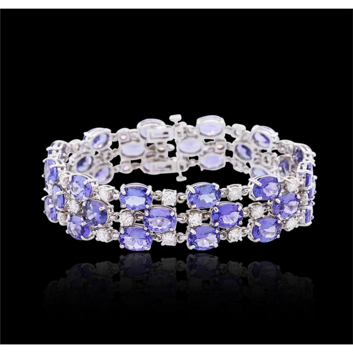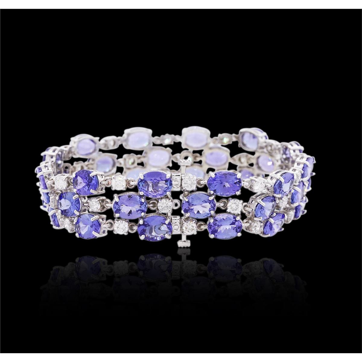 One electronically tested 14KT white gold ladies combination cast & assembled tanzanite and diamond bracelet with a hidden box clasp with a bright polish finish. The bracelet measures 7-1/2" long Condition is new. Containing: Thirty-Six prong set round brilliant cut diamonds, measuring 3.10 - 3.10 x 1.86mm (depth est.) approximate total weight of 36 Stones = 3.92ct. Clarity: SI-2 to I-1. Color: I - J, Cut is Good. Thirty-six prong set oval modified brilliant cut natural tanzanites, measuring 8.00 x 6.00 x 3.90mm, approximate total weight of 47.52ct., clarity is eye clean, type I, medium light, very slightly grayish, violet color, (GIA V 4/3), cut is good. Colored gemstones are presumed to have been subjected to commonly used enhancement processes. All diamonds and colored gemstones are graded in the mounting, unless otherwise stated. Total Weight of Colored Stones 47.52ct. Total Weight of Diamonds 3.92ct. Total Weight of Bracelet 37.60 grams. GGL Appraised at $32,170.00.