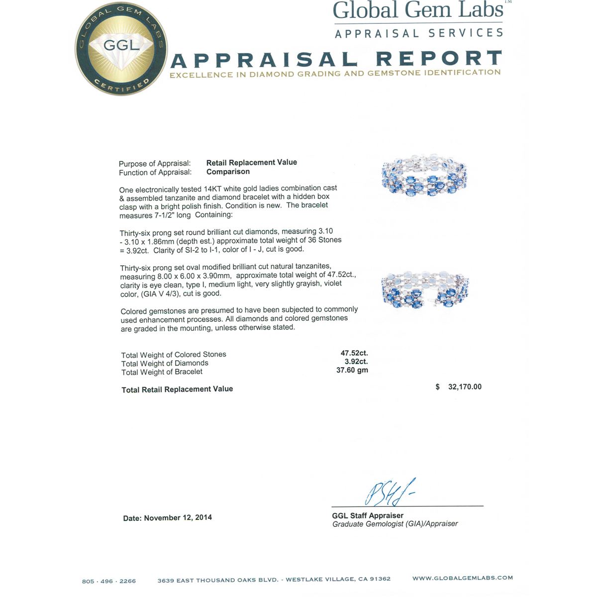 One electronically tested 14KT white gold ladies combination cast & assembled tanzanite and diamond bracelet with a hidden box clasp with a bright polish finish. The bracelet measures 7-1/2" long Condition is new. Containing: Thirty-Six prong set round brilliant cut diamonds, measuring 3.10 - 3.10 x 1.86mm (depth est.) approximate total weight of 36 Stones = 3.92ct. Clarity: SI-2 to I-1. Color: I - J, Cut is Good. Thirty-six prong set oval modified brilliant cut natural tanzanites, measuring 8.00 x 6.00 x 3.90mm, approximate total weight of 47.52ct., clarity is eye clean, type I, medium light, very slightly grayish, violet color, (GIA V 4/3), cut is good. Colored gemstones are presumed to have been subjected to commonly used enhancement processes. All diamonds and colored gemstones are graded in the mounting, unless otherwise stated. Total Weight of Colored Stones 47.52ct. Total Weight of Diamonds 3.92ct. Total Weight of Bracelet 37.60 grams. GGL Appraised at $32,170.00.