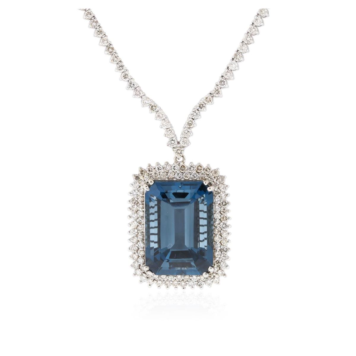 One electronically tested 14KT white gold ladies cast & assembled blue topaz and diamond necklace with a bright polish finish. Condition is new, good workmanship. Eighteen inch length necklace features a blue topaz and two tiered diamond pendant supported by chevron style diamond ribbon, terminating in a concealed clasp with safety. Identified with markings of "14K". Containing: One prong set rectangular step cut natural blue topaz, measuring 25.00 x 17.50 x 11.82mm, exact weight 47.59ct., clarity is eye clean, type I, dark, moderately strong, very slightly greenish blue color, (GIA vslgB 7/4), cut is good. Transmitting light with no distortion, transparent. Refractive index testing results of 1.61to 1.62. This is a conclusive result for topaz. Graded loose. A deposit of a thin layer has been applied to the topaz to produce the intense color effect. The process utilizes a very high temperature treatment, diffusion of ions into the topaz, plus in some cases neutron bombardment has been used to create the color center. Diffusion processes causes the added ions to become part of the crystal surface with no distinct boundary. Do not put a gem treated in this manner into an ultrasonic cleaner. Two Hundred Seventy-Six prong set round brilliant cut diamonds, measuring 2.50 - 1.90 x 1.32mm (depth est.) approximate. Total Weight of 276 Stones = 10.85ct. Graded in the setting. Clarity: SI-1 to I-1. Color: H - J. Total Weight of Colored Stones 47.59ct. Total Weight of Diamonds 10.85ct. Total Weight of Necklace 38.27 grams. AIG Appraised at $36,710.00.