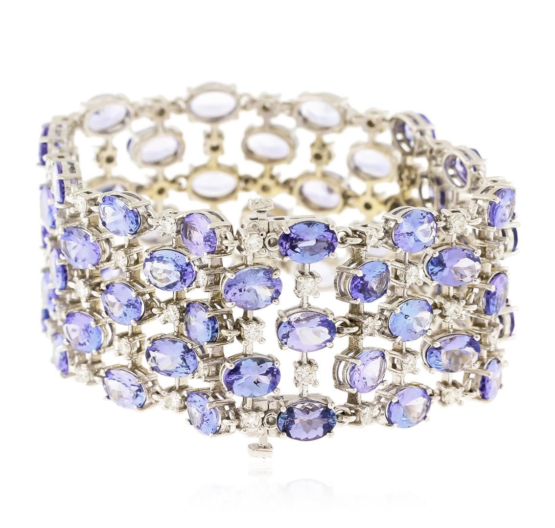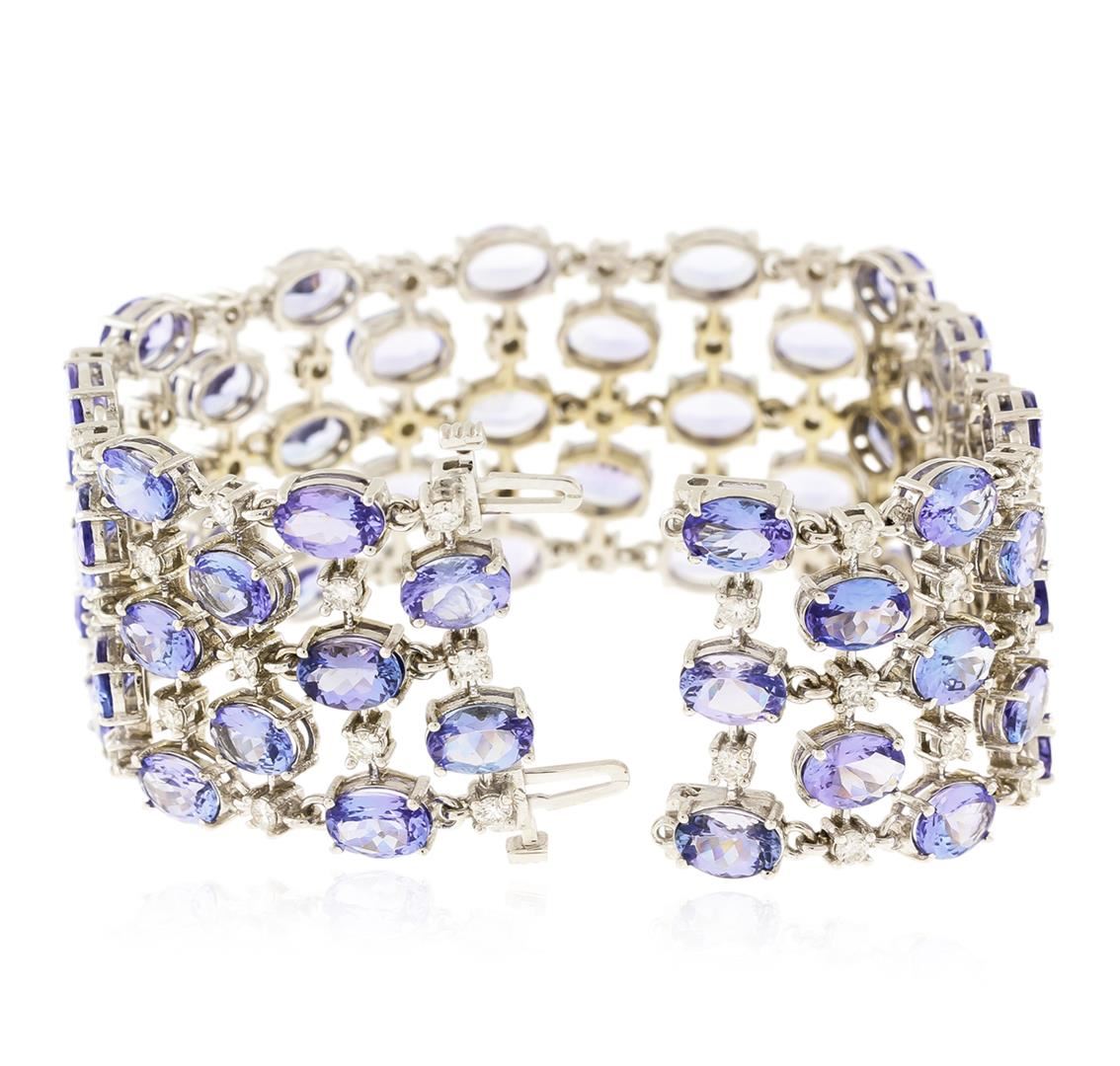 One electronically tested 14KT white gold ladies cast tanzanite and diamond bracelet with a hidden box clasp with a bright polish finish. Measurements: 7" in length. Condition is new. Containing: Sixty prong set oval modified brilliant cut natural tanzanites, measuring 7.00. x 5.00. x 3.25mm, approximate total weight of 48.00.ct., clarity is eye clean, type I, medium light, very slightly grayish, violet color, (GIA V 4/3), cut is good. Sixty prong set round brilliant cut diamonds, measuring 2.40 - 2.40 x 1.44mm (depth est.) approximate total weight of 60 Stones = 3.04ct. Clarity: SI-2 to I-1. Color: I - J, Cut is Good. Colored gemstones are presumed to have been subjected to commonly used enhancement processes. All diamonds and colored gemstones are graded in the mounting, unless otherwise stated. Total Weight of Colored Stones 48.00.ct. Total Weight of Diamonds 3.04ct. Total Weight of Bracelet 41.70 grams. GGL Appraised at $17,000.00.