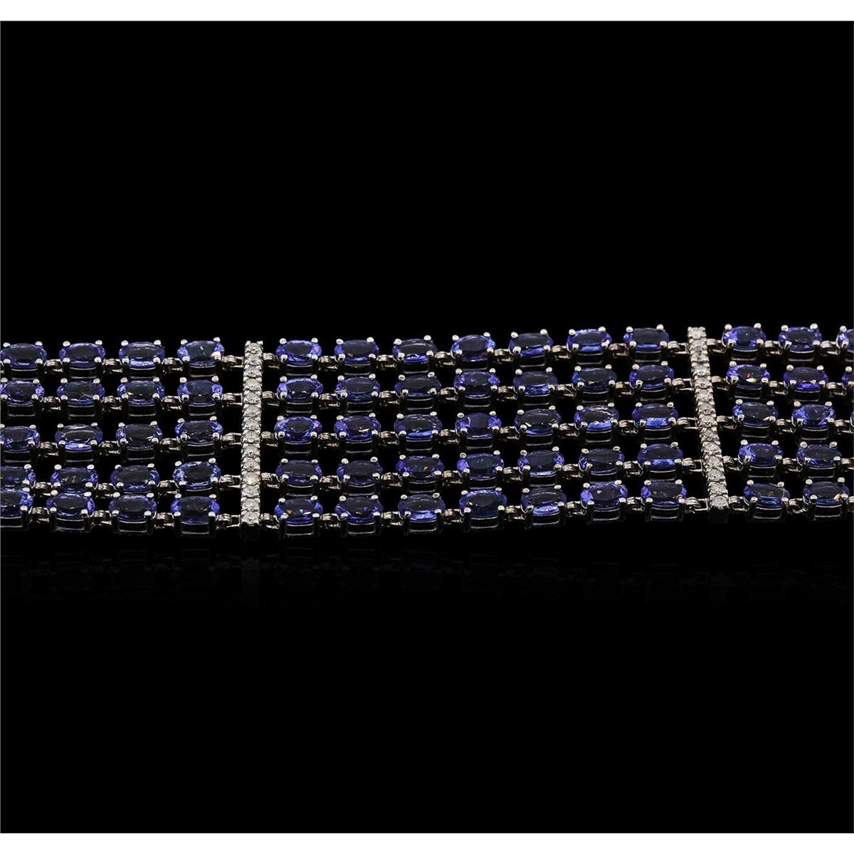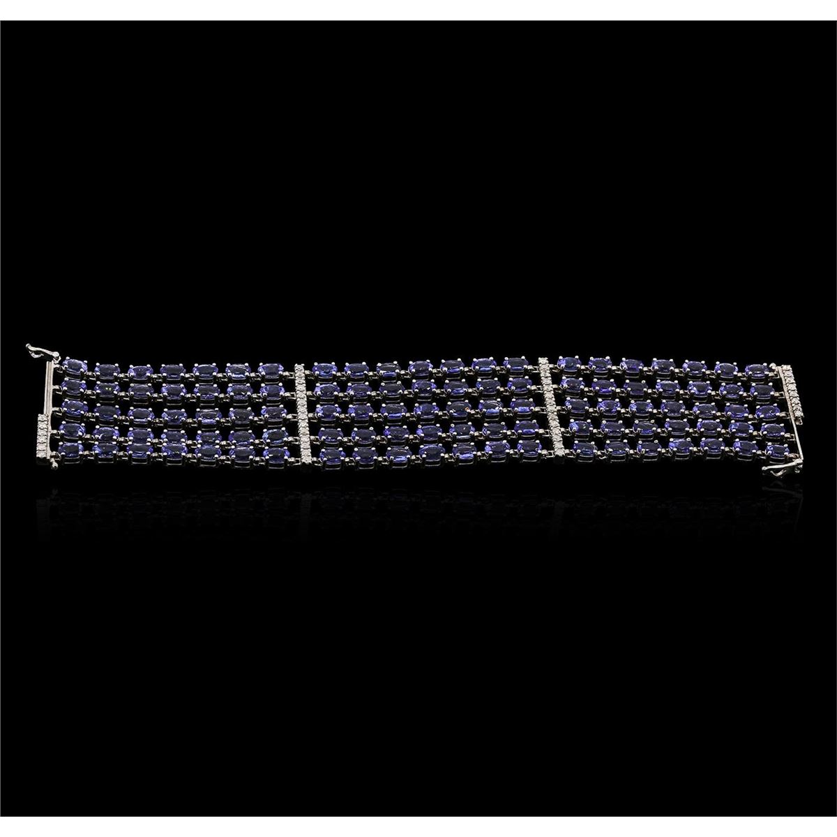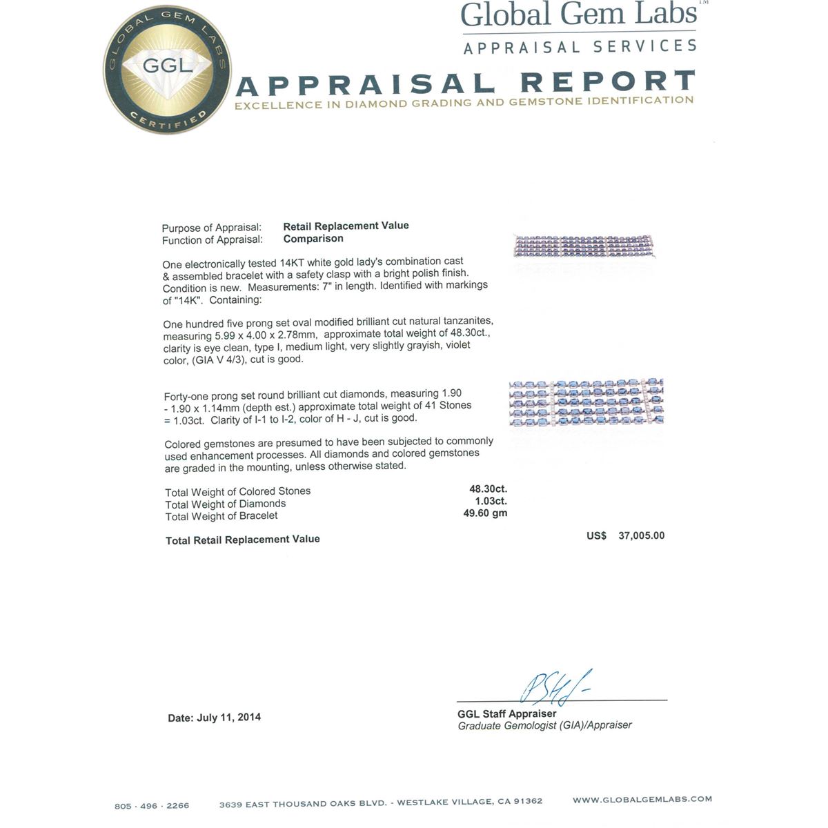 One electronically tested 14KT white gold Ladies combination cast & assembled bracelet with a safety clasp with a bright polish finish. Condition is new. Measurements: 7" in length. Identified with markings of "14K". Containing: One hundred five prong set oval modified brilliant cut natural tanzanites, measuring 5.99 x 4.00 x 2.78mm, approximate. Total Weight of 48.30ct., clarity is eye clean, type I, medium light, very slightly grayish, violet color, (GIA V 4/3), cut is good. Forty-One prong set round brilliant cut diamonds, measuring 1.90 - 1.90 x 1.14mm (depth est.) approximate. Total Weight of 41 Stones = 1.03ct. Clarity: I-1 to I-2. Color: H - J, Cut is Good. Colored gemstones are presumed to have been subjected to commonly used enhancement processes. All diamonds and colored gemstones are graded in the mounting, unless otherwise stated. Total Weight of Colored Stones 48.30ct. Total Weight of Diamonds 1.03ct. Total Weight of Bracelet 49.60 grams. GGL Appraised at $37,005.00.