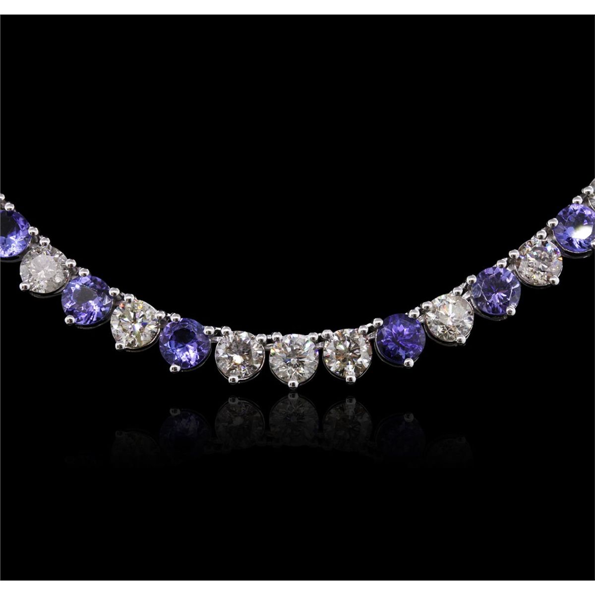 One electronically tested 14KT white gold ladies combination cast & assembled tanzanite and diamond necklace with a hidden box clasp with safety closer with a bright polish finish. Measurements: 17.50" in length. Identified with markings of "14K". Condition is new. Containing: Sixty-eight prong set round modified brilliant cut natural tanzanites, measuring 5.50 - 5.50 x 3.58 mm, approximate total weight of 49.64ct., clarity is eye clean, type I, medium light, moderately strong, violet color, (GIA V 4/4), cut is good. Nine prong set round brilliant cut diamonds, measuring 5.50 - 5.50 x 3.30mm (depth est.) approximate total weight of 9 Stones = 5.48ct. Clarity: I-1 to I-2. Color: K - L, Cut is Good. 'Colored gemstones are presumed to have been subjected to commonly used enhancement processes. All diamonds and colored gemstones are graded in the mounting, unless otherwise stated. Total Weight of Colored Stones 49.64ct. Total Weight of Diamonds 5.48ct. Total Weight of Necklace 44.00 grams. GGL Appraised at $36,340.00.