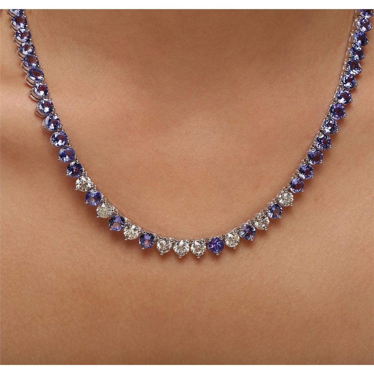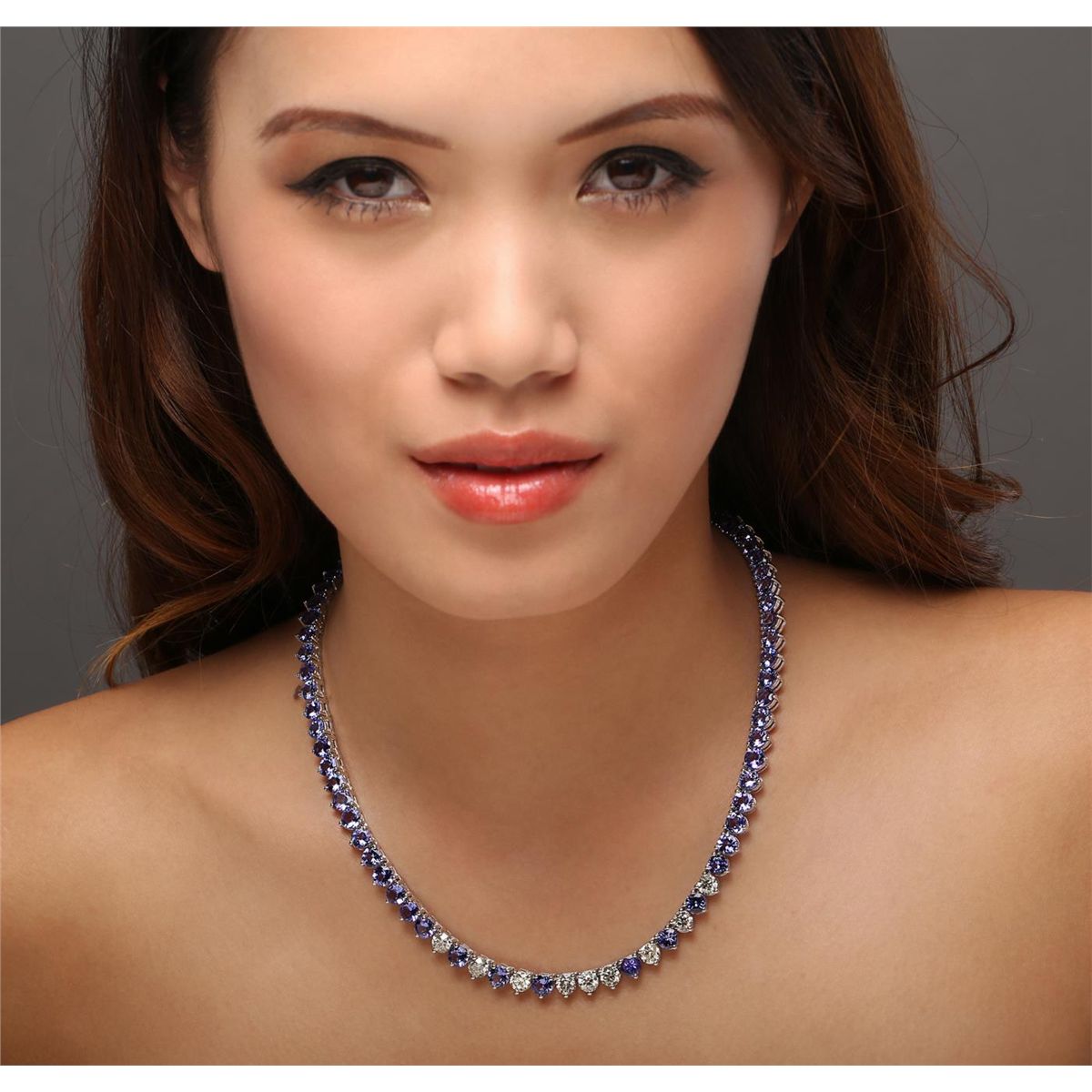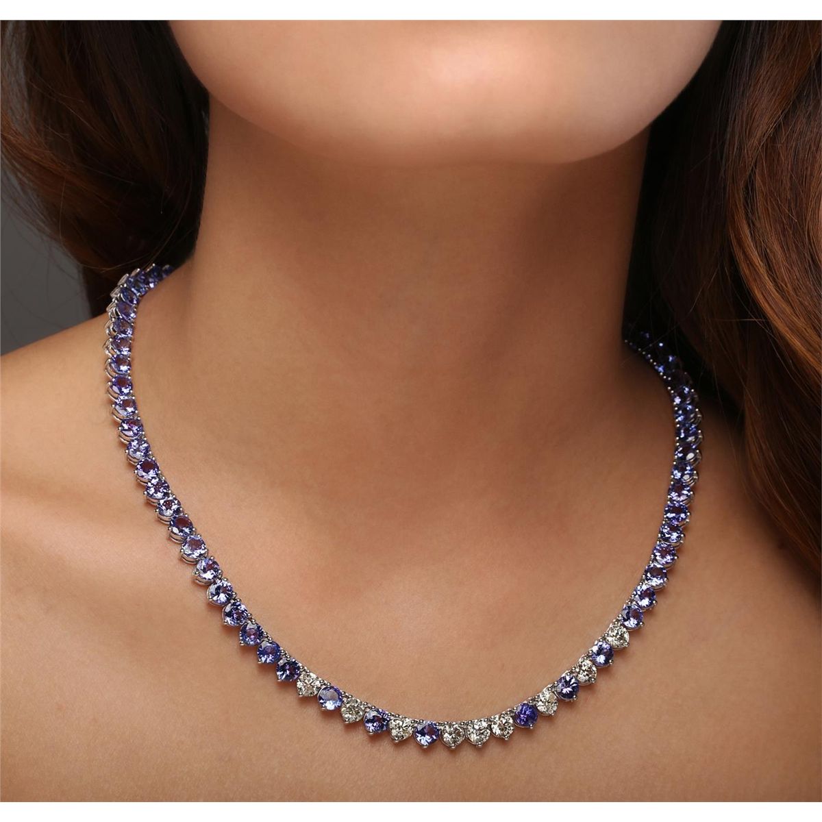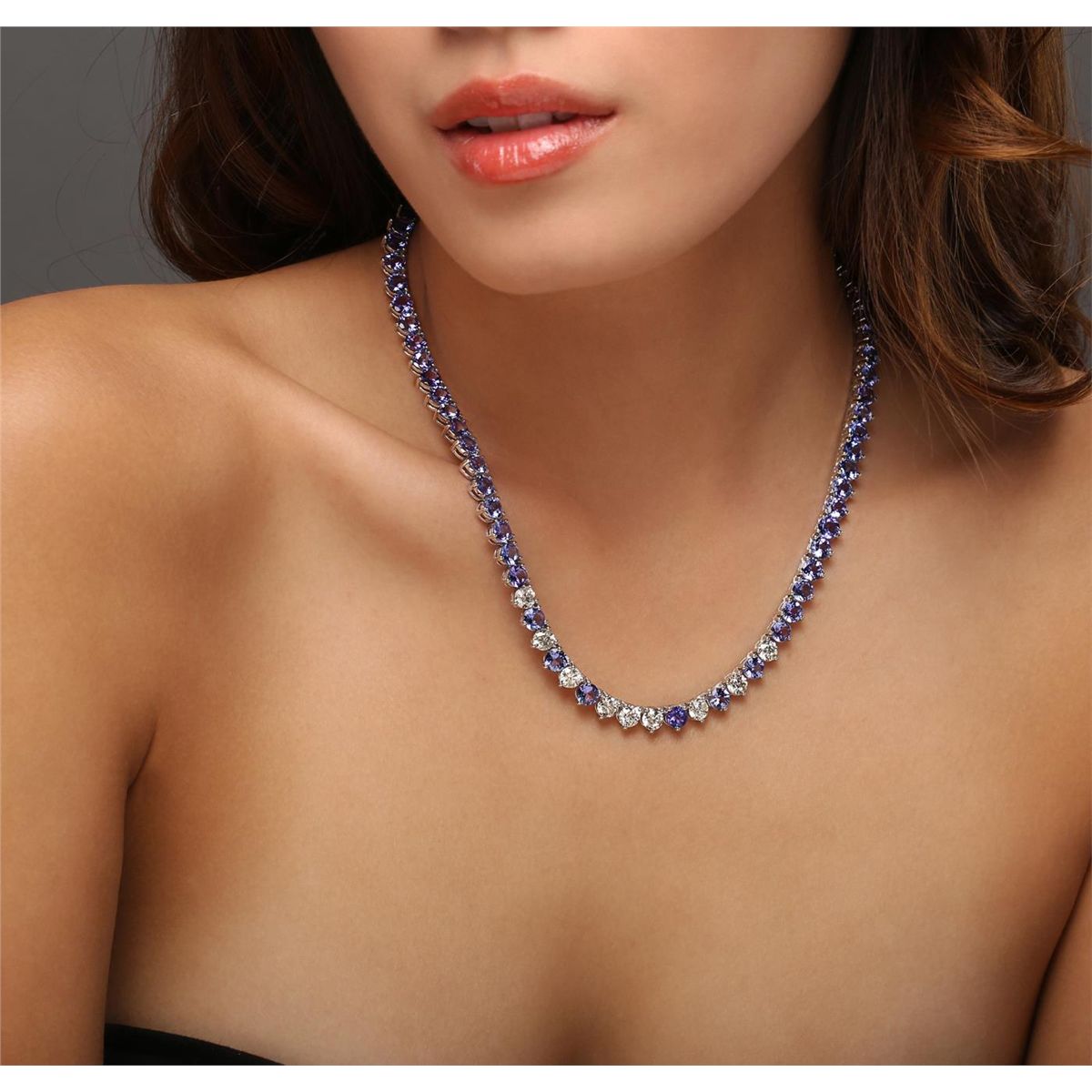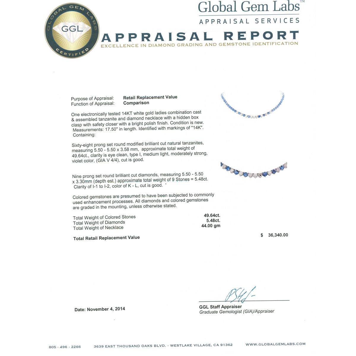 One electronically tested 14KT white gold ladies combination cast & assembled tanzanite and diamond necklace with a hidden box clasp with safety closer with a bright polish finish. Measurements: 17.50" in length. Identified with markings of "14K". Condition is new. Containing: Sixty-eight prong set round modified brilliant cut natural tanzanites, measuring 5.50 - 5.50 x 3.58 mm, approximate total weight of 49.64ct., clarity is eye clean, type I, medium light, moderately strong, violet color, (GIA V 4/4), cut is good. Nine prong set round brilliant cut diamonds, measuring 5.50 - 5.50 x 3.30mm (depth est.) approximate total weight of 9 Stones = 5.48ct. Clarity: I-1 to I-2. Color: K - L, Cut is Good. 'Colored gemstones are presumed to have been subjected to commonly used enhancement processes. All diamonds and colored gemstones are graded in the mounting, unless otherwise stated. Total Weight of Colored Stones 49.64ct. Total Weight of Diamonds 5.48ct. Total Weight of Necklace 44.00 grams. GGL Appraised at $36,340.00.