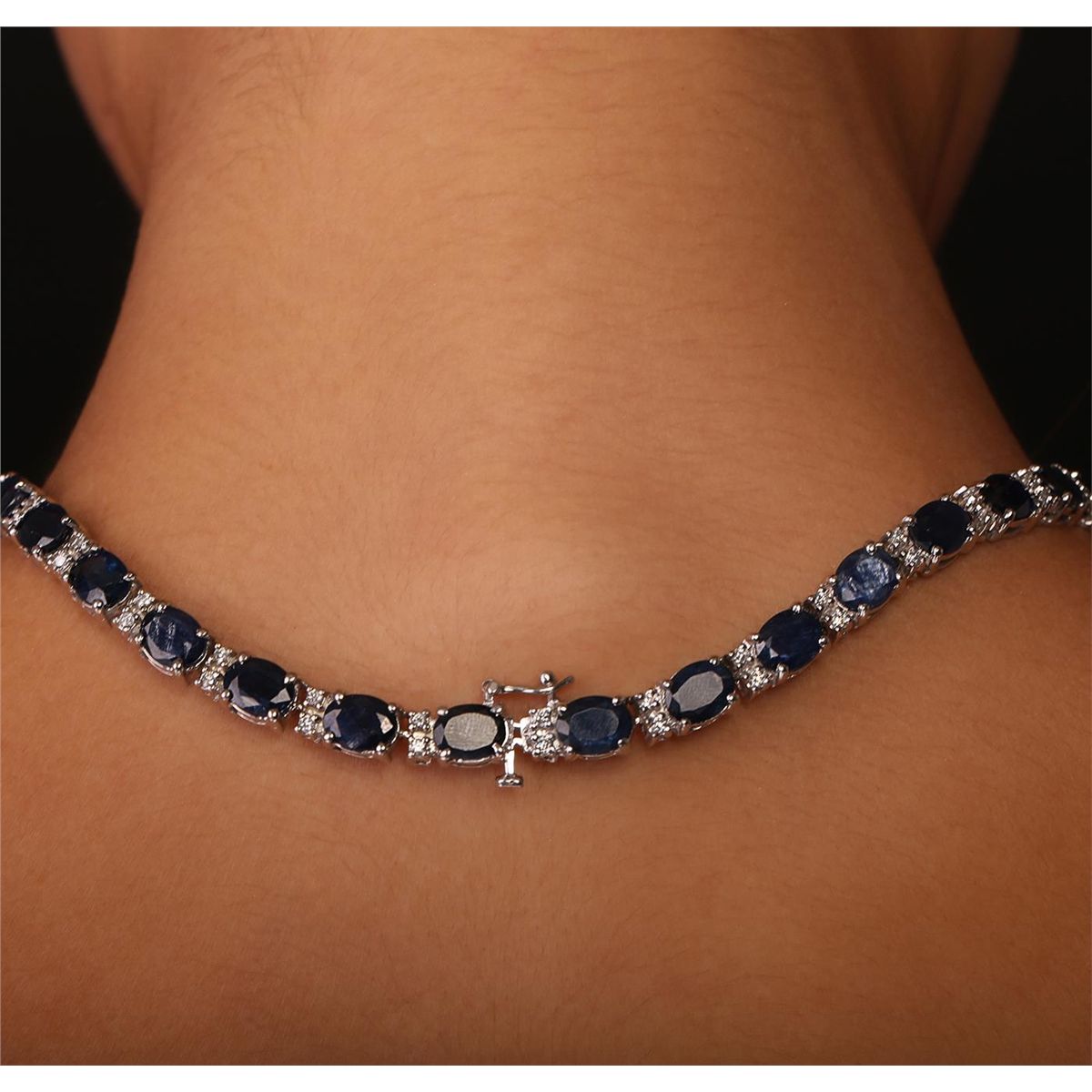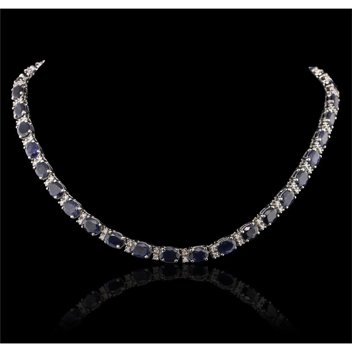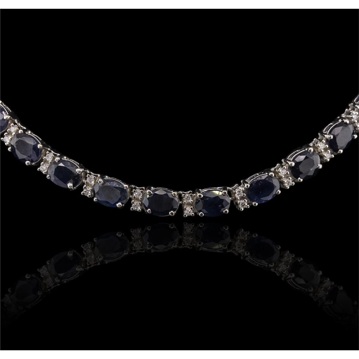 One electronically tested 14KT white gold Ladies combination cast & assembled necklace with a hidden box clasp with a bright polish finish. Condition is new. Measurements: 17" in length. Identified with markings of "14K". Containing: Thirty-nine prong set oval modified brilliant cut natural blue sapphires, measuring 7.80 x 5.90 x 3.40mm, approximate. Total Weight of 49.92ct., clarity is heavily included, type II, medium, moderately strong, blue color, (GIA B 5/4), cut is good. Colored gemstones are presumed to have been subjected to commonly used color/clarity enhancement processes. Seventy-Eight prong set round brilliant cut diamonds, measuring 1.50 - 1.50 x 0.90mm (depth est.) approximate. Total Weight of 78 Stones = 0.96ct. Clarity: I-1 to I-2. Color: H - I, Cut is Good. Total Weight of Colored Stones 49.92ct. Total Weight of Diamonds 0.96ct. Total Weight of Necklace 50.20 grams. GGL Appraised at $39,470.00.
