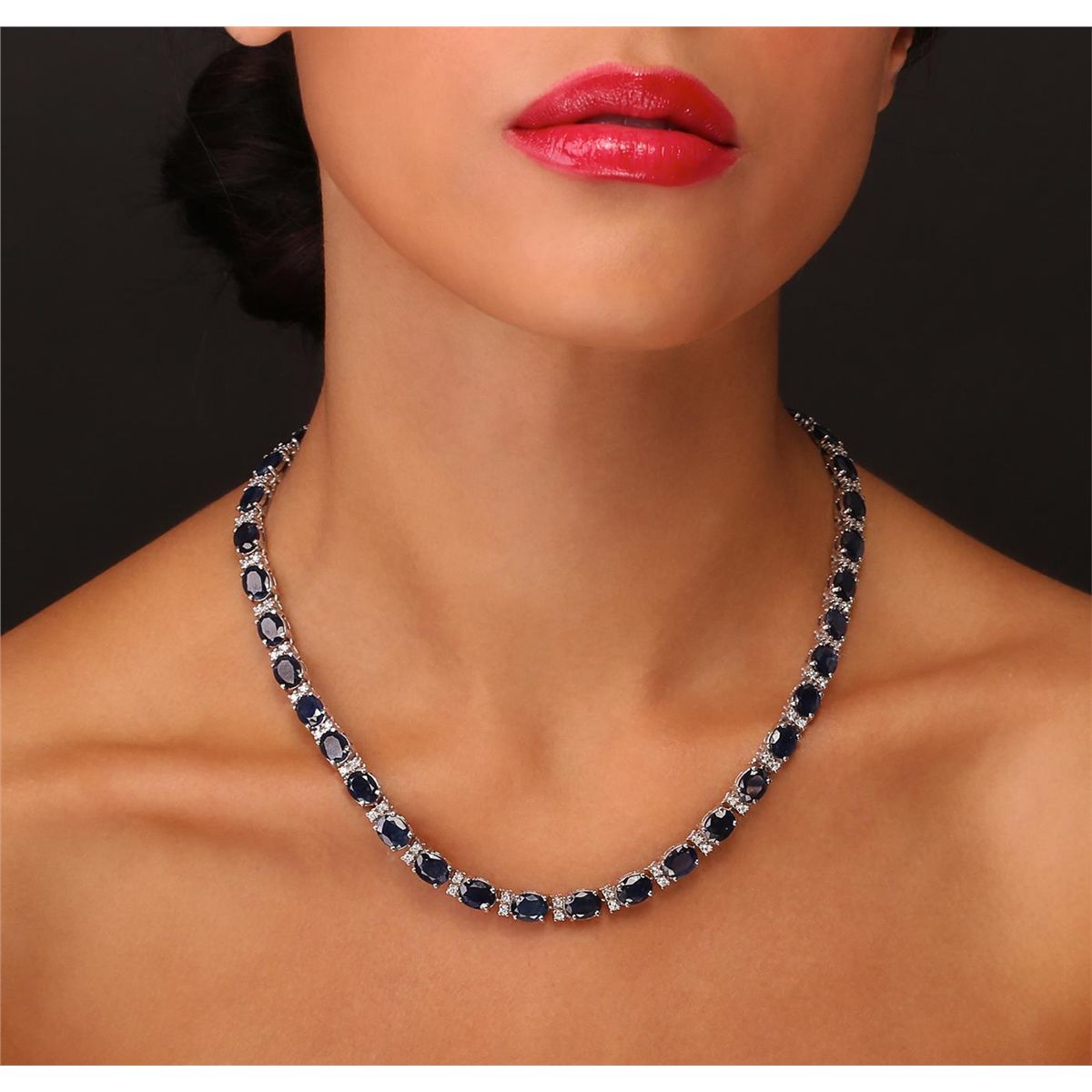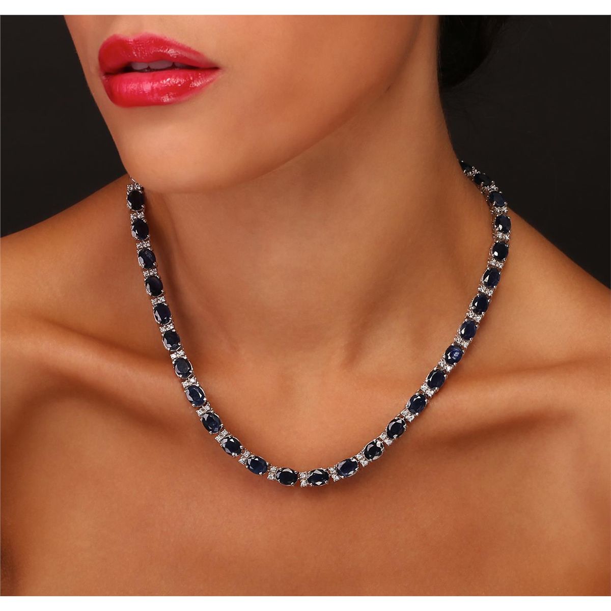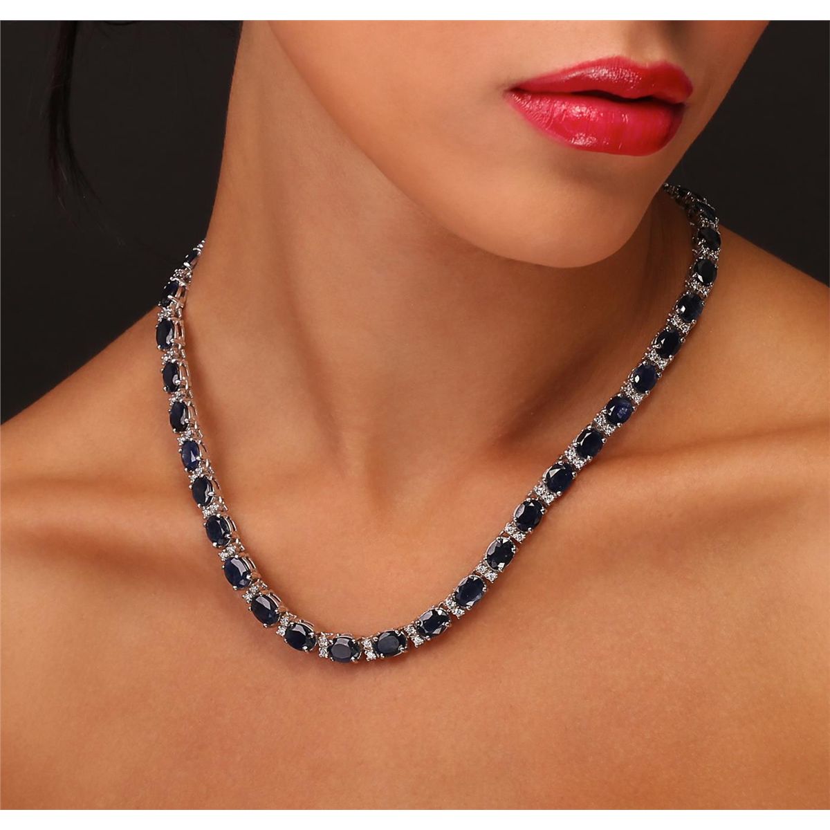 One electronically tested 14KT white gold Ladies combination cast & assembled necklace with a hidden box clasp with a bright polish finish. Condition is new. Measurements: 17" in length. Identified with markings of "14K". Containing: Thirty-nine prong set oval modified brilliant cut natural blue sapphires, measuring 7.80 x 5.90 x 3.40mm, approximate. Total Weight of 49.92ct., clarity is heavily included, type II, medium, moderately strong, blue color, (GIA B 5/4), cut is good. Colored gemstones are presumed to have been subjected to commonly used color/clarity enhancement processes. Seventy-Eight prong set round brilliant cut diamonds, measuring 1.50 - 1.50 x 0.90mm (depth est.) approximate. Total Weight of 78 Stones = 0.96ct. Clarity: I-1 to I-2. Color: H - I, Cut is Good. Total Weight of Colored Stones 49.92ct. Total Weight of Diamonds 0.96ct. Total Weight of Necklace 50.20 grams. GGL Appraised at $39,470.00.