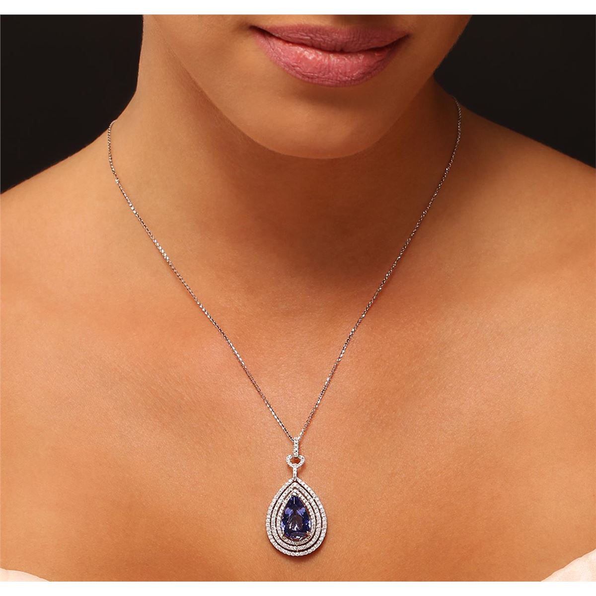 One electronically tested 14KT white gold Ladies pendant & chain 17.5" long, medium fancy cable link with a lobster claw clasp with a bright polish finish. Condition is new. Identified with markings of "14K". Containing: One prong set pear modified brilliant cut natural tanzanite, measuring 14.00 x 9.00 x 4.73mm, approximate weight of 5.00ct., clarity is eye clean, type I, medium light, moderately strong, bluish violet color, (GIA bV 4/4), cut is very good. Colored gemstones are presumed to have been subjected to commonly used color/clarity enhancement processes. One Hundred Fifty-Two prong set round brilliant cut diamonds, measuring 1.20 - 1.20 x 0.72mm (depth est.) approximate. Total Weight of 152 Stones = 0.98ct. Clarity: I-1 to I-2. Color: H - I, Cut is Good. Total Weight of Colored Stones 5.00ct. Total Weight of Diamonds 0.98ct. Total Weight of Pendant & Chain 6.20 grams. GGL Appraised at $10,440.00.