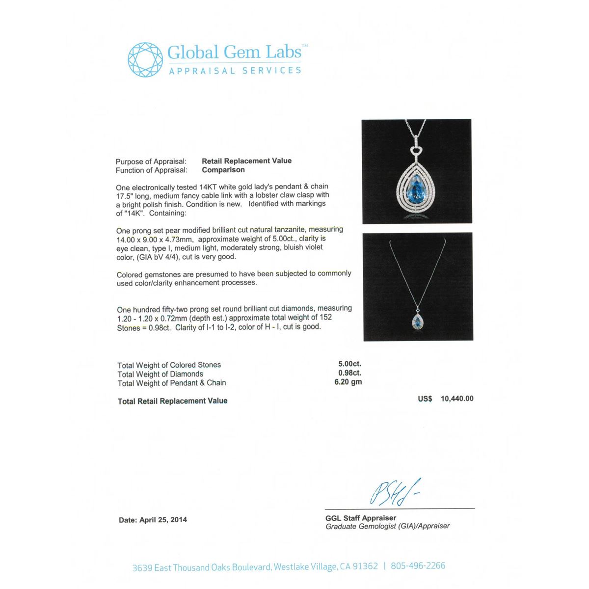 One electronically tested 14KT white gold Ladies pendant & chain 17.5" long, medium fancy cable link with a lobster claw clasp with a bright polish finish. Condition is new. Identified with markings of "14K". Containing: One prong set pear modified brilliant cut natural tanzanite, measuring 14.00 x 9.00 x 4.73mm, approximate weight of 5.00ct., clarity is eye clean, type I, medium light, moderately strong, bluish violet color, (GIA bV 4/4), cut is very good. Colored gemstones are presumed to have been subjected to commonly used color/clarity enhancement processes. One Hundred Fifty-Two prong set round brilliant cut diamonds, measuring 1.20 - 1.20 x 0.72mm (depth est.) approximate. Total Weight of 152 Stones = 0.98ct. Clarity: I-1 to I-2. Color: H - I, Cut is Good. Total Weight of Colored Stones 5.00ct. Total Weight of Diamonds 0.98ct. Total Weight of Pendant & Chain 6.20 grams. GGL Appraised at $10,440.00.