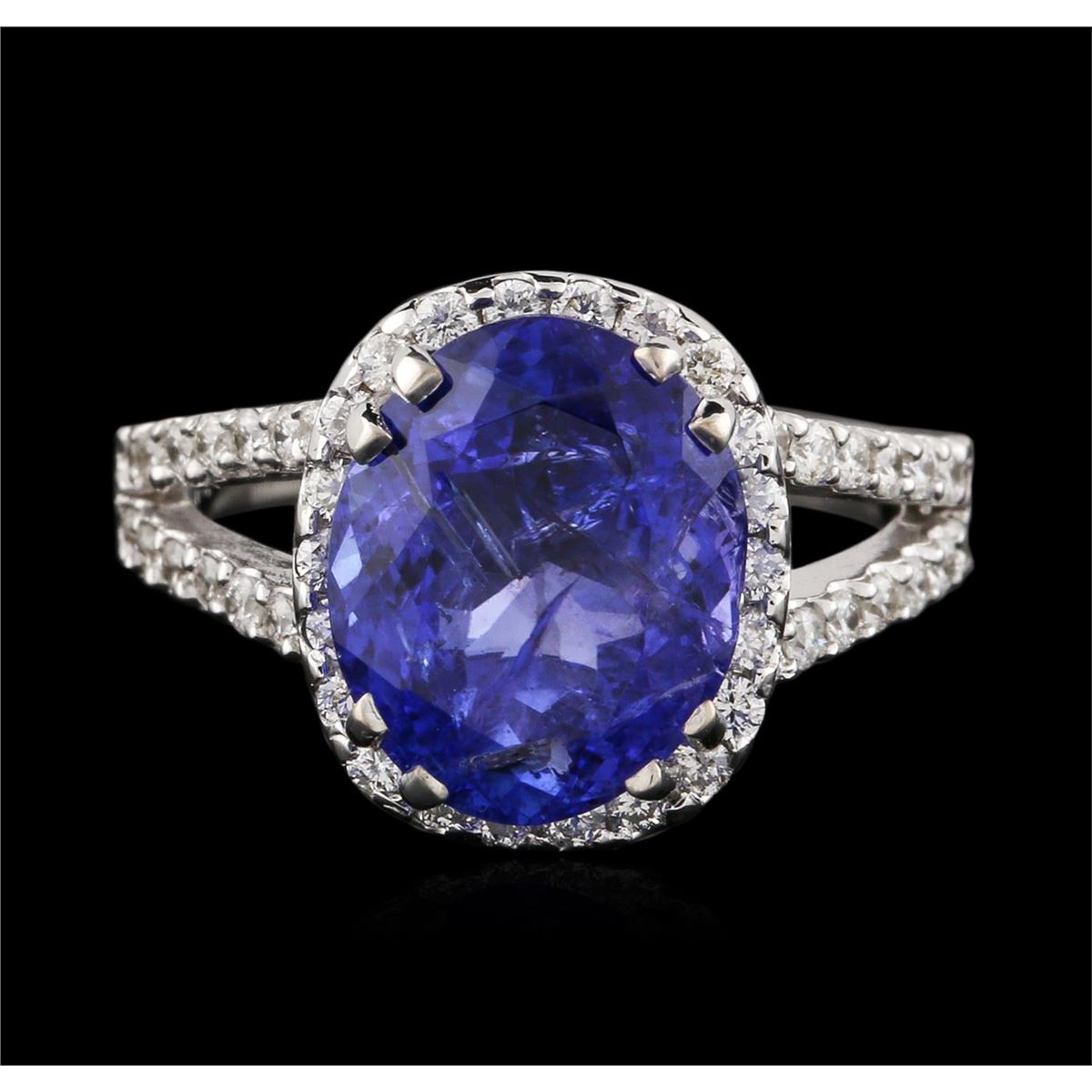 One electronically tested 14KT white gold ladies cast tanzanite and diamond ring with a bright polish finish. Identified with markings of "K14". Condition is new. Containing: One prong set oval modified brilliant cut natural tanzanite, measuring 11.72 x 9.48 x 6.40mm, approximate weight of 5.00ct., clarity is moderately included, type I, medium light, moderately strong, bluish violet color, (GIA bV 4/4), cut is good. Fifty-Four prong set round brilliant cut diamonds, measuring 1.60 - 1.60 x 0.96mm (depth est.) approximate total weight of 54 Stones = 0.81ct. Clarity: SI-2 to I-1. Color: I - J, Cut is Good. Colored gemstones are presumed to have been subjected to commonly used enhancement processes. All diamonds and colored gemstones are graded in the mounting, unless otherwise stated. Total Weight of Colored Stones 5.00ct. Total Weight of Diamonds 0.81ct. Total Weight of Ring 5.00 grams. GGL Appraised at $5,325.00.