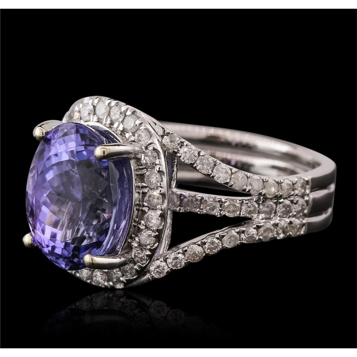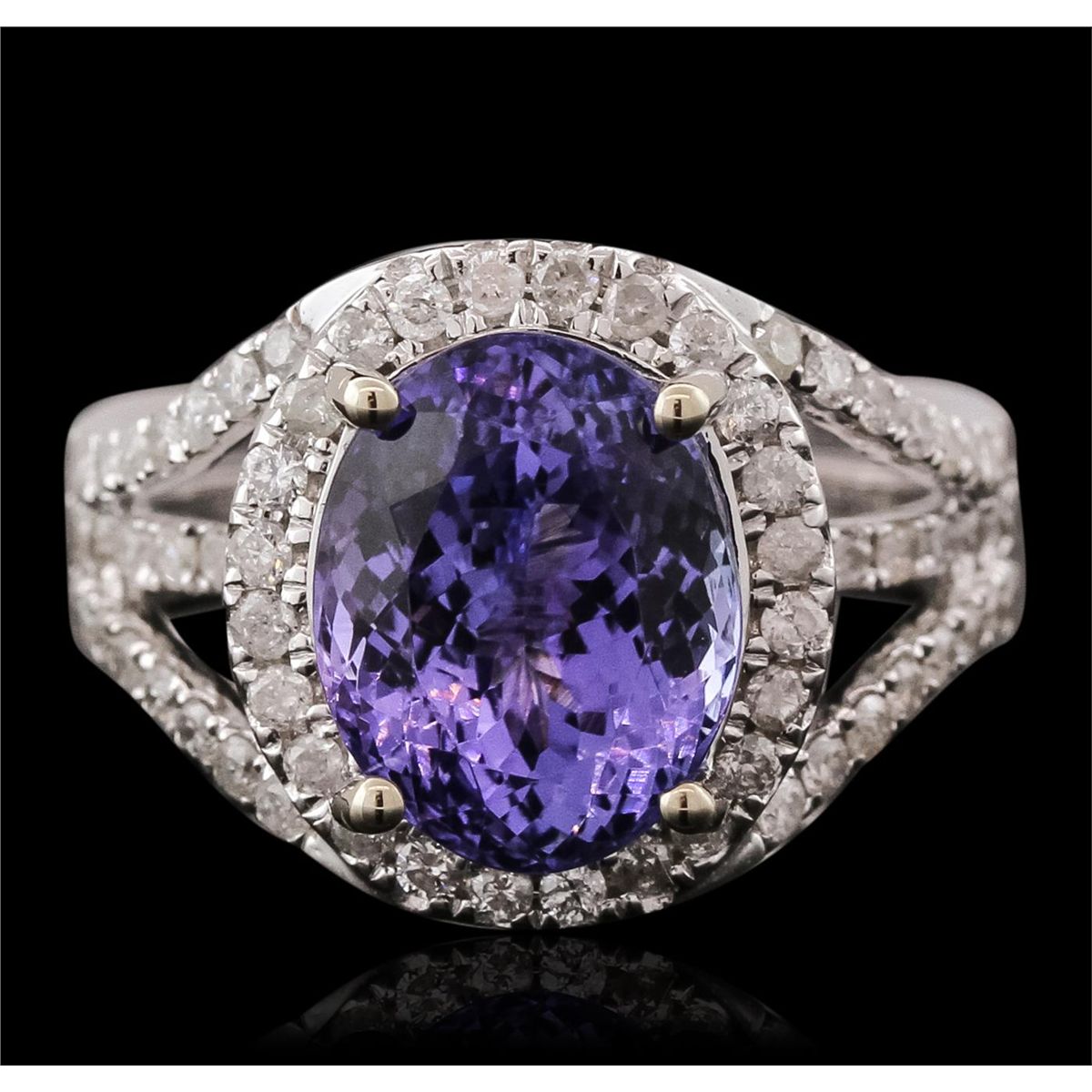 One electronically tested 14KT white gold ladies cast tanzanite and diamond ring with a bright polish finish. The featured tanzanite is set within a diamond bezel supported by diamond set three-way split shoulders, competed by a grooved five millimeter wide band. Trademark is Orianne. Identified with markings of "14K". Condition is new, good workmanship. Containing: One prong set oval brilliant cut natural tanzanite, measuring 11.50 x 9.00 x 6.70mm, 6% bulge factor, approximate weight of 5.00ct., clarity is eye clean, type I, medium dark, very slightly grayish, bluish violet color, (GIA bV 6/3), cut is good. Transmitting light with no distortion, transparent. Colored Stone Grading Report attached. Graded in the setting. Tanzanite is a very rare gemstone that is only found in the country of Tanzania. Originally discovered in 1967. Tiffany & Company, named the stone Tanzanite. It is found in the Usumburu Mountains that border the Umba Valley of northern Tanzania. Tanzanite occurs in gray, brown, violet, blue, reddish-purple, & green. The gem is interesting because of its exceptional pleochroism. Rotated in different directions a tanzanite will exhibit multiple changes of color. Tanzanite has a low tolerance to ultrasonic cleaning, and should not be cleaned using this method. Seventy-Four prong set round brilliant cut diamonds, measuring 1.50 - 1.40 x 0.87mm (depth est.) approximate total weight of 74 Stones = 0.92ct. Graded in the setting. Clarity: I-2 to I-3. Color: H - J. Total Weight of Colored Stones 5.00ct. Total Weight of Diamonds 0.92ct. Total Weight of Ring 7.00 grams. AIG Appraised at $15,385.00.