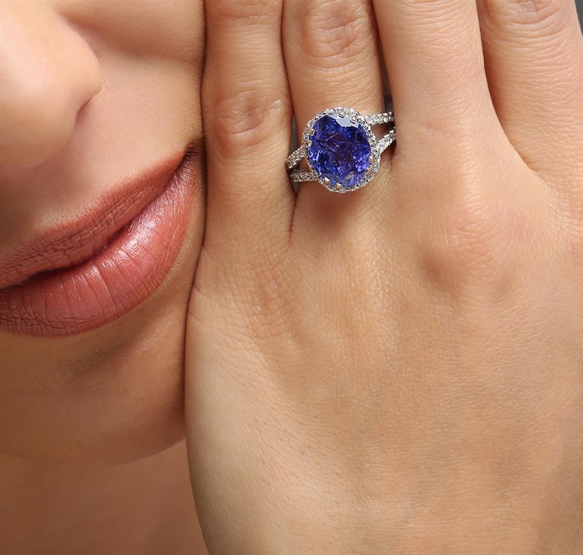 One electronically tested 14KT white gold ladies cast tanzanite and diamond ring with a bright polish finish. Identified with markings of "K14". Condition is new. Containing: One prong set oval modified brilliant cut natural tanzanite, measuring 11.72 x 9.48 x 6.40mm, approximate weight of 5.00ct., clarity is moderately included, type I, medium light, moderately strong, bluish violet color, (GIA bV 4/4), cut is good. Fifty-Four prong set round brilliant cut diamonds, measuring 1.60 - 1.60 x 0.96mm (depth est.) approximate total weight of 54 Stones = 0.81ct. Clarity: SI-2 to I-1. Color: I - J, Cut is Good. Colored gemstones are presumed to have been subjected to commonly used enhancement processes. All diamonds and colored gemstones are graded in the mounting, unless otherwise stated. Total Weight of Colored Stones 5.00ct. Total Weight of Diamonds 0.81ct. Total Weight of Ring 5.00 grams. GGL Appraised at $5,325.00.
