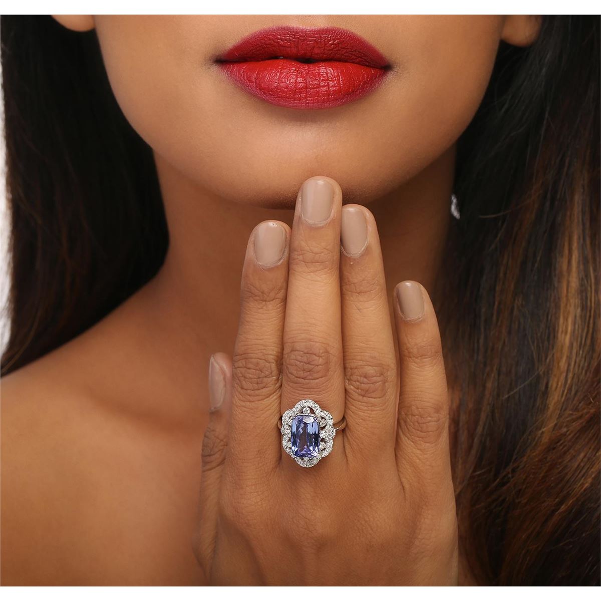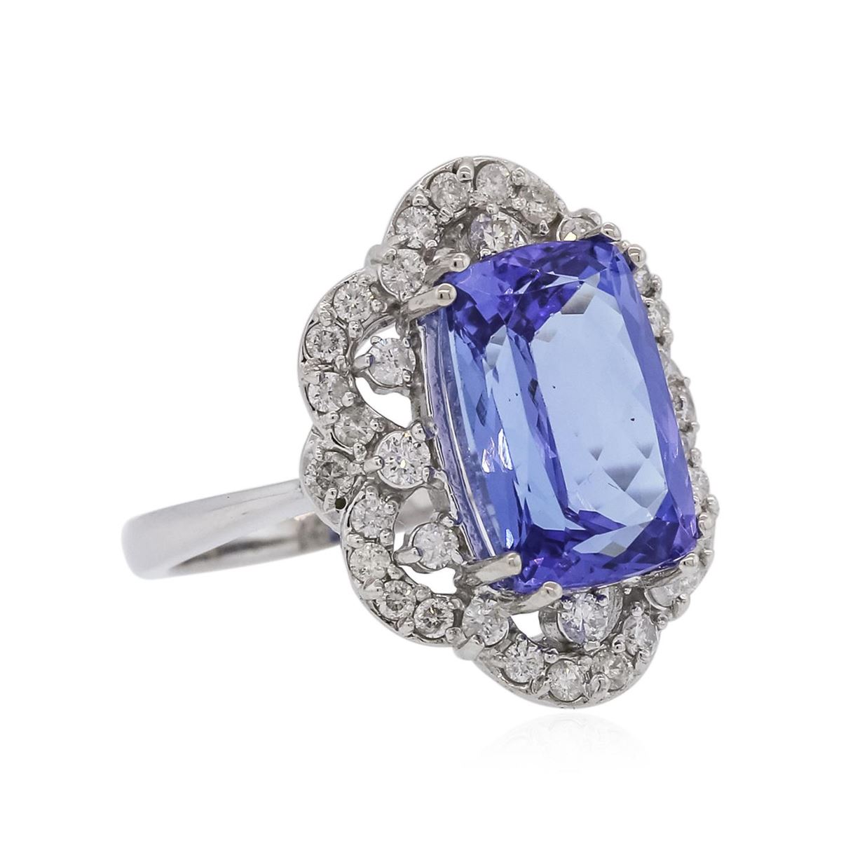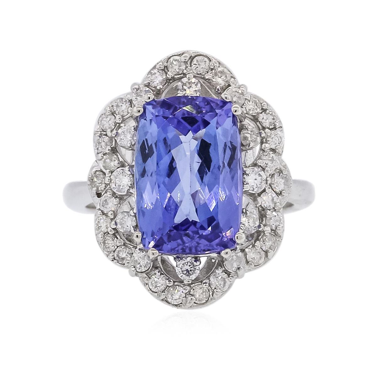 One electronically tested 14KT white gold ladies combination cast & assembled ring with a bright polish finish. Condition is new. Identified with markings of "14K". Containing: One prong set rectangular cushion modified brilliant cut natural tanzanite, measuring 12.15 x 8.30 x 6.30mm, approximate weight of 5.00ct., clarity is eye clean, type I, medium light, very slightly grayish, violet color, (GIA V 4/3), cut is good. Thirty-Eight prong set round brilliant cut diamonds, measuring 1.80 - 1.40 x 0.96mm (depth est.) approximate total weight of 38 Stones = 0.57ct. Clarity: SI-2 to I-2. Color: H - I, Cut is Good. Colored gemstones are presumed to have been subjected to commonly used enhancement processes. All diamonds and colored gemstones are graded in the mounting, unless otherwise stated. Total Weight of Colored Stones 5.00ct. Total Weight of Diamonds 0.57ct. Total Weight of Ring 6.20 grams. GGL Appraised at $9,775.00.