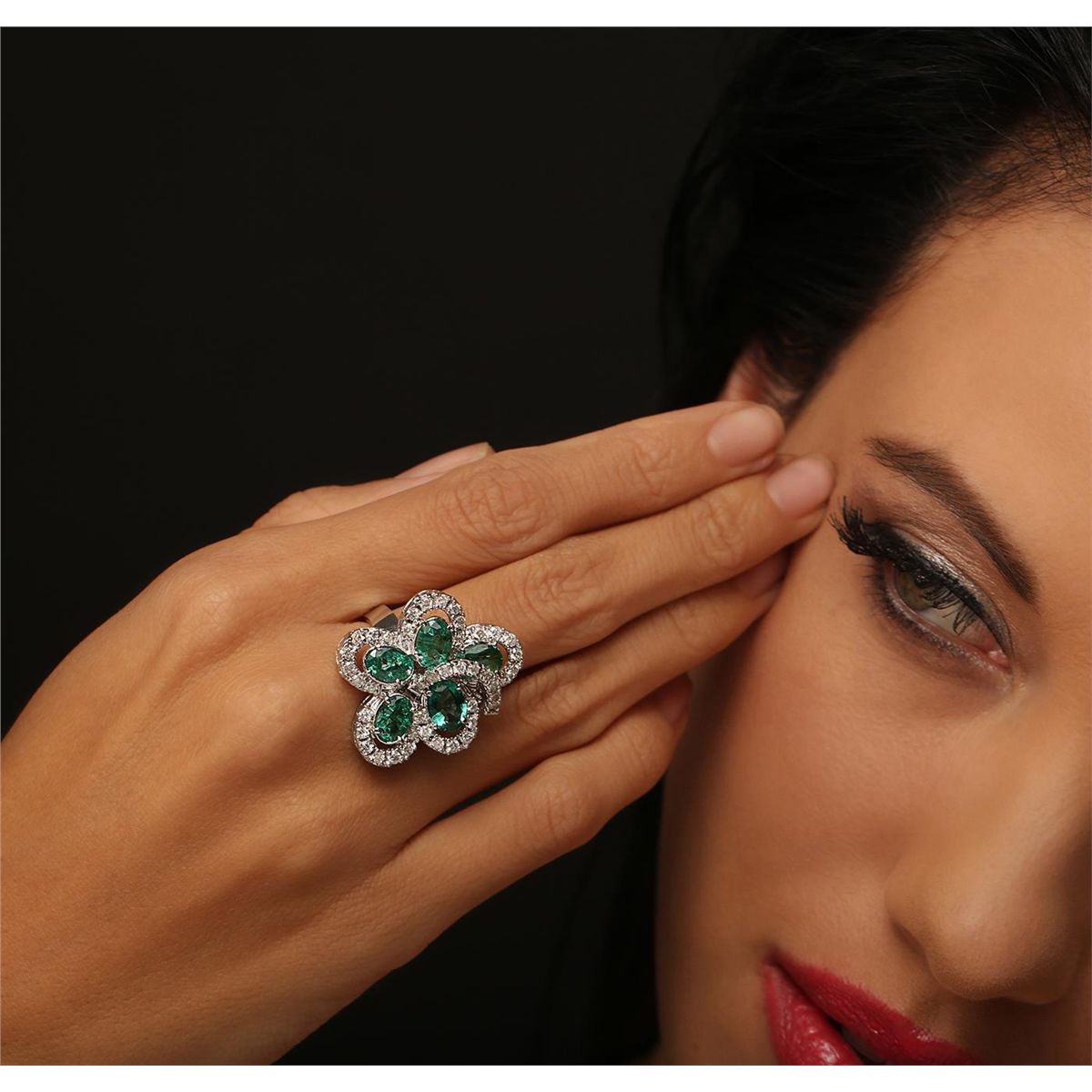 One electronically tested 14KT white gold Ladies combination cast & assembled ring with a bright polish finish. Condition is very good. Identified with markings of "14K". Containing: Five prong set oval modified brilliant cut natural emeralds, measuring 7.84 x 5.94 x 3.86mm, approximate. Total Weight of 5.00ct., clarity is moderately included, type III, medium light, very slightly grayish, bluish green color, (GIA bG 4/3), cut is good. Forty-Three prong set round brilliant cut diamonds, measuring 1.80 - 1.80 x 1.08mm (depth est.) approximate. Total Weight of 43 Stones = 0.92ct. Clarity: SI-2 to I-2. Color: I - J, Cut is Good. Colored gemstones are presumed to have been subjected to commonly used enhancement processes. All diamonds and colored gemstones are graded in the mounting, unless otherwise stated. Total Weight of Colored Stones 5.00ct. Total Weight of Diamonds 0.92ct. Total Weight of Ring 12.30 grams. GGL Appraised at $8,370.00.
