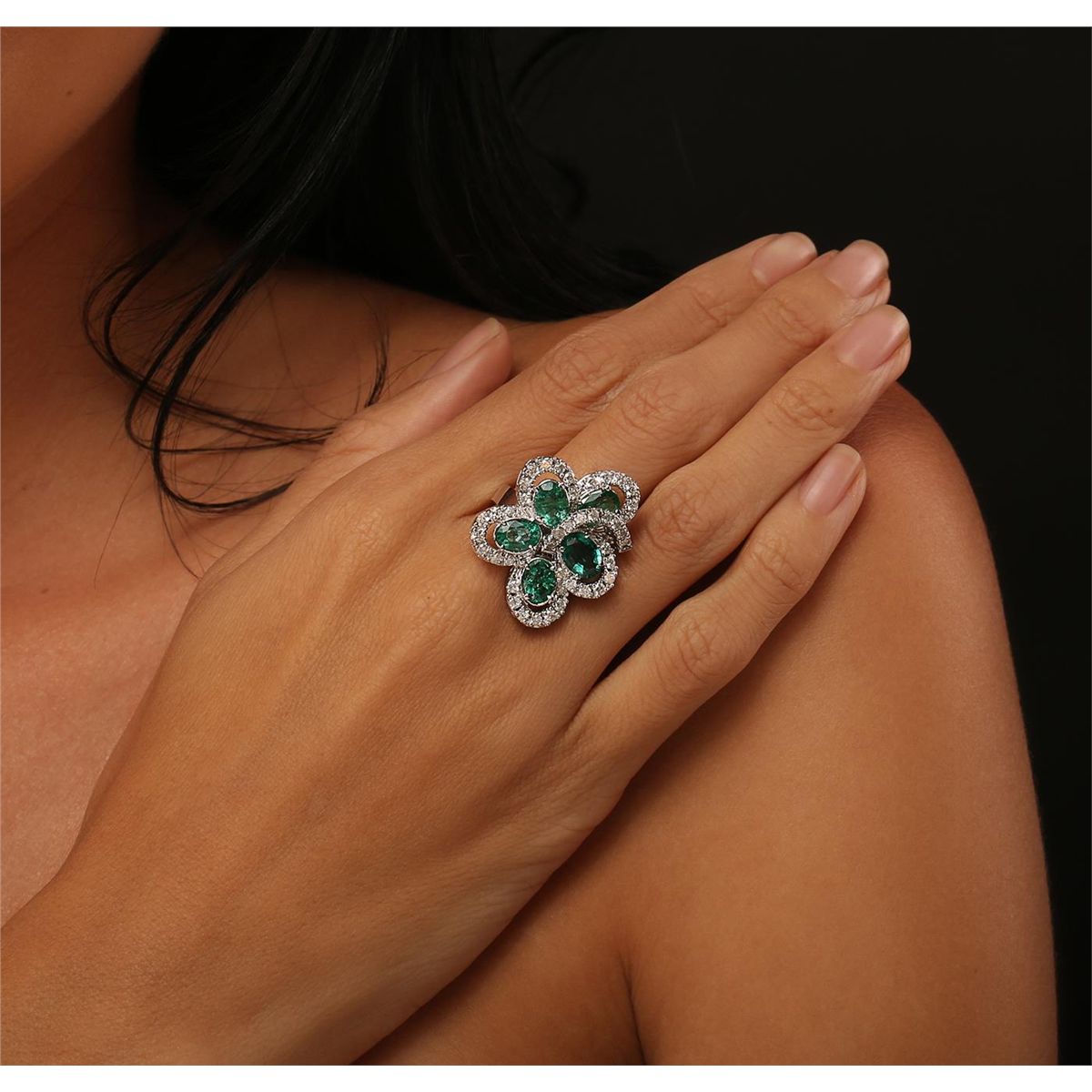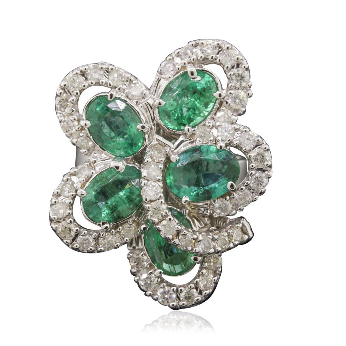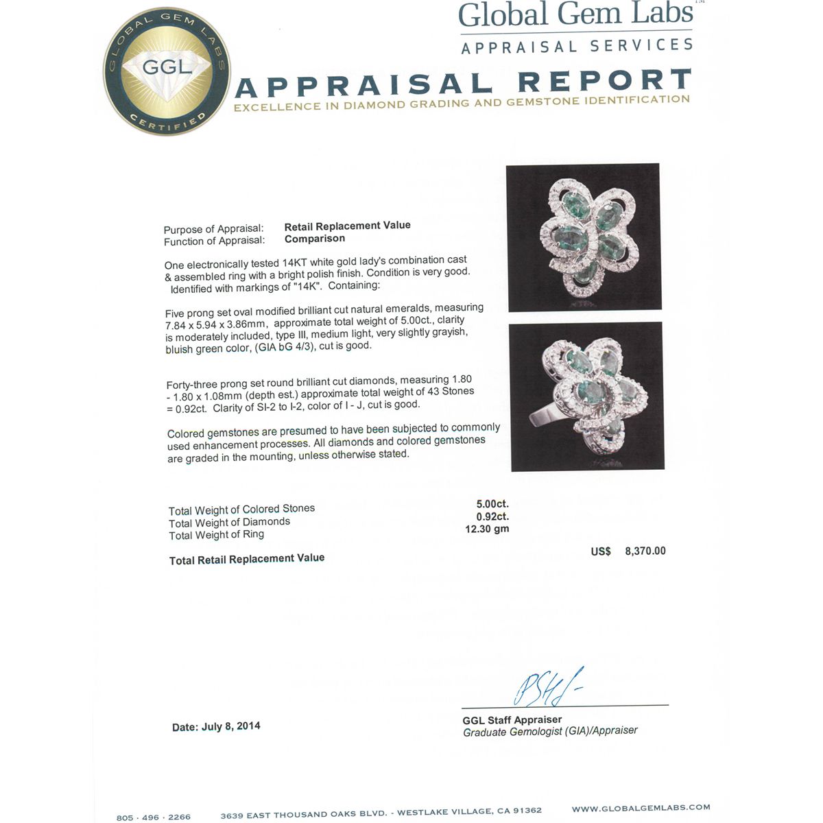 One electronically tested 14KT white gold Ladies combination cast & assembled ring with a bright polish finish. Condition is very good. Identified with markings of "14K". Containing: Five prong set oval modified brilliant cut natural emeralds, measuring 7.84 x 5.94 x 3.86mm, approximate. Total Weight of 5.00ct., clarity is moderately included, type III, medium light, very slightly grayish, bluish green color, (GIA bG 4/3), cut is good. Forty-Three prong set round brilliant cut diamonds, measuring 1.80 - 1.80 x 1.08mm (depth est.) approximate. Total Weight of 43 Stones = 0.92ct. Clarity: SI-2 to I-2. Color: I - J, Cut is Good. Colored gemstones are presumed to have been subjected to commonly used enhancement processes. All diamonds and colored gemstones are graded in the mounting, unless otherwise stated. Total Weight of Colored Stones 5.00ct. Total Weight of Diamonds 0.92ct. Total Weight of Ring 12.30 grams. GGL Appraised at $8,370.00.