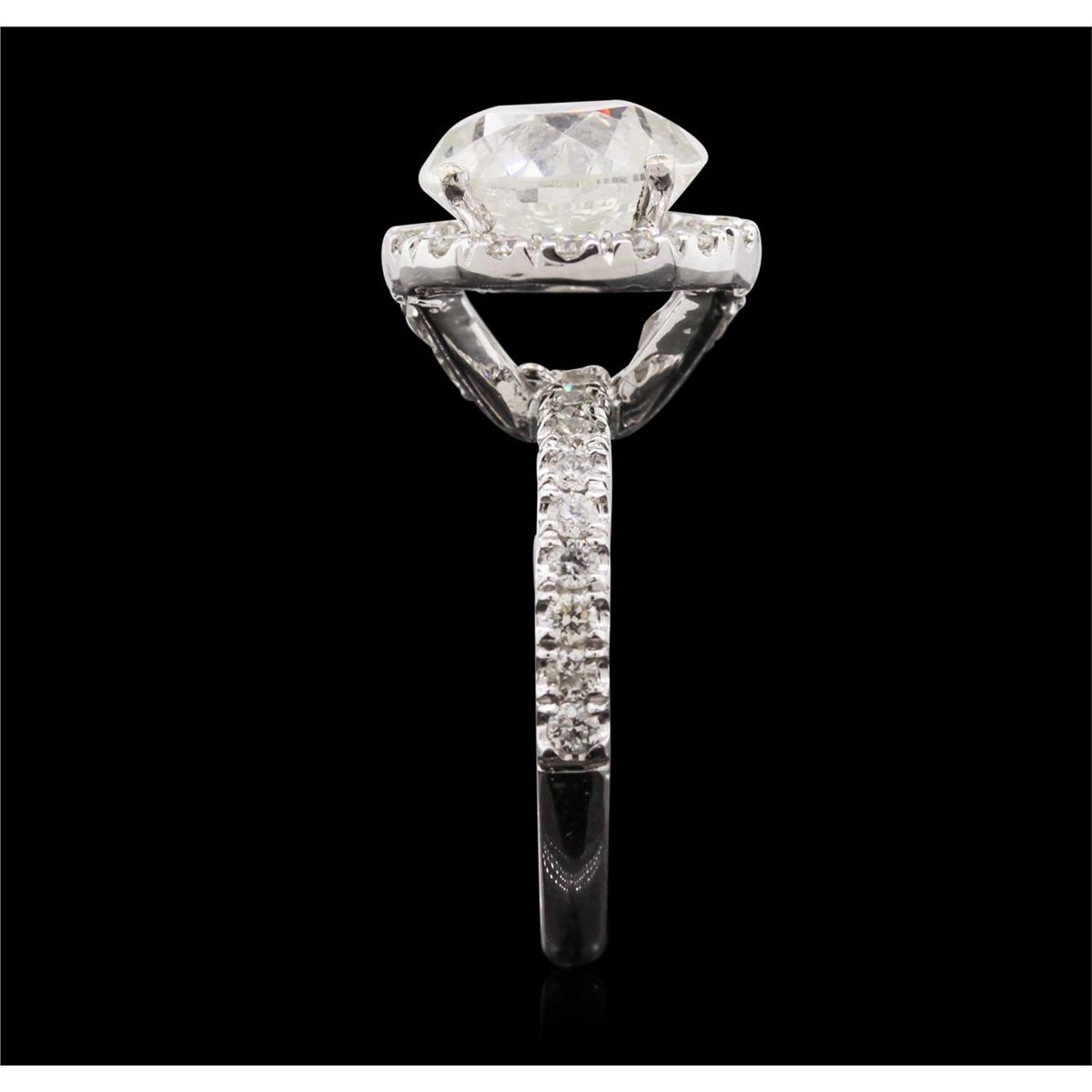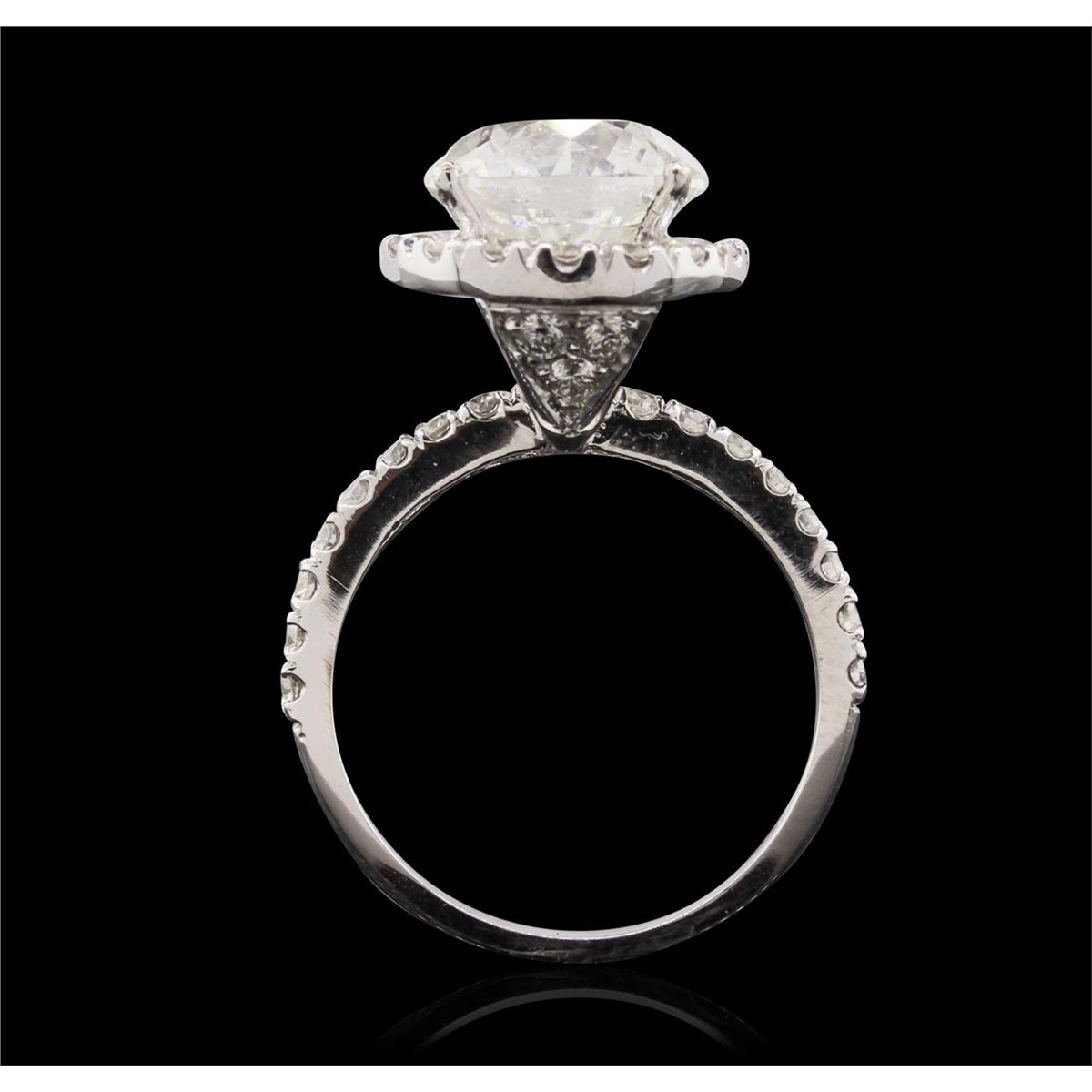 One electronically tested 14KT white gold ladies cast diamond unity ring with a bright polish finish. Condition is new, good workmanship. The featured diamond is set within a diamond bezel supported by a diamond set under gallery and diamond set shoulders, completed by a two millimeter wide band. Identified with markings of "K14". Containing: One prong set round brilliant cut diamond, measuring 10.62 - 10.52 x 6.96mm exact weight 5.02ct. EGL Report attached. Graded loose prior to setting in the EGL Laboratory Report #EGL3405563127. Clarity: SI-2. Color: F Depth 65.8%. Table 54.0%. Pavil. Depth%. 42.0%. Forty prong & bead set round brilliant cut diamonds, measuring 2.00 - 1.90 x 1.17mm (depth est.) approximate. Total Weight of 40 Stones = 1.07ct. Graded in the setting. Clarity: SI-1 to SI-2. Color: G - I. Total Weight of Diamonds 6.09ct. Total Weight of Ring 6.59 grams. AIGAppraised at $348,405.00.