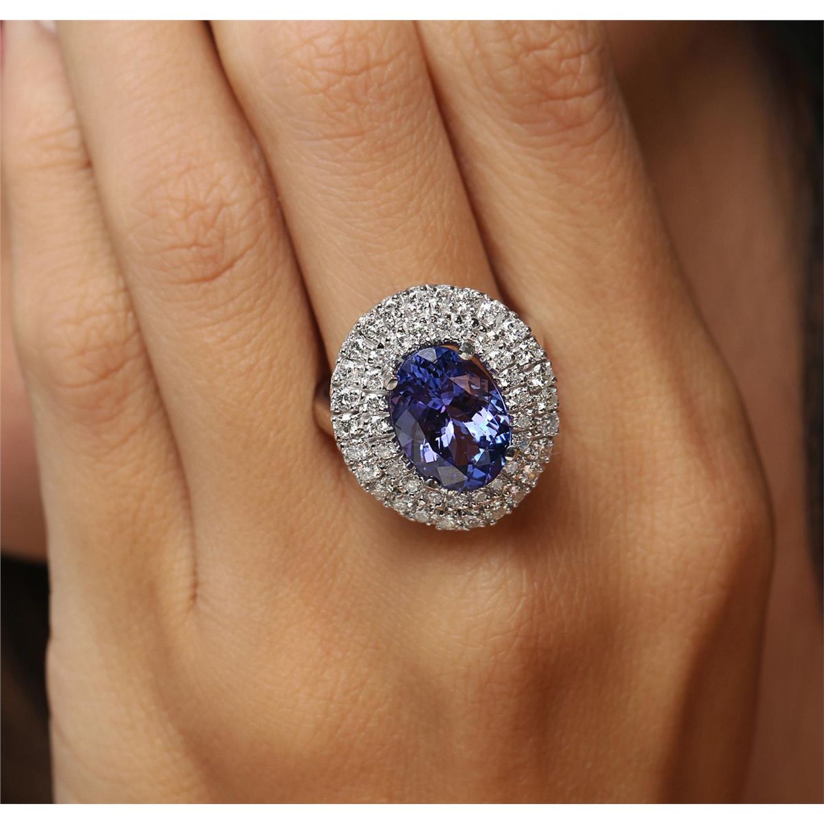 One electronically tested 14KT white gold Ladies combination cast & assembled ring with a bright polish finish. Condition is new. Identified with markings of "K14". Containing: One prong set oval modified brilliant cut natural tanzanite, measuring 12.95 x 9.30 x 6.05mm, approximate total weight of 5.02ct., clarity is eye clean, type I, medium light, moderately strong, violetish blue color, (GIA vB 4/4), cut is good. Forty-Eight prong set round brilliant cut diamonds, measuring 1.90 - 1.40 x 0.99mm (depth est.) approximate total weight of 48 Stones = 1.00ct. Clarity: I-1 to I-2. Color: I - J, Cut is Good. Colored gemstones are presumed to have been subjected to commonly used enhancement processes. All diamonds and colored gemstones are graded in the mounting, unless otherwise stated. Total Weight of Colored Stones 5.02ct. Total Weight of Diamonds 1.00ct. Total Weight of Ring 7.60 grams. GGL Appraised at $10,695.00.