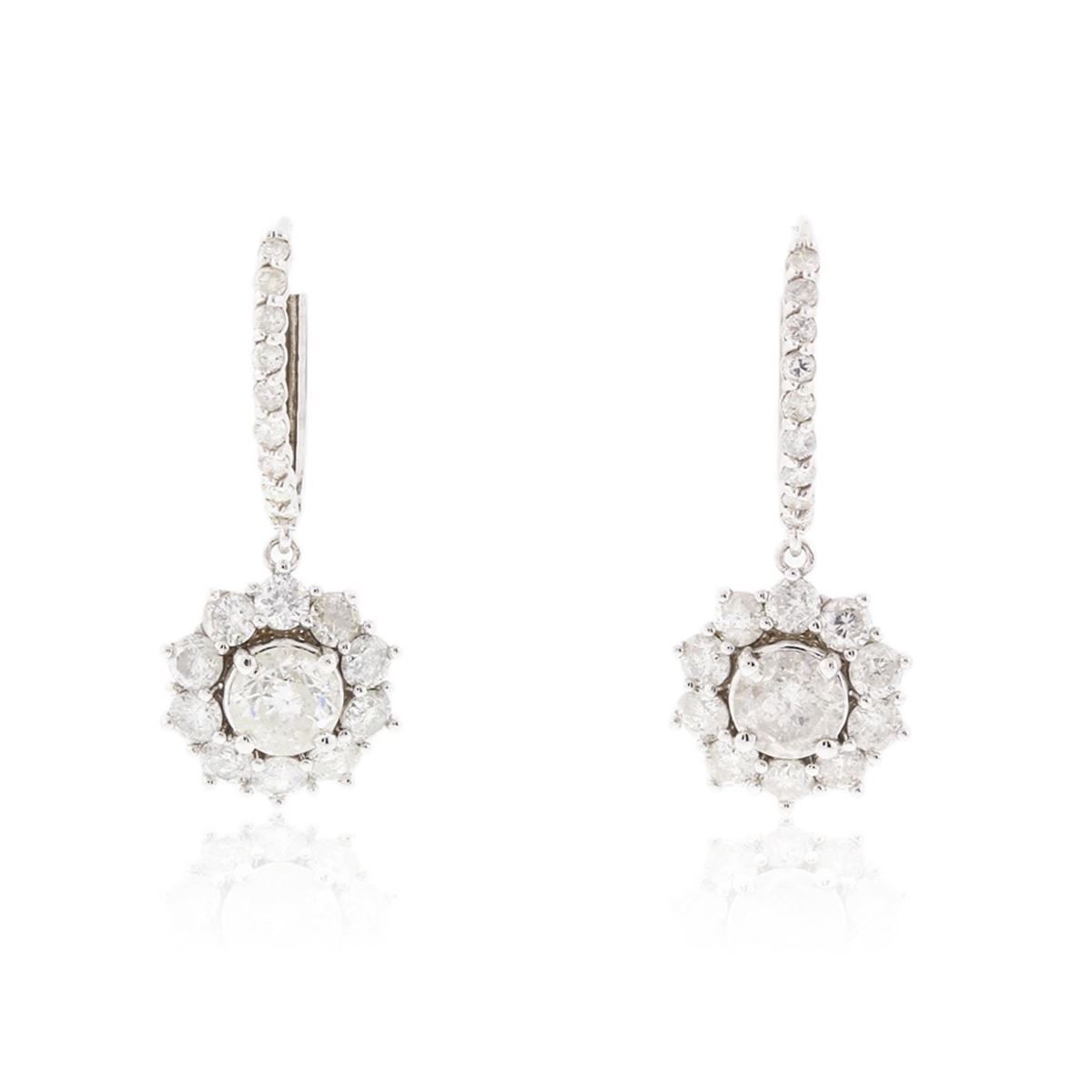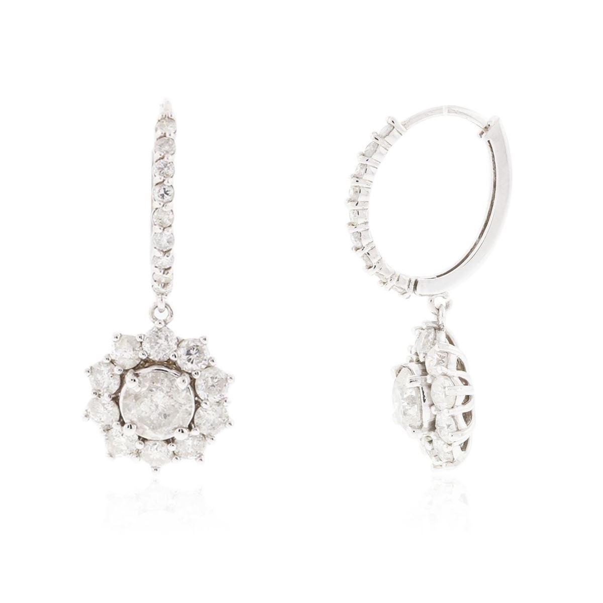 One pair electronically tested 14KT white gold ladies cast & assembled diamond earrings with hinged, snap locking posts. Condition is new, good workmanship. Each earring features a diamond set within a diamond bezel dangle, completed by a diamond set huggie. Bright polish finish. Identified with markings of "14K". Containing: Two prong set round brilliant cut diamonds, measuring 6.10 - 6.00 x 4.70mm (depth est.) approximate. Total Weight of 2 Stones = 2.12ct. Clarity grade is an average for the pair. Graded in the setting. Clarity: I-2. Color: J - K Thirty-Eight prong set round brilliant cut diamonds approximate. Total Weight of 38 Stones = 2.92ct. Graded in the setting. Clarity: I-1 to I-2. Color: H - J. Total Weight of Diamonds 5.04ct. Total Weight of Earrings 6.65 grams. AIG Appraised at $22,615.00.