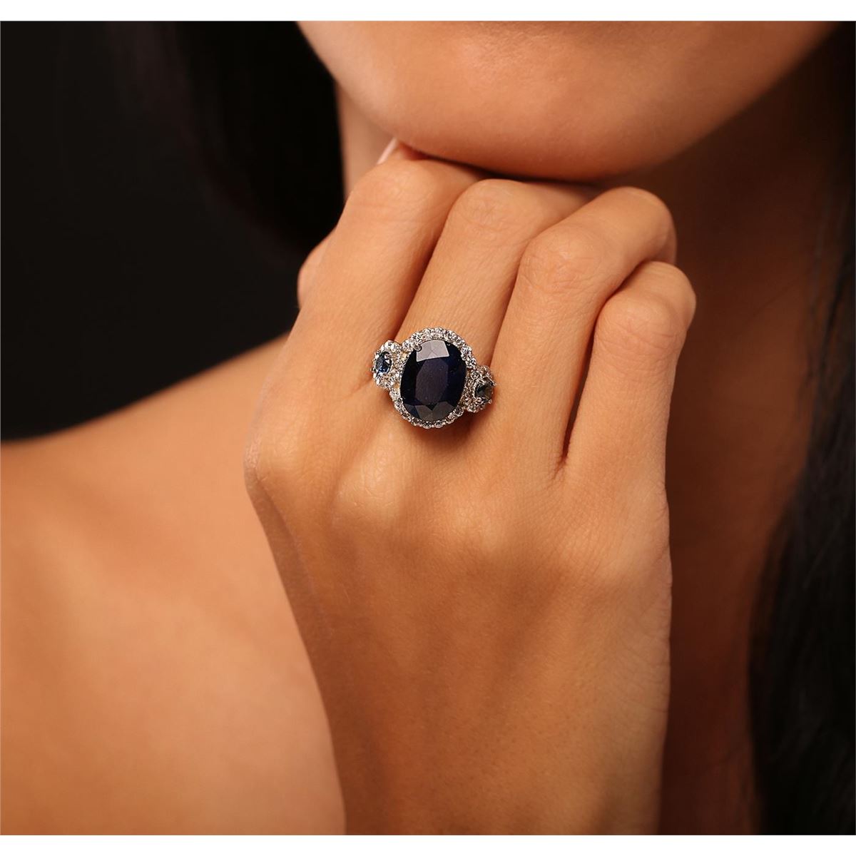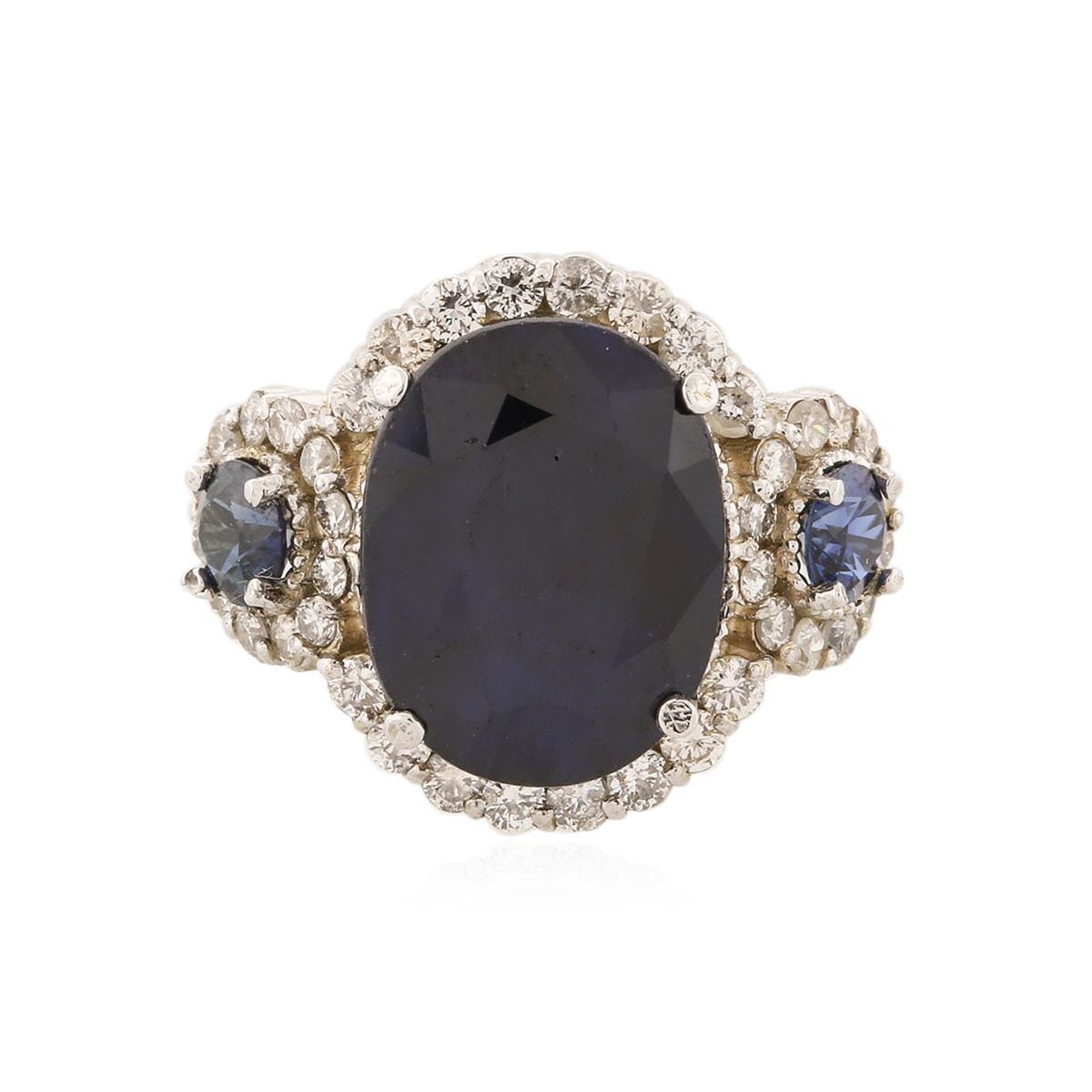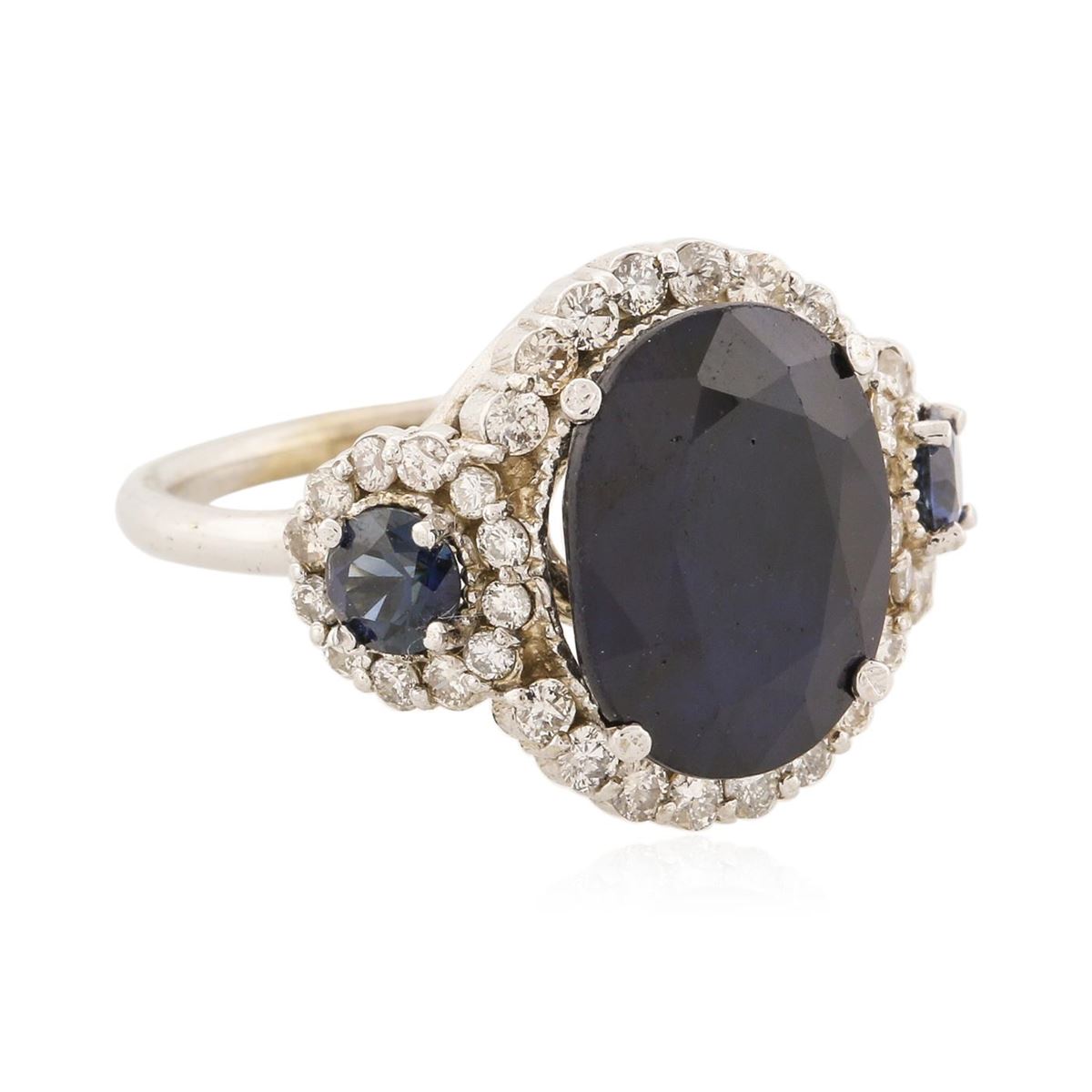 One electronically tested 14KT white gold Ladies combination cast & assembled ring with a bright polish finish. Condition is new. Containing: One prong set oval modified brilliant cut natural blue sapphire, measuring 12.66 x 10.30 x 4.10mm, approximate weight of 4.32ct., clarity is heavily included, type II, dark, moderately strong, blue color, (GIA B 7/4), cut is good. Thirty-Six prong set round brilliant cut diamonds, measuring 1.50 - 1.50 x 0.90mm (depth est.) approximate. Total Weight of 36 Stones = 0.44ct. Clarity: I-1 to I-3. Color: J - K, Cut is Good. Two prong set round modified brilliant cut natural blue sapphires, measuring 4.10 - 4.10 x 2.67 mm, approximate. Total Weight of 0.72ct., clarity is eye clean, type II, medium, moderately strong, blue color, (GIA B 5/4), cut is very good. Colored gemstones are presumed to have been subjected to commonly used color/clarity enhancement processes. Total Weight of Colored Stones 5.04ct. Total Weight of Diamonds 0.44ct. Total Weight of Ring 6.90 grams. GGL Appraised at $5,230.00.