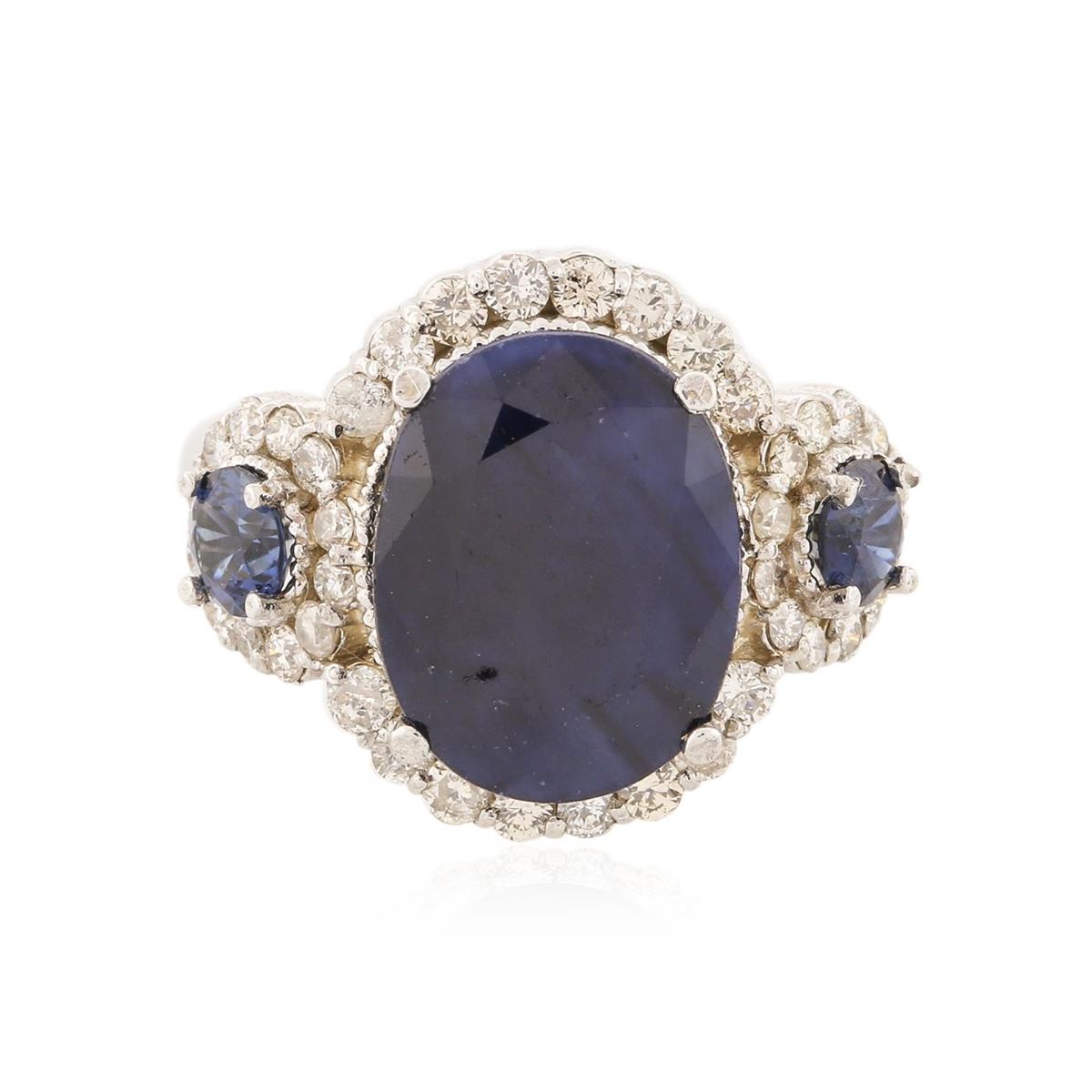 One electronically tested 14KT white gold Ladies combination cast & assembled ring with a bright polish finish. Condition is new. Containing: One prong set oval modified brilliant cut natural blue sapphire, measuring 12.66 x 10.30 x 4.10mm, approximate weight of 4.32ct., clarity is heavily included, type II, dark, moderately strong, blue color, (GIA B 7/4), cut is good. Two prong set round modified brilliant cut natural blue sapphires, measuring 4.10 - 4.10 x 2.67 mm, approximate. Total Weight of 0.72ct., clarity is eye clean, type II, medium, moderately strong, blue color, (GIA B 5/4), cut is very good. Colored gemstones are presumed to have been subjected to commonly used color/clarity enhancement processes. Thirty-Six prong set round brilliant cut diamonds, measuring 1.50 - 1.50 x 0.90mm (depth est.) approximate. Total Weight of 36 Stones = 0.44ct. Clarity: I-1 to I-3. Color: J - K, Cut is Good. Total Weight of Colored Stones 5.04ct. Total Weight of Diamonds 0.44ct. Total Weight of Ring 6.50 grams. GGL Appraised at $5,190.00.