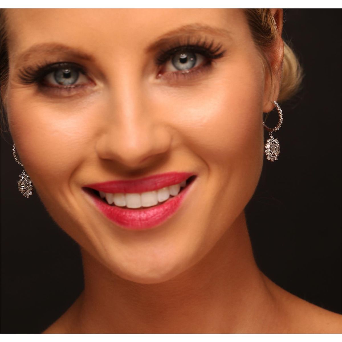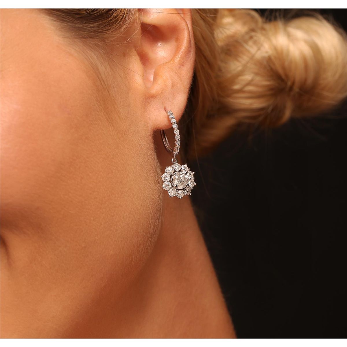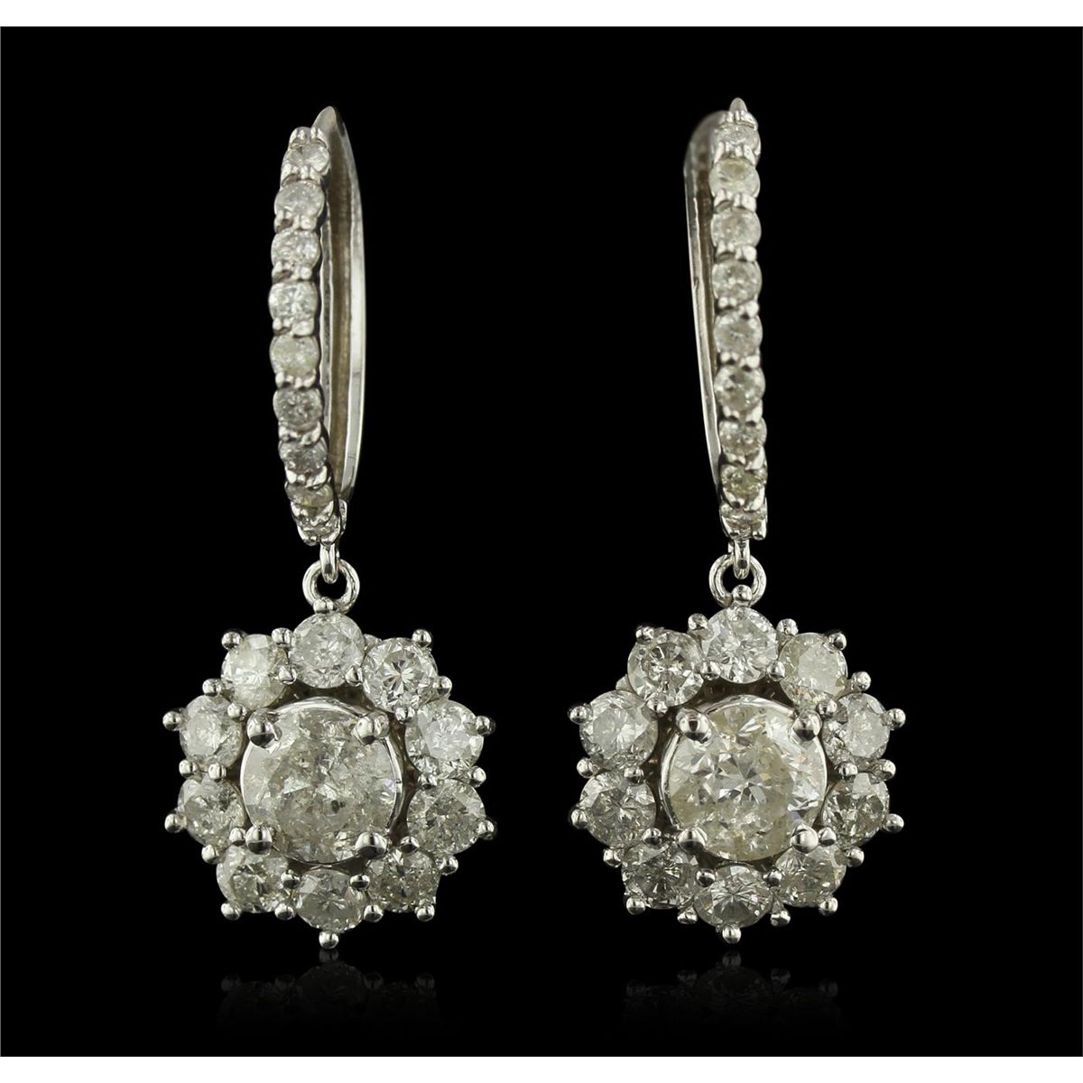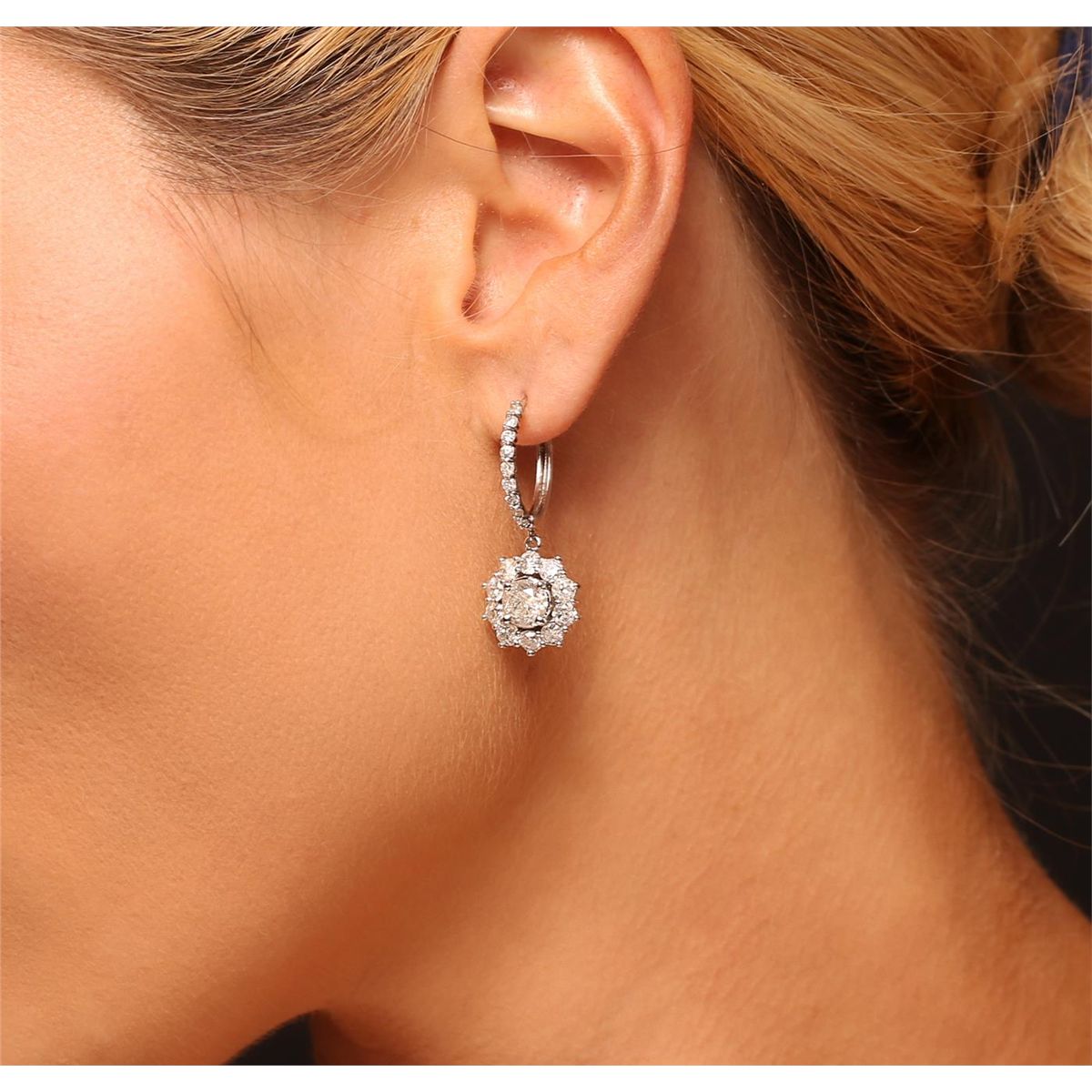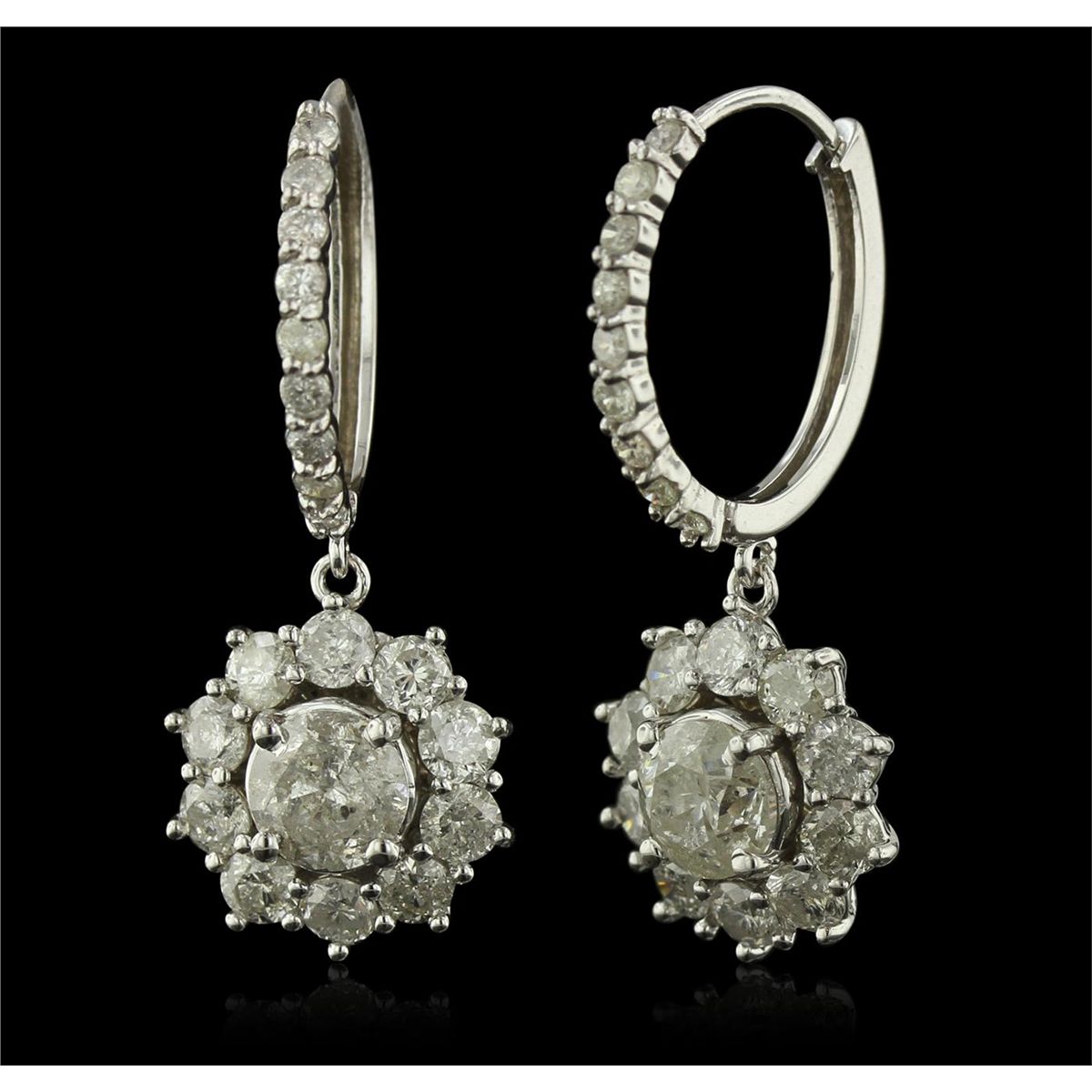One pair electronically tested 14KT white gold ladies cast & assembled diamond earrings with hinged, snap locking posts. Condition is new, good workmanship. Each earring features a diamond set within a diamond bezel dangle, completed by a diamond set huggie. Bright polish finish. Identified with markings of "14K". Containing: Two prong set round brilliant cut diamonds, measuring 6.10 - 6.00 x 4.70mm (depth est.) approximate. Total Weight of 2 Stones = 2.12ct. Clarity grade is an average for the pair. Graded in the setting. Clarity: I-2. Color: J - K Thirty-Eight prong set round brilliant cut diamonds approximate. Total Weight of 38 Stones = 2.92ct. Graded in the setting. Clarity: I-1 to I-2. Color: H - J. Total Weight of Diamonds 5.04ct. Total Weight of Earrings 6.65 grams. AIG Appraised at $22,615.00.