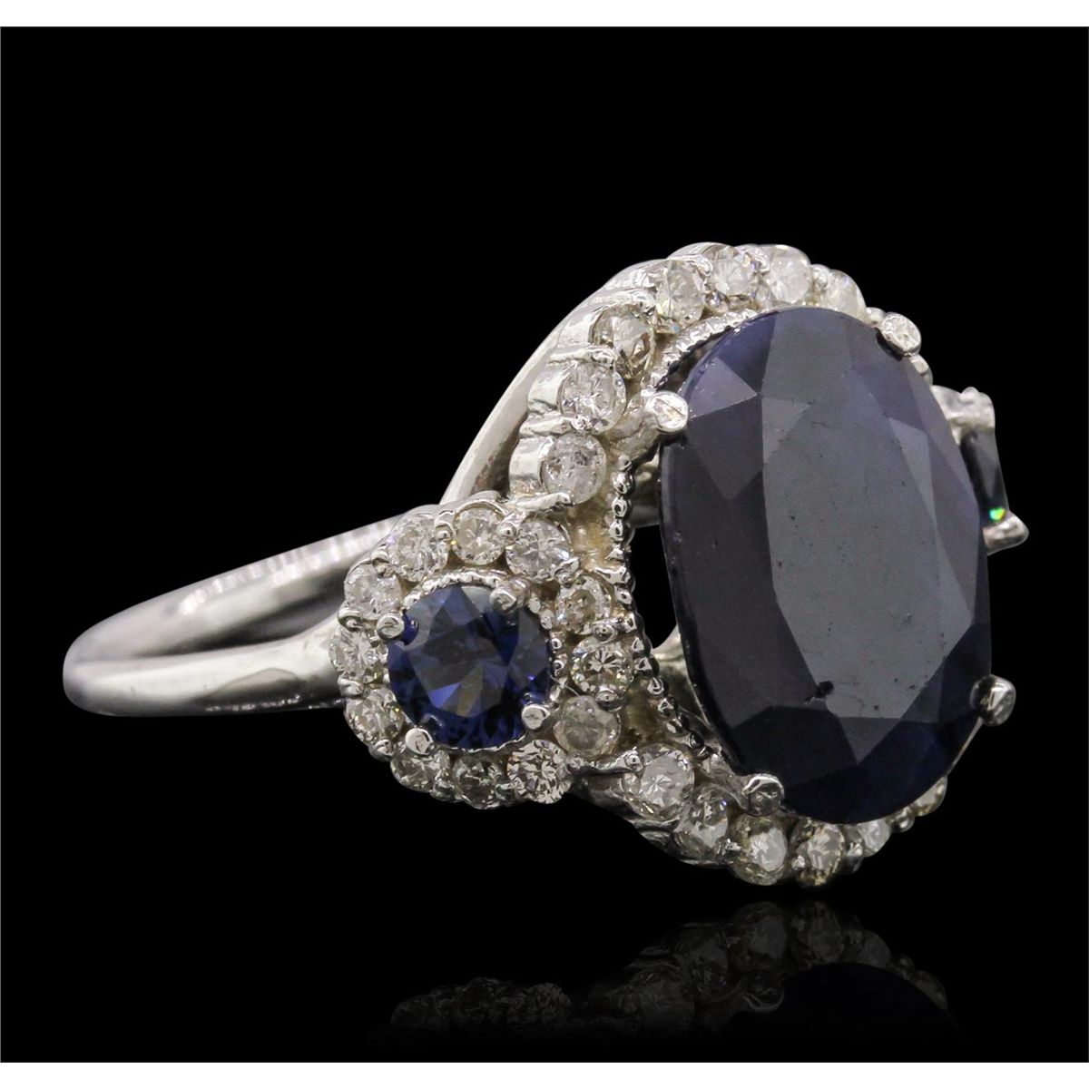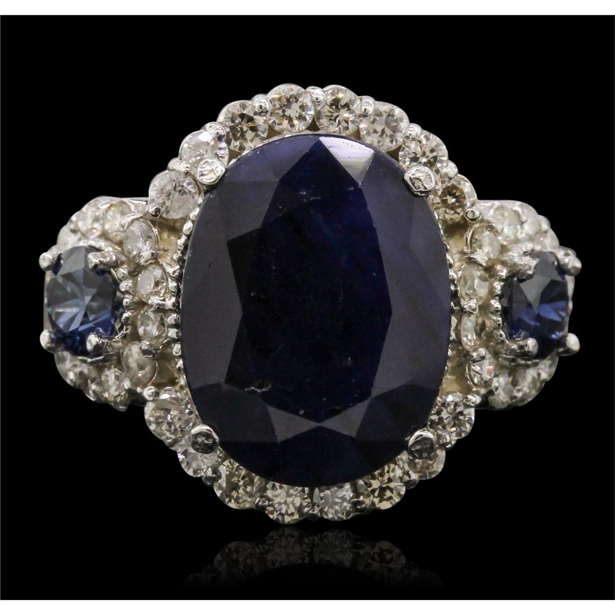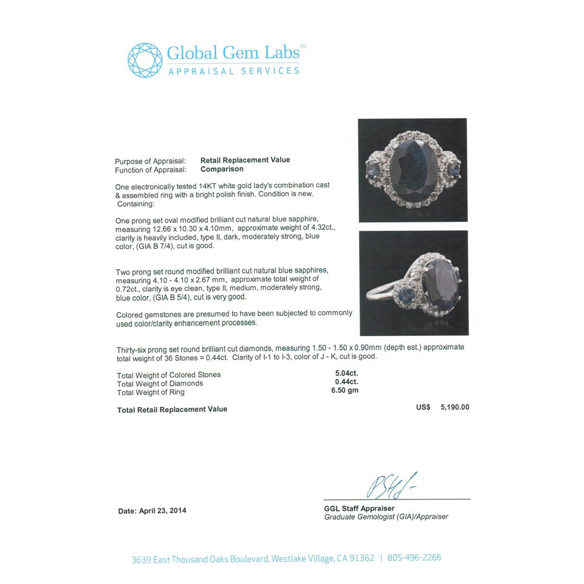 One electronically tested 14KT white gold Ladies combination cast & assembled ring with a bright polish finish. Condition is new. Containing: One prong set oval modified brilliant cut natural blue sapphire, measuring 12.66 x 10.30 x 4.10mm, approximate weight of 4.32ct., clarity is heavily included, type II, dark, moderately strong, blue color, (GIA B 7/4), cut is good. Two prong set round modified brilliant cut natural blue sapphires, measuring 4.10 - 4.10 x 2.67 mm, approximate. Total Weight of 0.72ct., clarity is eye clean, type II, medium, moderately strong, blue color, (GIA B 5/4), cut is very good. Colored gemstones are presumed to have been subjected to commonly used color/clarity enhancement processes. Thirty-Six prong set round brilliant cut diamonds, measuring 1.50 - 1.50 x 0.90mm (depth est.) approximate. Total Weight of 36 Stones = 0.44ct. Clarity: I-1 to I-3. Color: J - K, Cut is Good. Total Weight of Colored Stones 5.04ct. Total Weight of Diamonds 0.44ct. Total Weight of Ring 6.50 grams. GGL Appraised at $5,190.00.