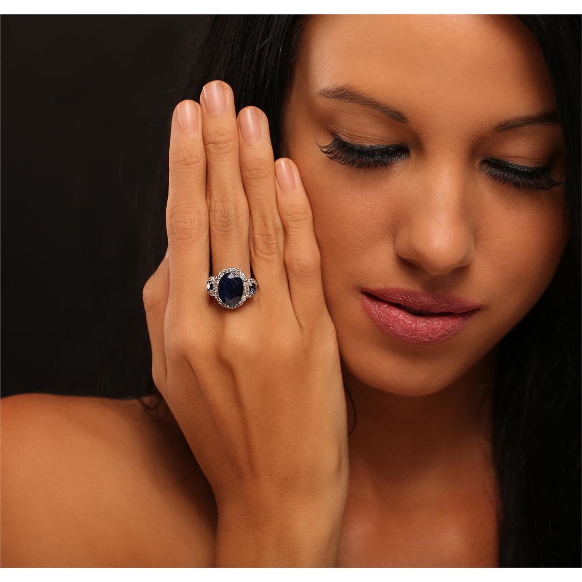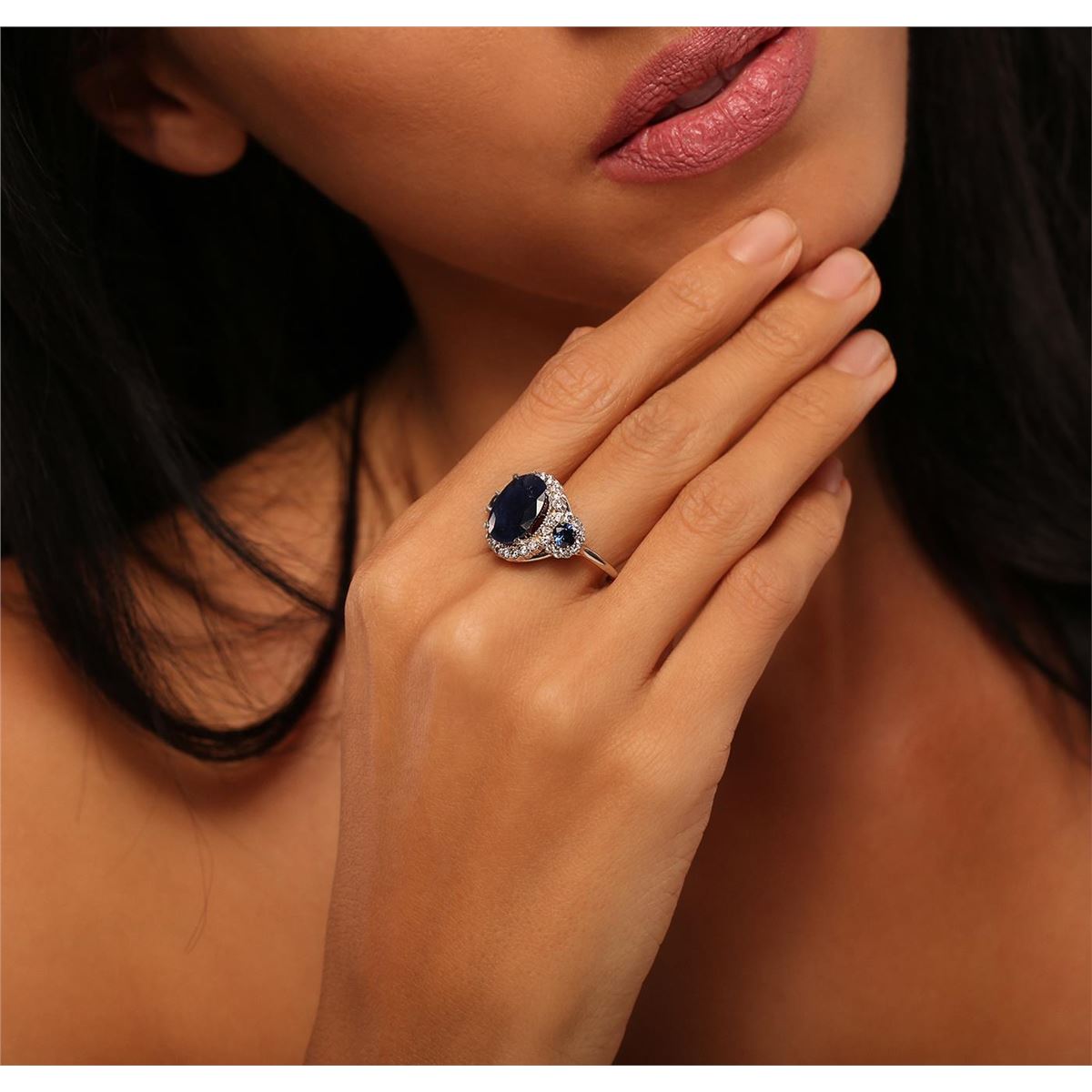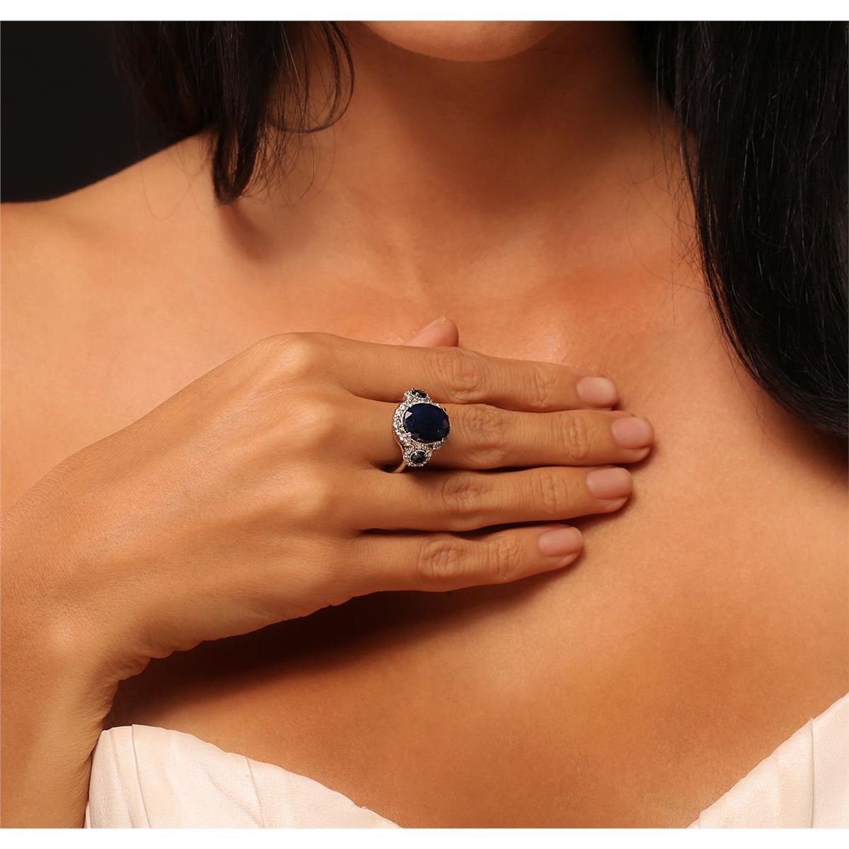 One electronically tested 14KT white gold Ladies combination cast & assembled ring with a bright polish finish. Condition is new. Containing: One prong set oval modified brilliant cut natural blue sapphire, measuring 12.66 x 10.30 x 4.10mm, approximate weight of 4.32ct., clarity is heavily included, type II, dark, moderately strong, blue color, (GIA B 7/4), cut is good. Two prong set round modified brilliant cut natural blue sapphires, measuring 4.10 - 4.10 x 2.67 mm, approximate. Total Weight of 0.72ct., clarity is eye clean, type II, medium, moderately strong, blue color, (GIA B 5/4), cut is very good. Colored gemstones are presumed to have been subjected to commonly used color/clarity enhancement processes. Thirty-Six prong set round brilliant cut diamonds, measuring 1.50 - 1.50 x 0.90mm (depth est.) approximate. Total Weight of 36 Stones = 0.44ct. Clarity: I-1 to I-3. Color: J - K, Cut is Good. Total Weight of Colored Stones 5.04ct. Total Weight of Diamonds 0.44ct. Total Weight of Ring 6.50 grams. GGL Appraised at $5,190.00.