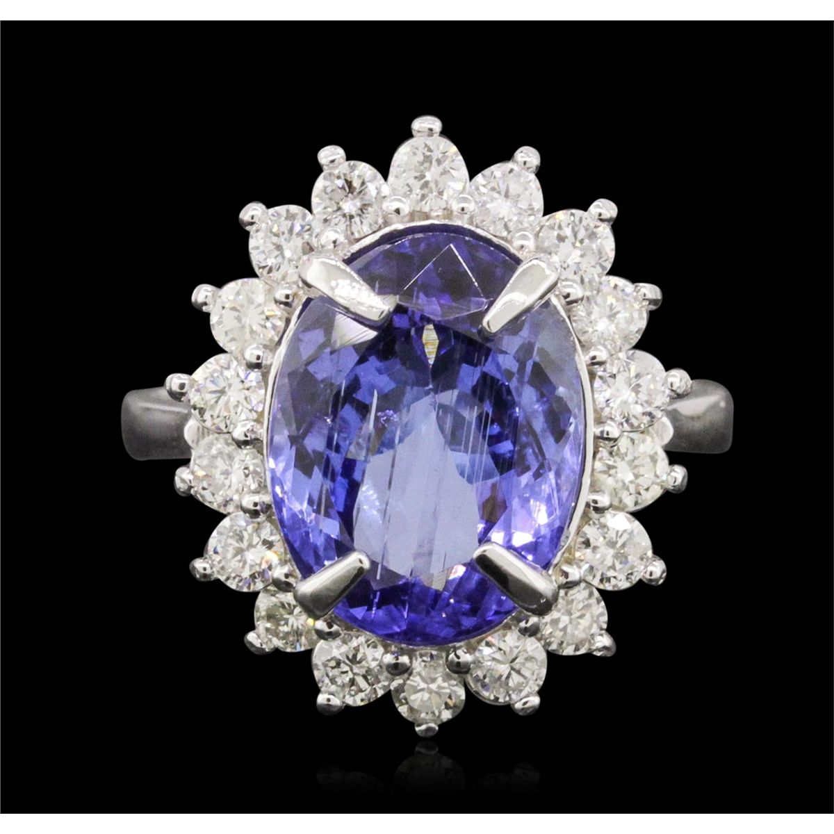 One electronically tested 14KT white gold ladies combination cast & assembled ring with a bright polish finish. Condition is new. Identified with markings of "K14". Containing: One prong set oval modified brilliant cut natural tanzanite, measuring 12.30 x 9.50 x 6.35mm, approximate weight of 5.05ct., clarity is eye clean, type I, medium light, moderately strong, bluish violet color, (GIA bV 4/4), cut is good. Eighteen prong set round brilliant cut diamonds, measuring 2.40 - 2.40 x 1.44mm (depth est.) approximate total weight of 18 Stones = 0.91ct. Clarity: SI-1 to SI-2. Color: J - K, Cut is Good. Colored gemstones are presumed to have been subjected to commonly used enhancement processes. All diamonds and colored gemstones are graded in the mounting, unless otherwise stated. Total Weight of Colored Stones 5.05ct. Total Weight of Diamonds 0.91ct. Total Weight of Ring 6.00 grams. GGL Appraised at $10,630.00.