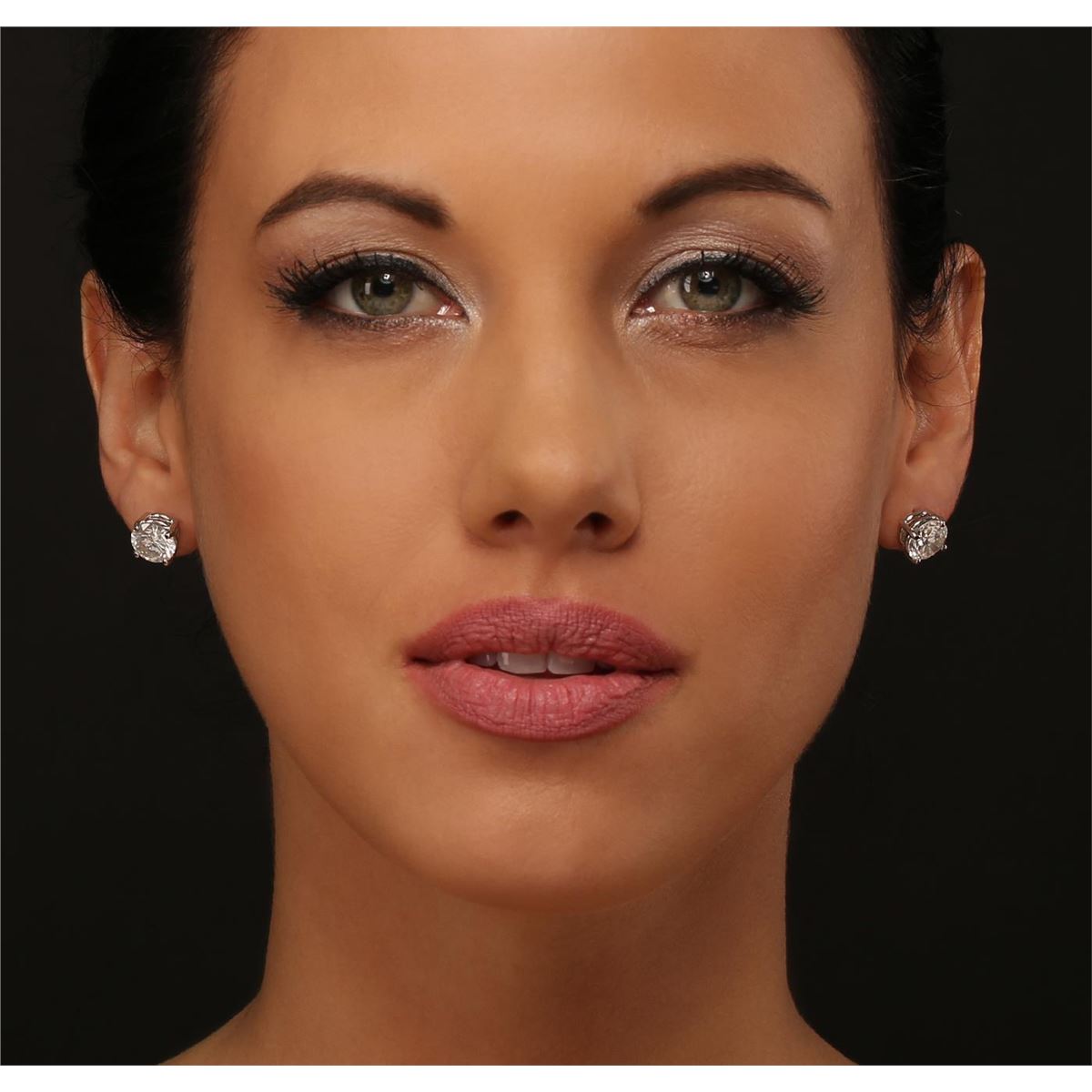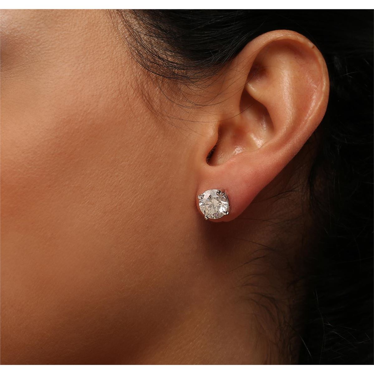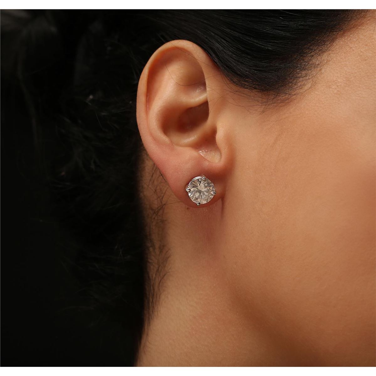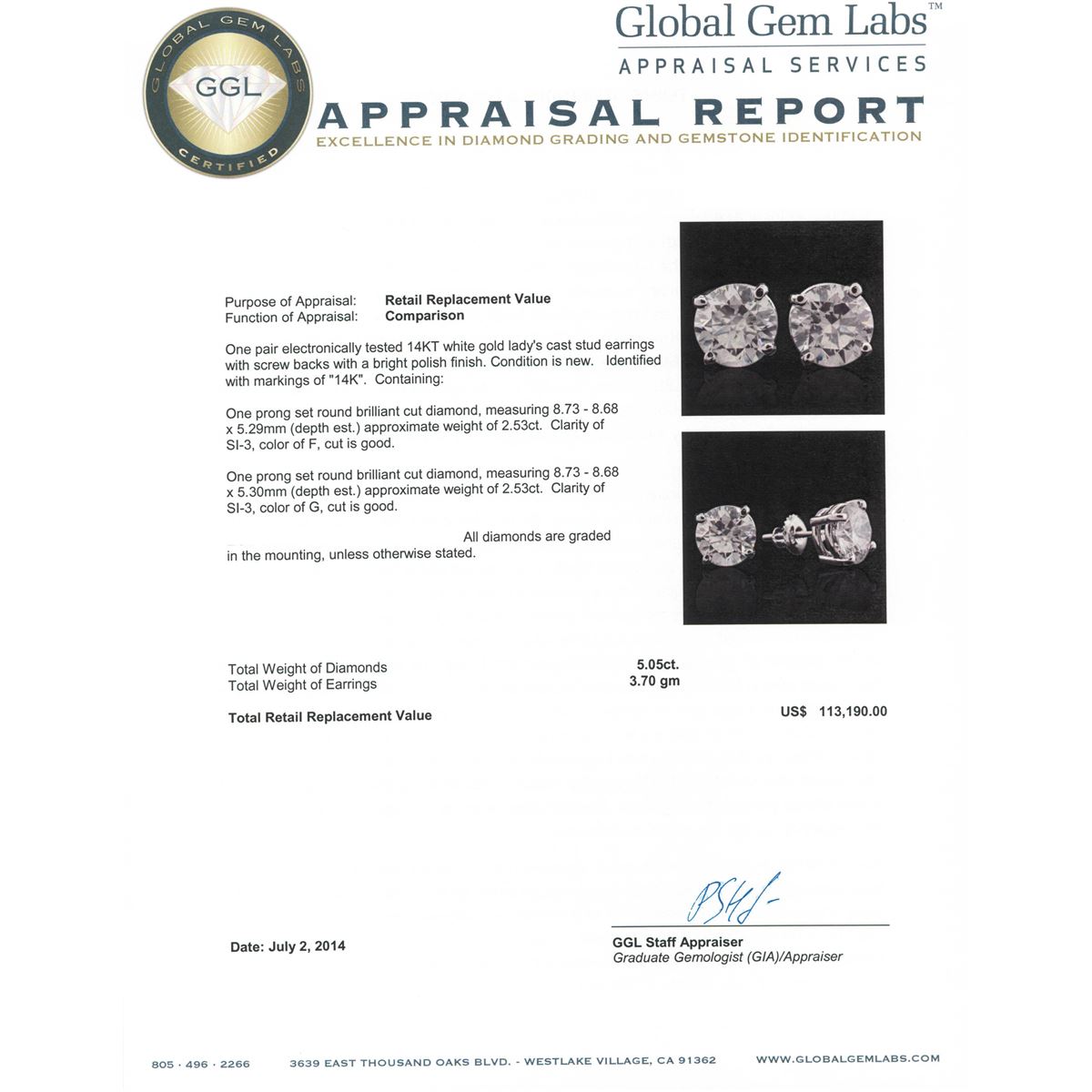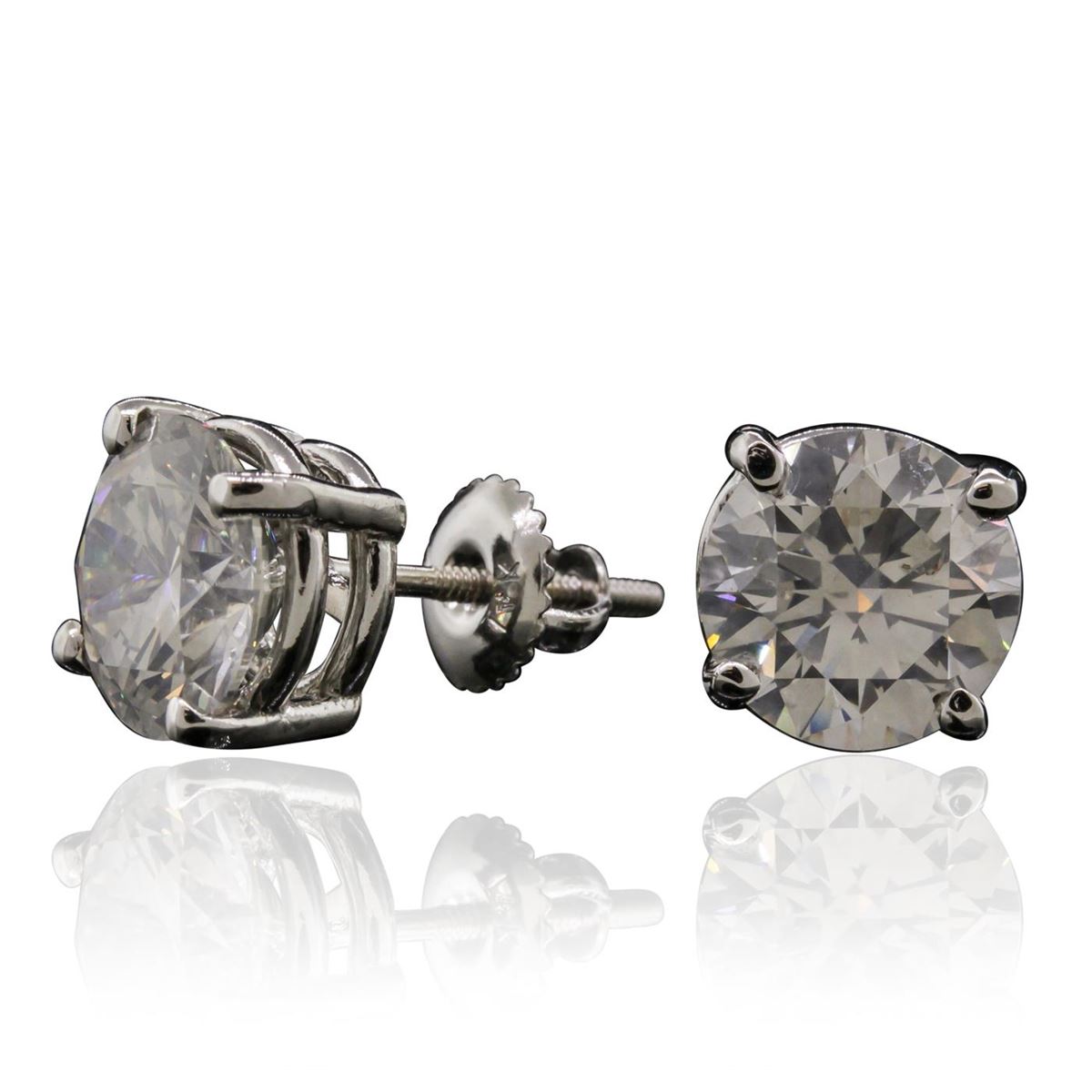 One pair electronically tested 14KT white gold Ladies cast stud earrings with screw backs with a bright polish finish. Condition is new. Identified with markings of "14K". Containing: One prong set round brilliant cut diamond, measuring 8.73 - 8.68 x 5.29mm (depth est.) approximate weight of 2.53ct. Clarity: SI-3. Color: F, Cut is Good. One prong set round brilliant cut diamond, measuring 8.73 - 8.68 x 5.30mm (depth est.) approximate weight of 2.53ct. Clarity: SI-3. Color: G, Cut is Good. EGL USA GEM ID# US 911348443D. All diamonds are graded in the mounting, unless otherwise stated. Total Weight of Diamonds 5.05ct. Total Weight of Earrings 3.70 grams. GGL Appraised at $113,190.00.