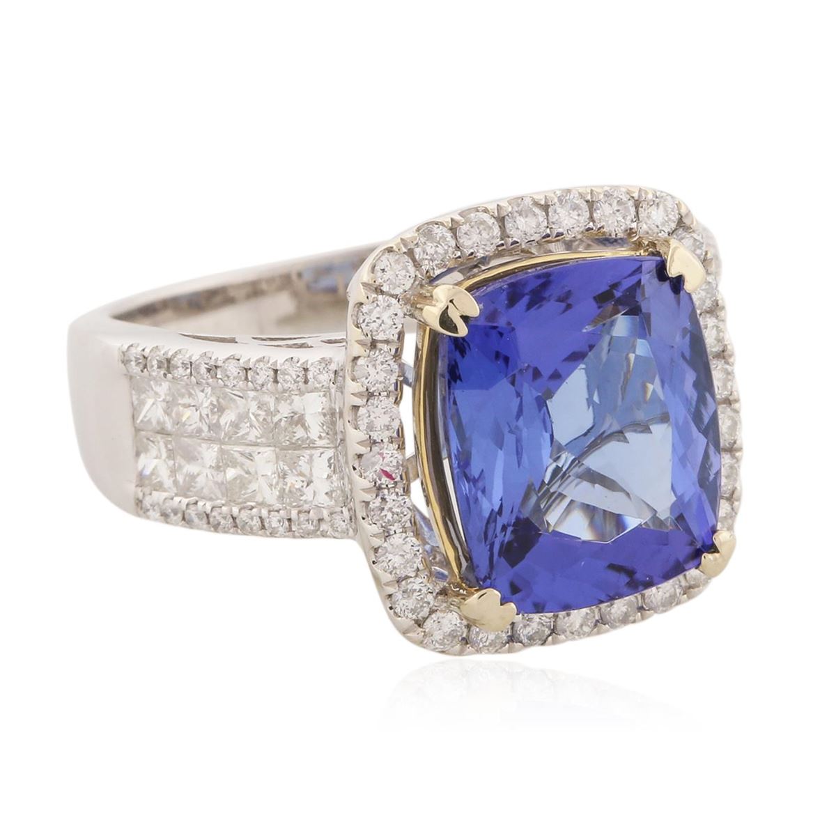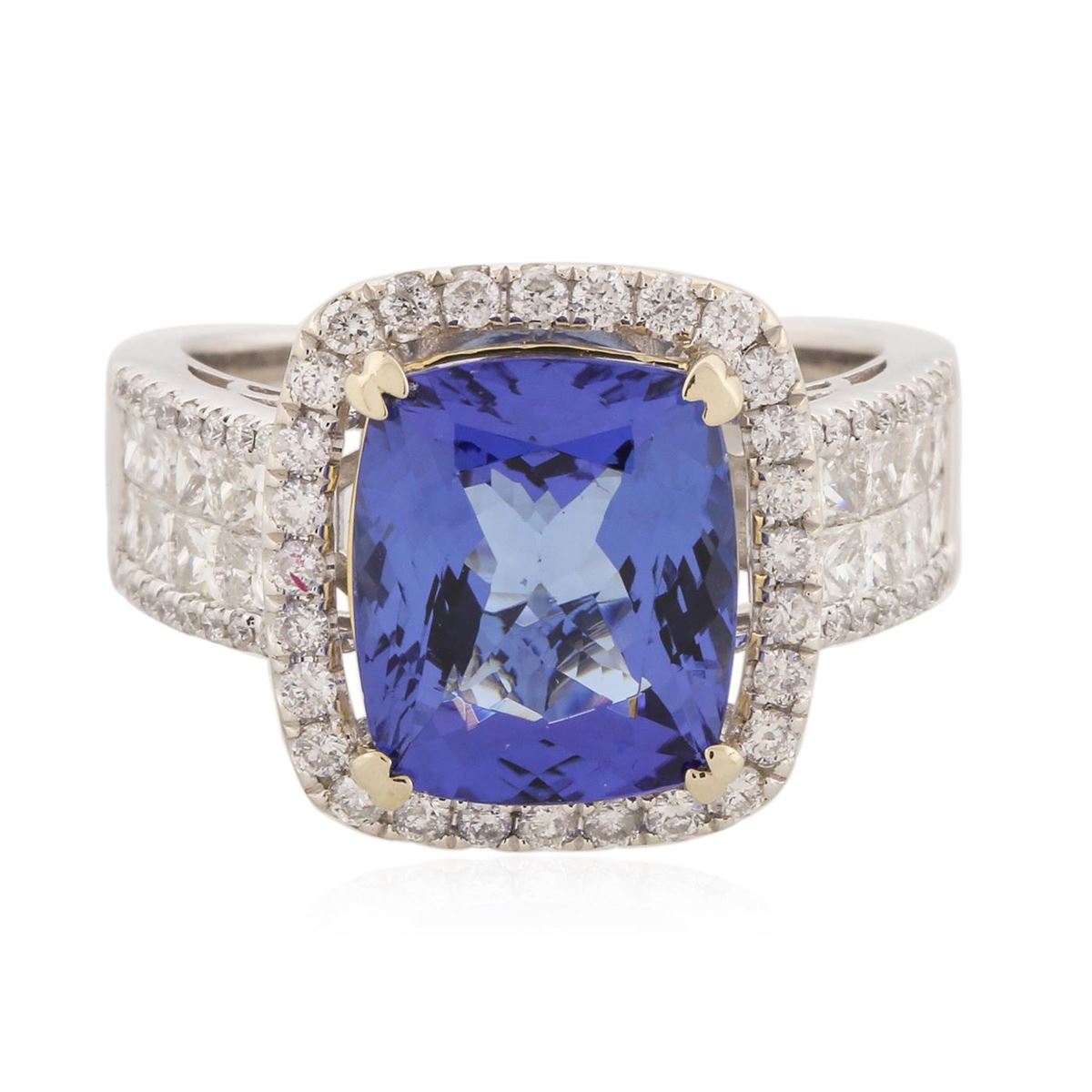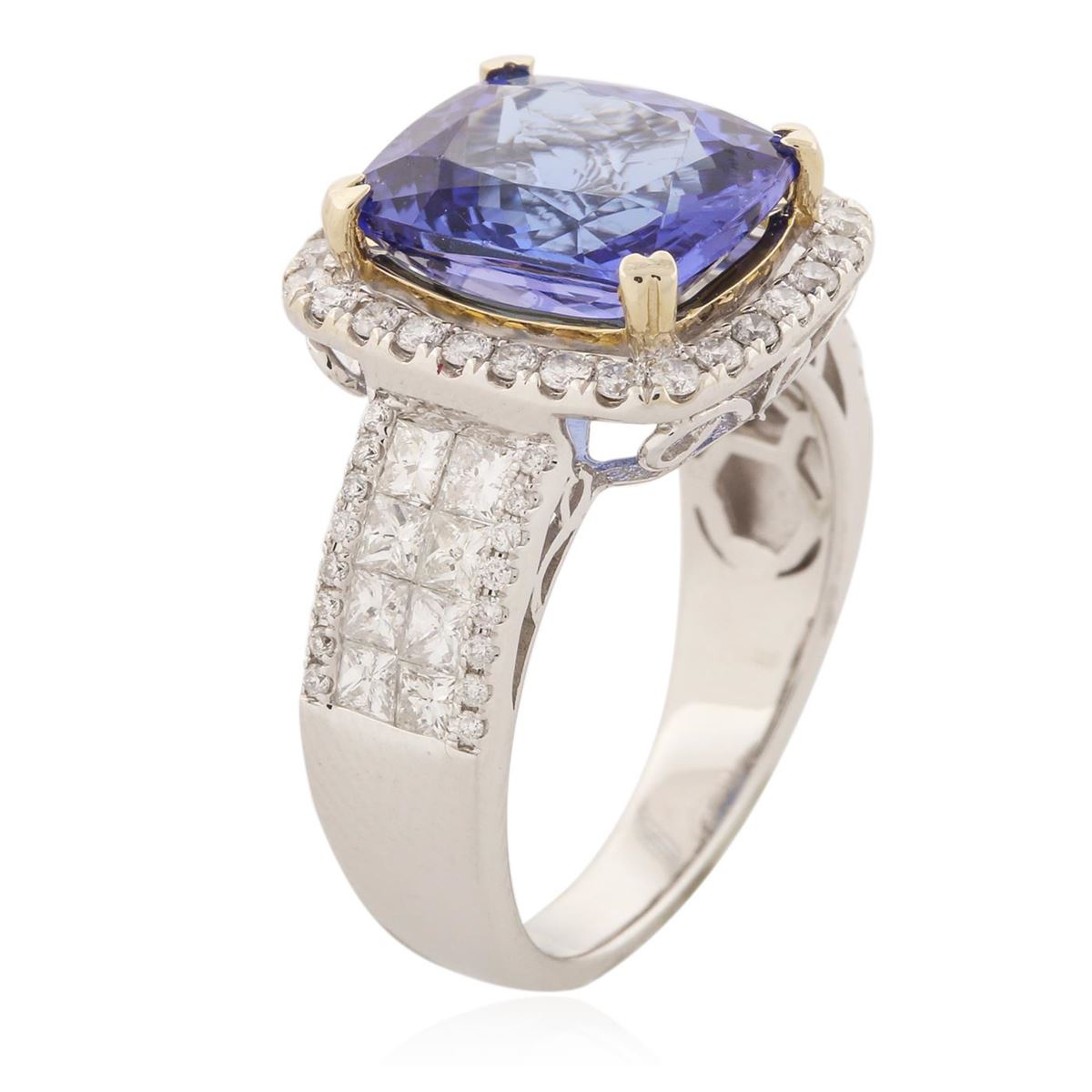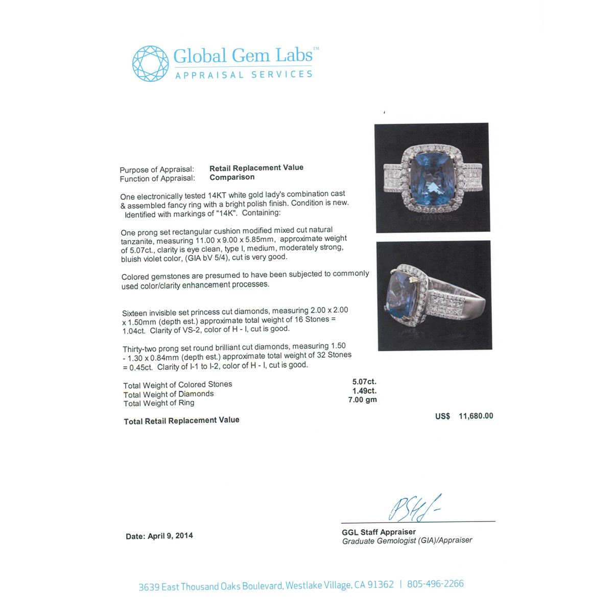 One electronically tested 14KT white gold Ladies combination cast & assembled fancy ring with a bright polish finish. Condition is new. Identified with markings of "14K". Containing: One prong set rectangular cushion modified mixed cut natural tanzanite, measuring 11.00 x 9.00 x 5.85mm, approximate weight of 5.07ct., clarity is eye clean, type I, medium, moderately strong, bluish violet color, (GIA bV 5/4), cut is very good. Colored gemstones are presumed to have been subjected to commonly used color/clarity enhancement processes. Sixteen invisible set princess cut diamonds, measuring 2.00 x 2.00 x 1.50mm (depth est.) approximate. Total Weight of 16 Stones = 1.04ct. Clarity: VS-2. Color: H - I, Cut is Good. Thirty-Two prong set round brilliant cut diamonds, measuring 1.50 - 1.30 x 0.84mm (depth est.) approximate. Total Weight of 32 Stones = 0.45ct. Clarity: I-1 to I-2. Color: H - I, Cut is Good. Total Weight of Colored Stones 5.07ct. Total Weight of Diamonds 1.49ct. Total Weight of Ring 7.00 grams. GGL Appraised at $11,680.00.