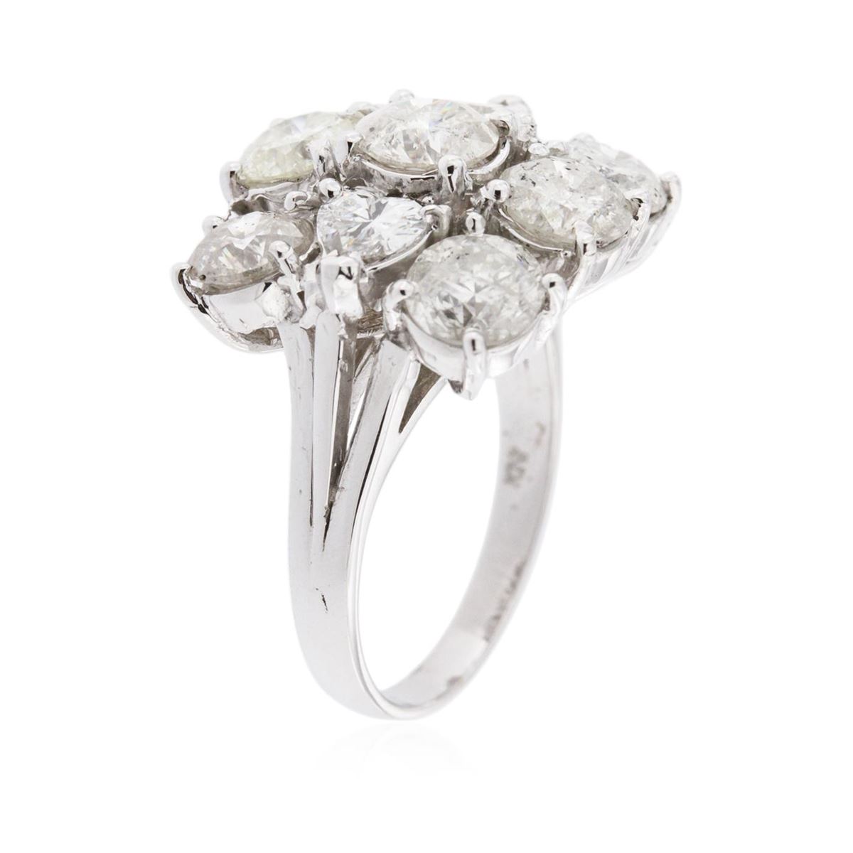 14KT white gold 5.08ctw Diamond Ring A6610. one-half millimeter wide band. Identified with markings of "14K". Condition is good. Containing: Seven prong set round brilliant cut diamonds, measuring 5.70 - 5.40 x 3.33mm (depth est.) approximate. Total Weight of 7 Stones = 4.50ct. The color grade reflects the entire range of color for this group. Graded in the setting. Clarity: I-1 to I-2. Color: H - K Two prong set heart shaped cut diamonds, measuring 4.10 x 4.00 x 2.52mm (depth est.) approximate. Total Weight of 2 Stones = 0.58ct. Graded in the setting. Clarity: SI-1. Color: H - K. Total Weight of Diamonds 5.08ct. AIG Appraised at $27,475.00.