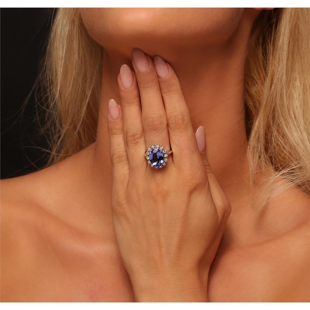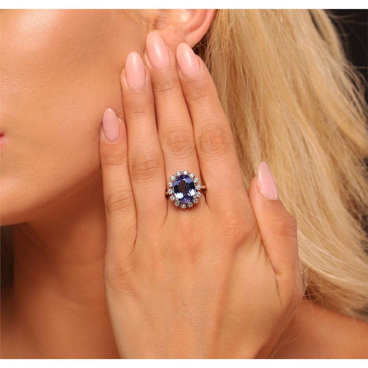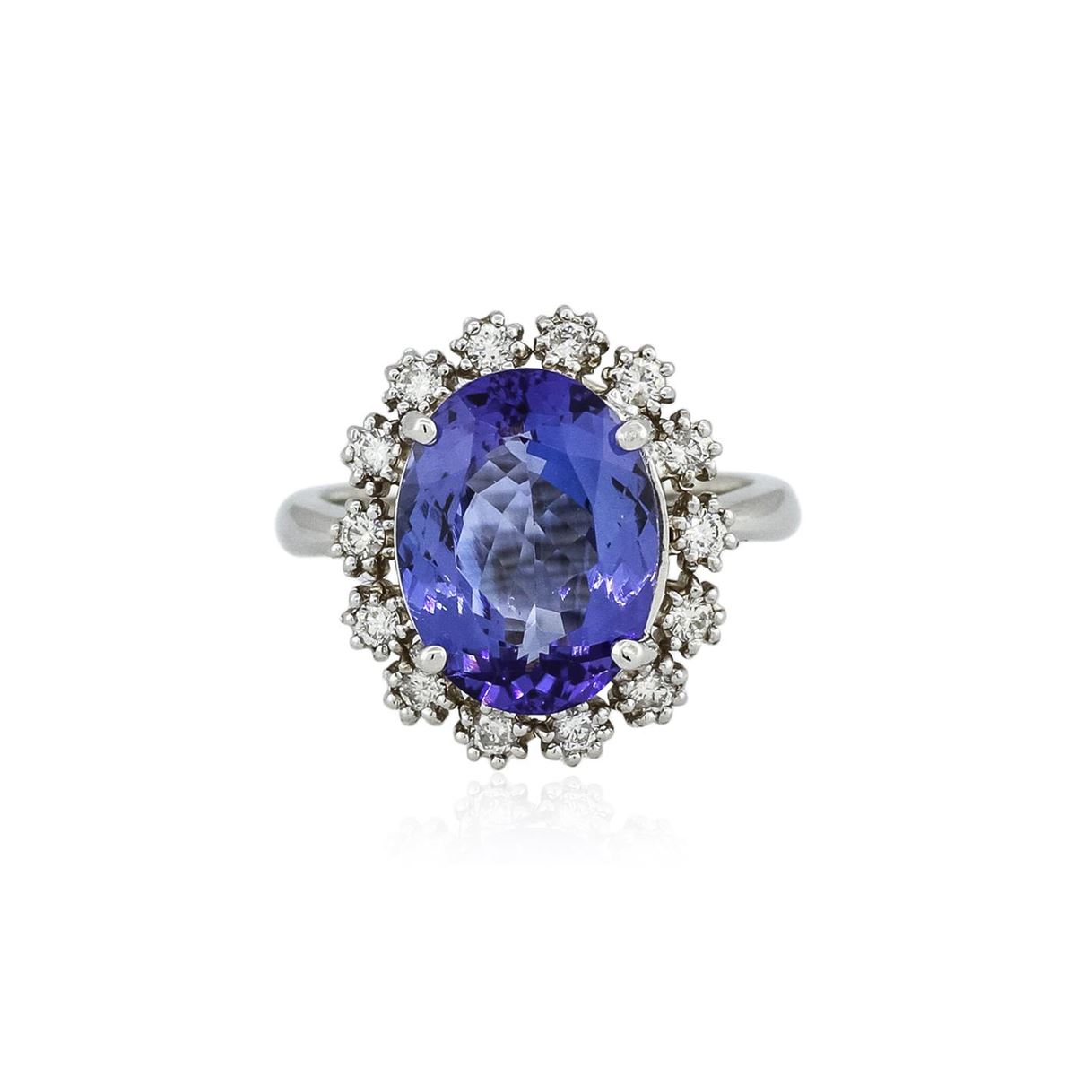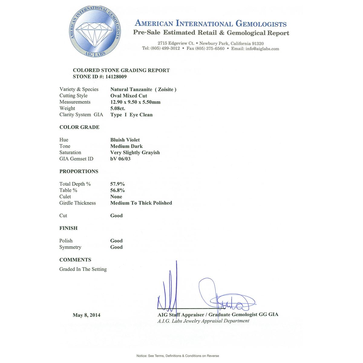 One electronically tested 14KT white gold ladies cast tanzanite and diamond ring with a bright polish finish. Condition is new, good workmanship. The featured tanzanite is set within a diamond bezel supported by tapering shoulders, completed by a two millimeter wide band. Identified with markings of "K14". Containing: One prong set oval mixed cut natural tanzanite, measuring 12.90 x 9.50 x 5.50mm, 10%. bulge factor, approximate weight of 5.08ct., clarity is eye clean, type I, medium dark, very slightly grayish, bluish violet color, (GIA bV 6/3), cut is good. Transmitting light with no distortion, transparent. Colored Stone Grading Report attached. Graded in the setting. Tanzanite is a very rare gemstone that is only found in the country of Tanzania. Originally discovered in 1967. Tiffany & Company, named the stone Tanzanite. It is found in the Usumburu Mountains that border the Umba Valley of northern Tanzania. Tanzanite occurs in gray, brown, violet, blue, reddish-purple, & green. The gem is interesting because of its exceptional pleochroism. Rotated in different directions a tanzanite will exhibit multiple changes of color. Tanzanite has a low tolerance to ultrasonic cleaning, and should not be cleaned using this method. Fourteen prong set round brilliant cut diamonds, measuring 2.10 - 2.00 x 1.23mm (depth est.) approximate. Total Weight of 14 Stones = 0.54ct. Graded in the setting. Clarity: SI-1 to I-1. Color: G - I. Total Weight of Colored Stones 5.08ct. Total Weight of Diamonds 0.54ct. Total Weight of Ring 5.71gm. AIG Appraised at $15,230.00.