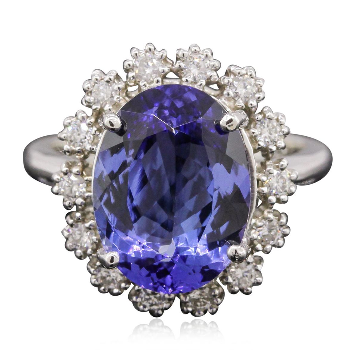 One electronically tested 14KT white gold ladies cast tanzanite and diamond ring with a bright polish finish. Condition is new, good workmanship. The featured tanzanite is set within a diamond bezel supported by tapering shoulders, completed by a two millimeter wide band. Identified with markings of "K14". Containing: One prong set oval mixed cut natural tanzanite, measuring 12.90 x 9.50 x 5.50mm, 10%. bulge factor, approximate weight of 5.08ct., clarity is eye clean, type I, medium dark, very slightly grayish, bluish violet color, (GIA bV 6/3), cut is good. Transmitting light with no distortion, transparent. Colored Stone Grading Report attached. Graded in the setting. Tanzanite is a very rare gemstone that is only found in the country of Tanzania. Originally discovered in 1967. Tiffany & Company, named the stone Tanzanite. It is found in the Usumburu Mountains that border the Umba Valley of northern Tanzania. Tanzanite occurs in gray, brown, violet, blue, reddish-purple, & green. The gem is interesting because of its exceptional pleochroism. Rotated in different directions a tanzanite will exhibit multiple changes of color. Tanzanite has a low tolerance to ultrasonic cleaning, and should not be cleaned using this method. Fourteen prong set round brilliant cut diamonds, measuring 2.10 - 2.00 x 1.23mm (depth est.) approximate. Total Weight of 14 Stones = 0.54ct. Graded in the setting. Clarity: SI-1 to I-1. Color: G - I. Total Weight of Colored Stones 5.08ct. Total Weight of Diamonds 0.54ct. Total Weight of Ring 5.71gm. AIG Appraised at $15,230.00.