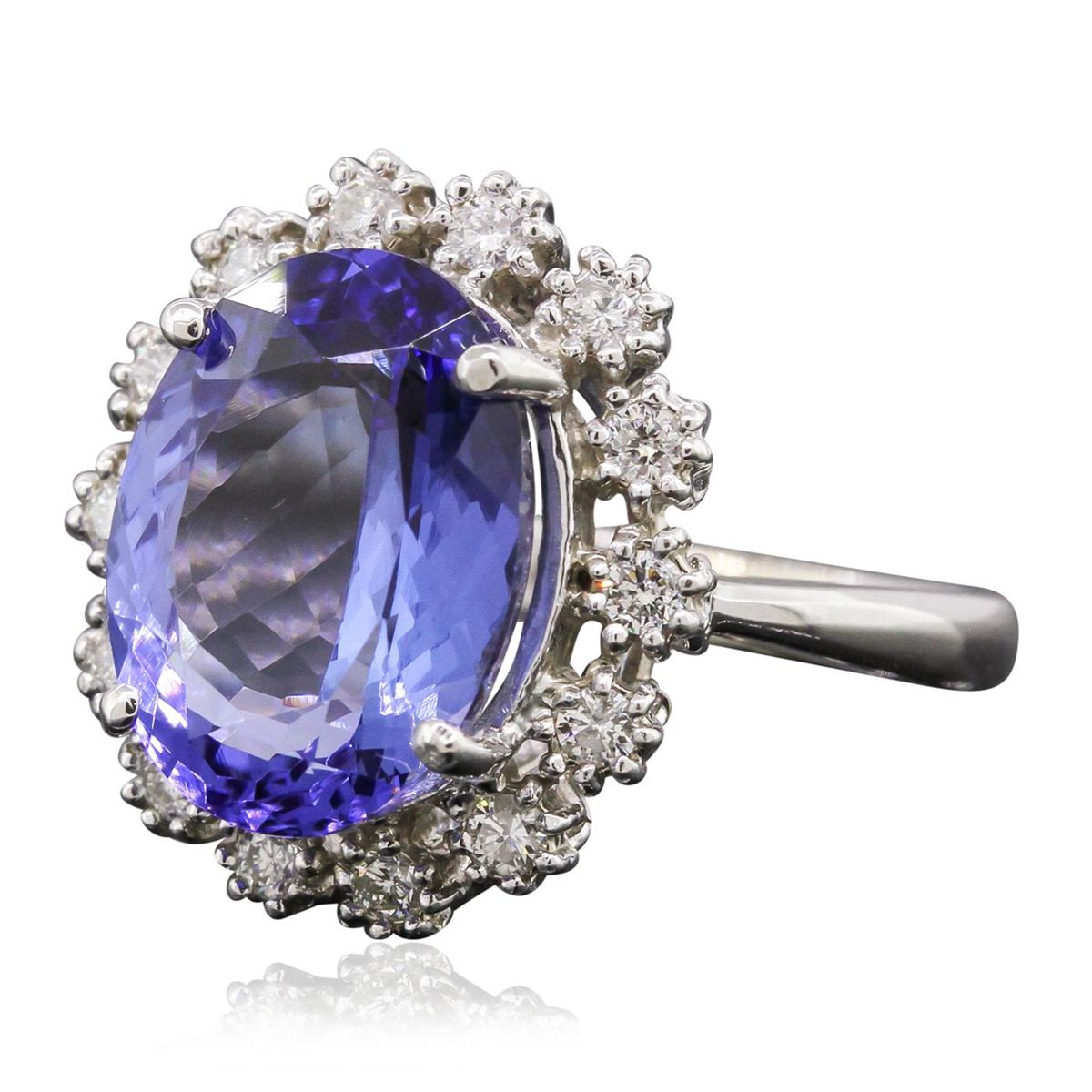 One electronically tested 14KT white gold ladies cast tanzanite and diamond ring with a bright polish finish. Condition is new, good workmanship. The featured tanzanite is set within a diamond bezel supported by tapering shoulders, completed by a two millimeter wide band. Identified with markings of "K14". Containing: One prong set oval mixed cut natural tanzanite, measuring 12.90 x 9.50 x 5.50mm, 10%. bulge factor, approximate weight of 5.08ct., clarity is eye clean, type I, medium dark, very slightly grayish, bluish violet color, (GIA bV 6/3), cut is good. Transmitting light with no distortion, transparent. Colored Stone Grading Report attached. Graded in the setting. Tanzanite is a very rare gemstone that is only found in the country of Tanzania. Originally discovered in 1967. Tiffany & Company, named the stone Tanzanite. It is found in the Usumburu Mountains that border the Umba Valley of northern Tanzania. Tanzanite occurs in gray, brown, violet, blue, reddish-purple, & green. The gem is interesting because of its exceptional pleochroism. Rotated in different directions a tanzanite will exhibit multiple changes of color. Tanzanite has a low tolerance to ultrasonic cleaning, and should not be cleaned using this method. Fourteen prong set round brilliant cut diamonds, measuring 2.10 - 2.00 x 1.23mm (depth est.) approximate. Total Weight of 14 Stones = 0.54ct. Graded in the setting. Clarity: SI-1 to I-1. Color: G - I. Total Weight of Colored Stones 5.08ct. Total Weight of Diamonds 0.54ct. Total Weight of Ring 5.71gm. AIG Appraised at $15,230.00.