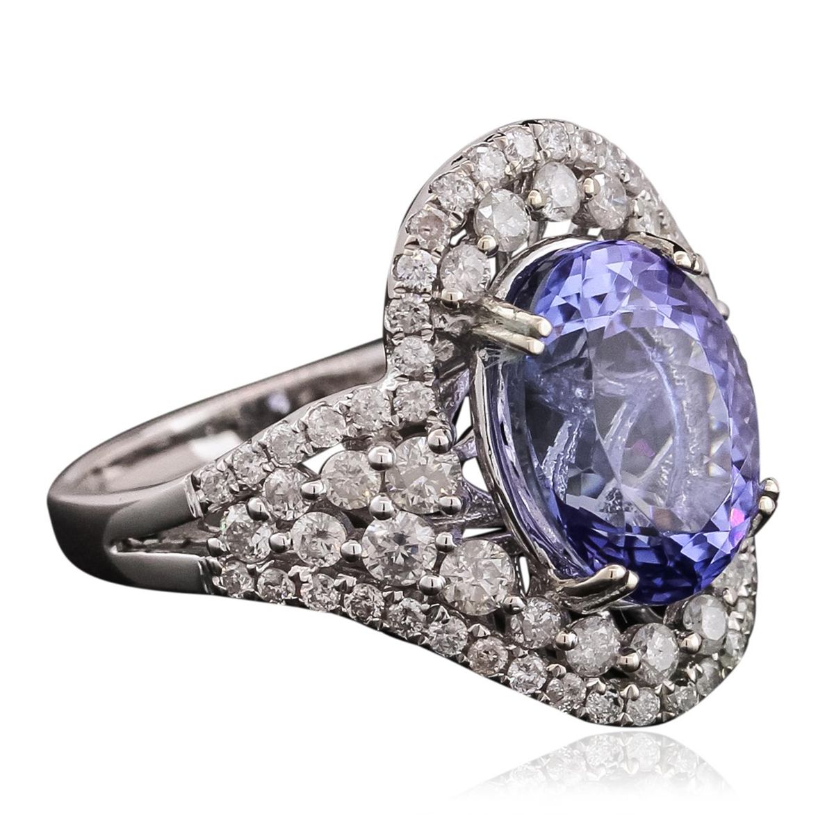 One electronically tested 14KT white gold ladies combination cast & assembled tanzanite and diamond ring with a flat shank with a bright polish finish. Identified with markings of "14K". Condition is new. Containing: One prong set oval modified brilliant cut natural tanzanite, measuring 11.45 x 8.87 x 7.35mm, approximate weight of 5.08ct., clarity is eye clean, type I, medium light, very slightly grayish, violet color, (GIA V 4/3), cut is good. Seventy prong set round brilliant cut diamonds, measuring 2.10 - 1.30 x 1.02mm (depth est.) approximate total weight of 70 Stones = 1.25ct. Clarity: SI-1 to I-1. Color: I - J, Cut is Good. Colored gemstones are presumed to have been subjected to commonly used enhancement processes. All diamonds and colored gemstones are graded in the mounting, unless otherwise stated. Total Weight of Colored Stones 5.08ct. Total Weight of Diamonds 1.25ct. Total Weight of Ring 5.50 grams. GGL Appraised at $11,415.00.