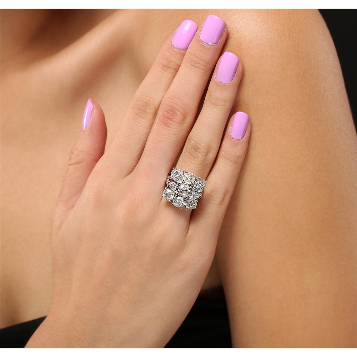 14KT white gold 5.08ctw Diamond Ring A6610. one-half millimeter wide band. Identified with markings of "14K". Condition is good. Containing: Seven prong set round brilliant cut diamonds, measuring 5.70 - 5.40 x 3.33mm (depth est.) approximate. Total Weight of 7 Stones = 4.50ct. The color grade reflects the entire range of color for this group. Graded in the setting. Clarity: I-1 to I-2. Color: H - K Two prong set heart shaped cut diamonds, measuring 4.10 x 4.00 x 2.52mm (depth est.) approximate. Total Weight of 2 Stones = 0.58ct. Graded in the setting. Clarity: SI-1. Color: H - K. Total Weight of Diamonds 5.08ct. AIG Appraised at $27,475.00.