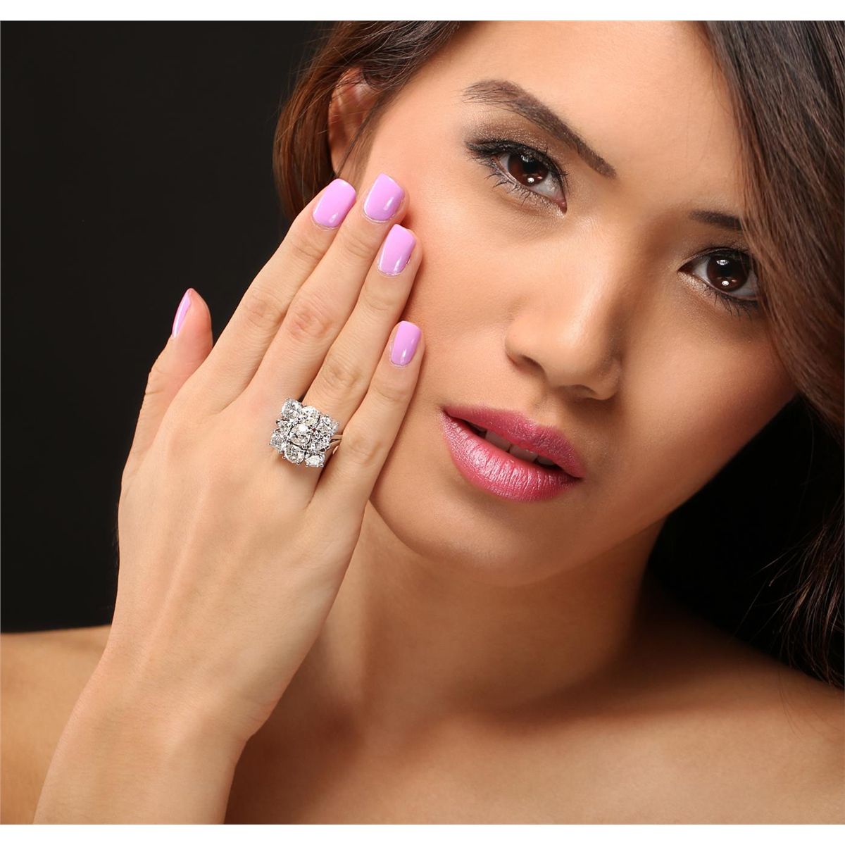 14KT white gold 5.08ctw Diamond Ring A6610. one-half millimeter wide band. Identified with markings of "14K". Condition is good. Containing: Seven prong set round brilliant cut diamonds, measuring 5.70 - 5.40 x 3.33mm (depth est.) approximate. Total Weight of 7 Stones = 4.50ct. The color grade reflects the entire range of color for this group. Graded in the setting. Clarity: I-1 to I-2. Color: H - K Two prong set heart shaped cut diamonds, measuring 4.10 x 4.00 x 2.52mm (depth est.) approximate. Total Weight of 2 Stones = 0.58ct. Graded in the setting. Clarity: SI-1. Color: H - K. Total Weight of Diamonds 5.08ct. AIG Appraised at $27,475.00.