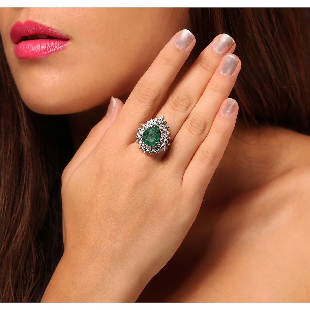 One electronically tested 14KT white gold Ladies combination cast & assembled fashion ring with a high polish finish. Condition is new. Identified with markings of "14K". Containing: One prong set pear modified mixed cut natural emerald, measuring 12.00 x 10.00 x 7.80mm, approximate weight of 5.09ct., clarity is heavily included, type III, medium dark, moderately strong, bluish green color, (GIA bG 6/4), cut is good. Colored gemstones are presumed to have been subjected to commonly used and possible undetectable color/clarity enhancement processes. Eighteen prong set round brilliant cut diamonds, measuring 2.90 - 2.90 x 1.74mm (depth est.) approximate total weight of 18 Stones = 1.61ct. Clarity of SI-1 to I-1, Color of K - L, Cut is Good. Seventeen prong set round brilliant cut diamonds, measuring 2.40 - 2.40 x 1.44mm (depth est.) approximate total weight of 17 Stones = 0.86ct. Clarity of SI-1 to SI-2, Color of K - L, Cut is Good. Total Weight of Colored Stones 5.09ct. Total Weight of Diamonds 2.47ct. Total Weight of Ring 11.50 grams. GGL Appraised at $18,070.00.
