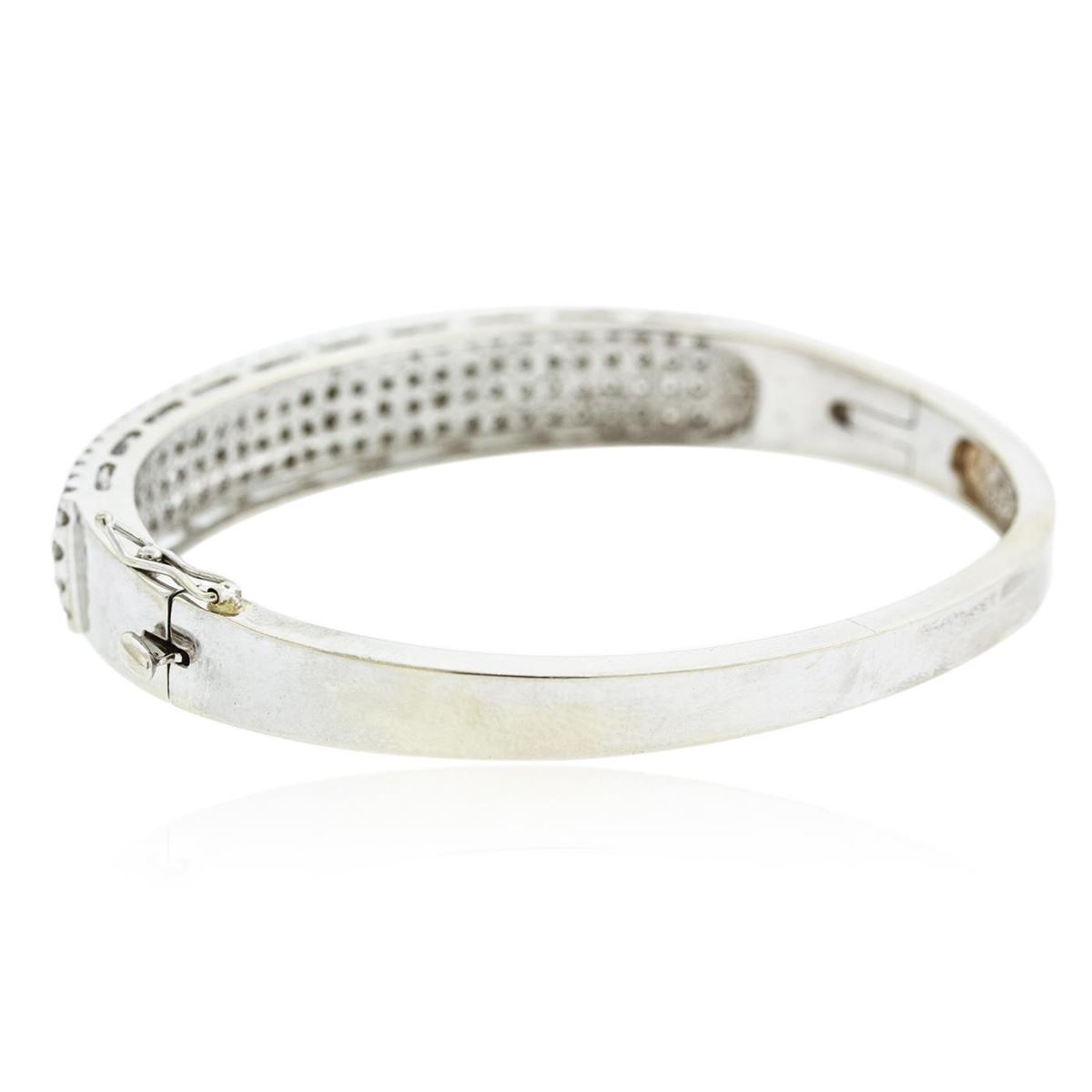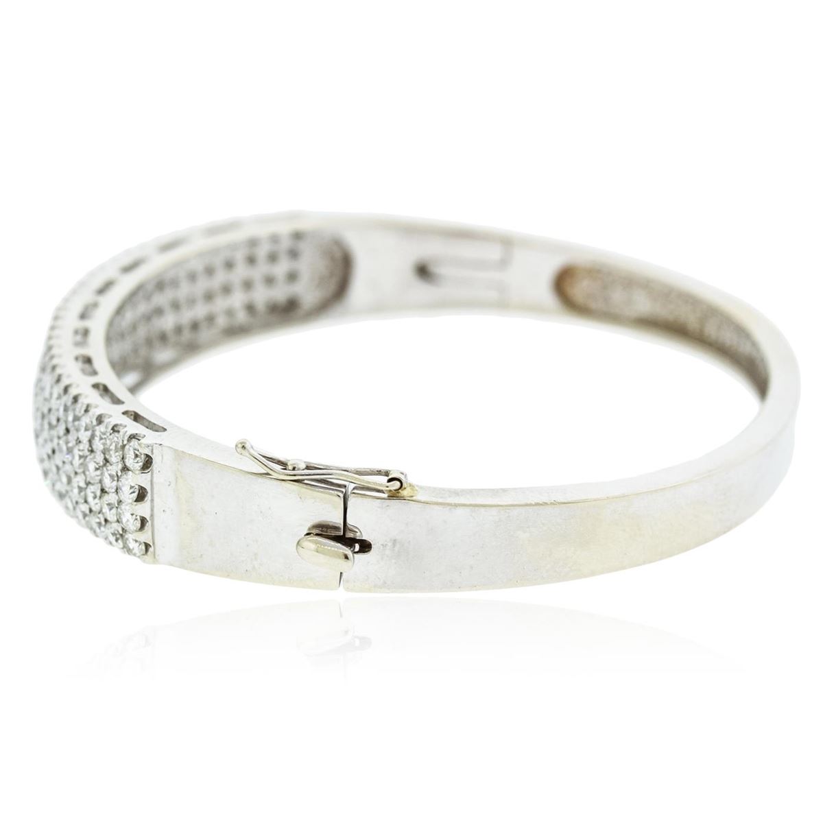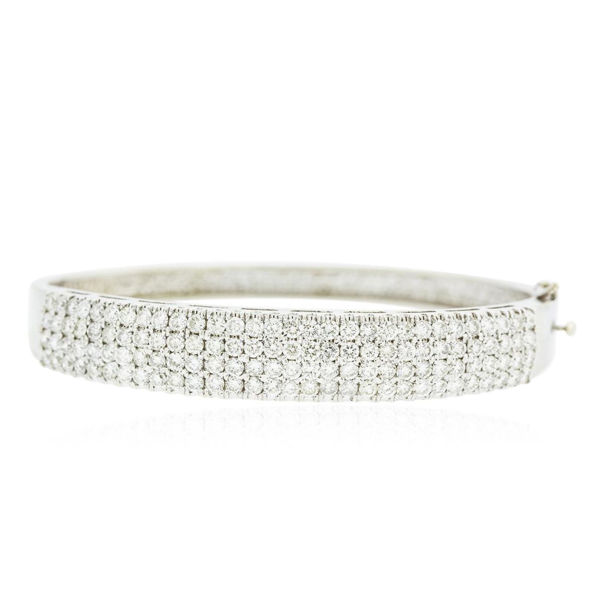 One electronically tested 14KT white gold ladies cast diamond bangle bracelet with a bright polish finish. Condition is new, excellent workmanship. Diamond set six and three-quarter inch length hinged bangle bracelet, completed by a concealed clasp with safety. Identified with markings of "14K". Containing: One Hundred Twenty prong set round brilliant cut diamonds, measuring 2.30 - 2.20 x 1.35mm (depth est.) approximate. Total Weight of 120 Stones = 5.10ct. Graded in the setting. Clarity: SI-1 to I-1. Color: H - J. Total Weight of Diamonds 5.10ct. Total Weight of Bangle 30.30 grams. AIG Appraised at $21,200.00.