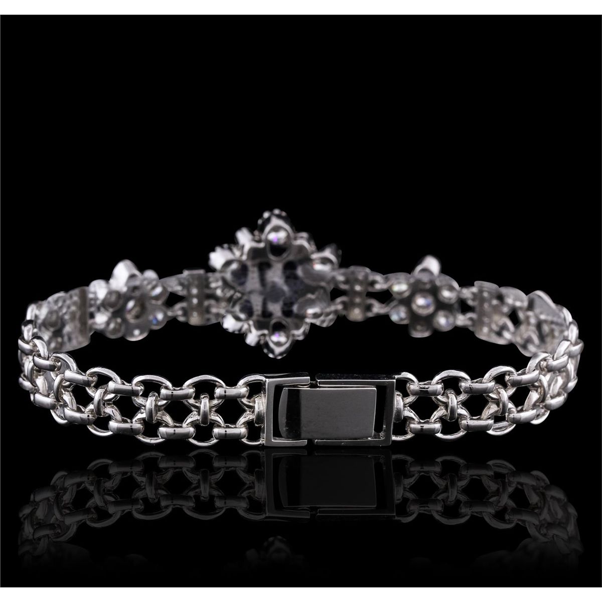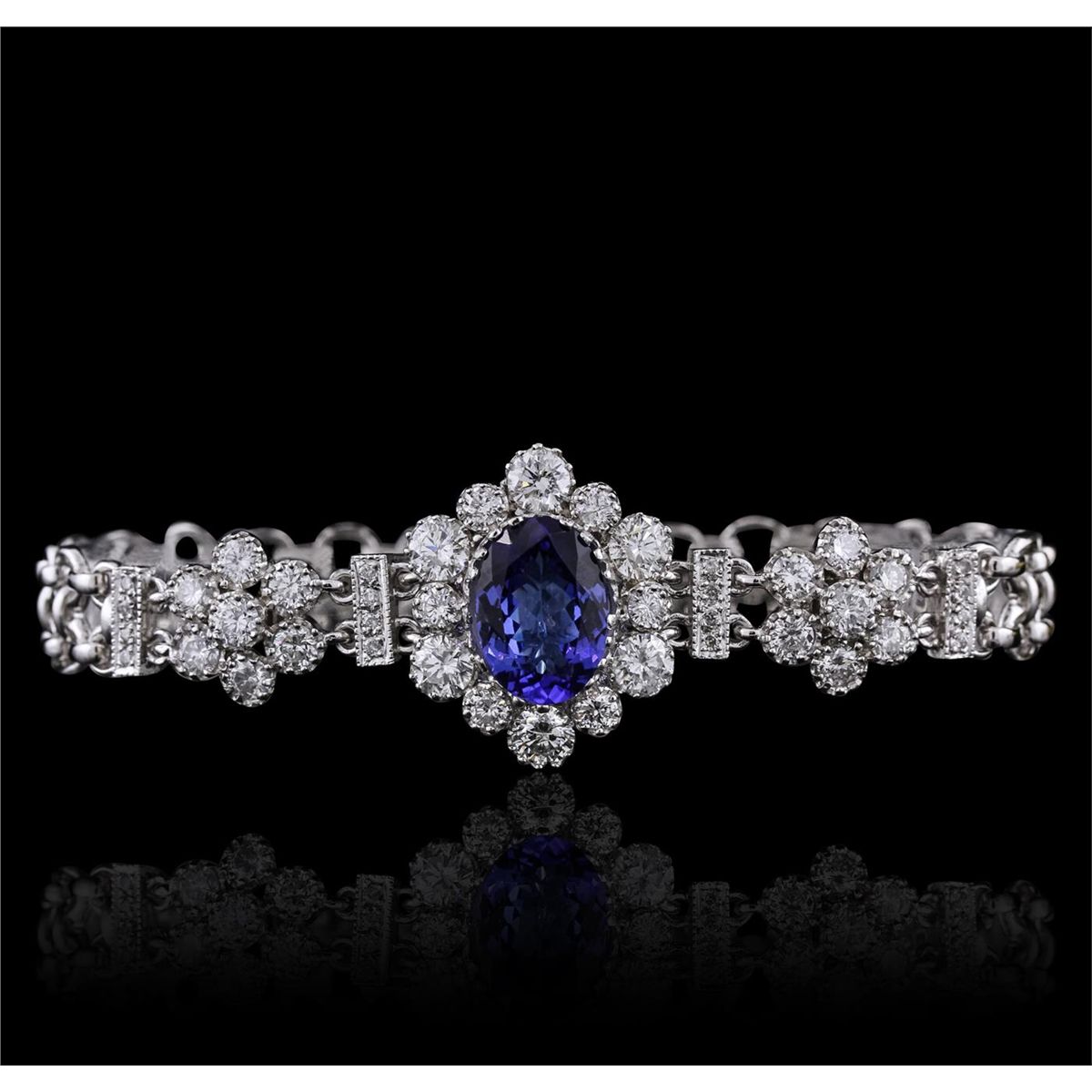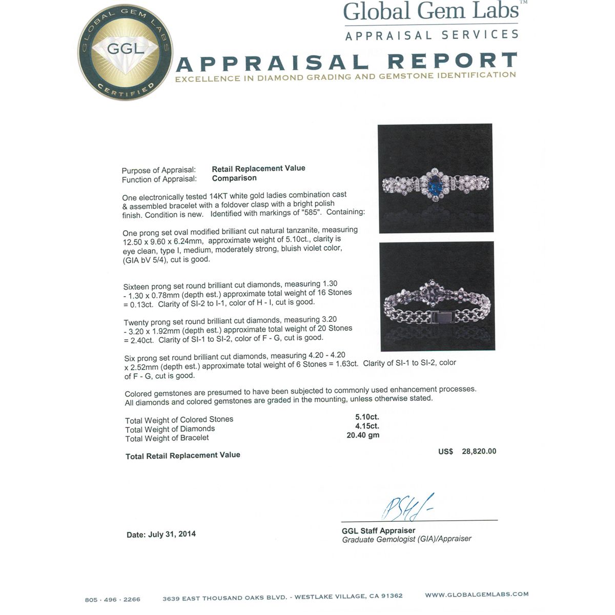 One electronically tested 14KT white gold ladies combination cast & assembled bracelet with a foldover clasp with a bright polish finish. Condition is new. Identified with markings of "585". Containing: One prong set oval modified brilliant cut natural tanzanite, measuring 12.50 x 9.60 x 6.24mm, approximate weight of 5.10ct., clarity is eye clean, type I, medium, moderately strong, bluish violet color, (GIA bV 5/4), cut is good. Sixteen prong set round brilliant cut diamonds, measuring 1.30 - 1.30 x 0.78mm (depth est.) approximate. Total Weight of 16 Stones = 0.13ct. Clarity: SI-2 to I-1. Color: H - I, Cut is Good. Twenty prong set round brilliant cut diamonds, measuring 3.20 - 3.20 x 1.92mm (depth est.) approximate. Total Weight of 20 Stones = 2.40ct. Clarity: SI-1 to SI-2. Color: F - G, Cut is Good. Six prong set round brilliant cut diamonds, measuring 4.20 - 4.20 x 2.52mm (depth est.) approximate. Total Weight of 6 Stones = 1.63ct. Clarity: SI-1 to SI-2. Color: F - G, Cut is Good. Colored gemstones are presumed to have been subjected to commonly used enhancement processes. All diamonds and colored gemstones are graded in the mounting, unless otherwise stated. Total Weight of Colored Stones 5.10ct. Total Weight of Diamonds 4.15ct. Total Weight of Bracelet 20.40 grams. GGL Appraised at $28,820.00.