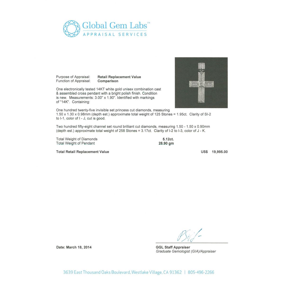 One electronically tested 14KT white gold unisex combination cast & assembled cross pendant with a bright polish finish. Condition is new. Measurements: 3.00." x 1.90". Identified with markings of "14K". Containing: One Hundred Twenty-Five invisible set princess cut diamonds, measuring 1.50 x 1.30 x 0.98mm (depth est.) approximate. Total Weight of 125 Stones = 1.95ct. Clarity: SI-2 to I-1. Color: I - J, Cut is Good. Two Hundred Fifty-Eight channel set round brilliant cut diamonds, measuring 1.50 - 1.50 x 0.90mm (depth est.) approximate. Total Weight of 258 Stones = 3.17ct. Clarity: I-2 to I-3. Color: J - K. Total Weight of Diamonds 5.12ct. Total Weight of Pendant 28.90gm. GGL Appraised at $19,995.00.