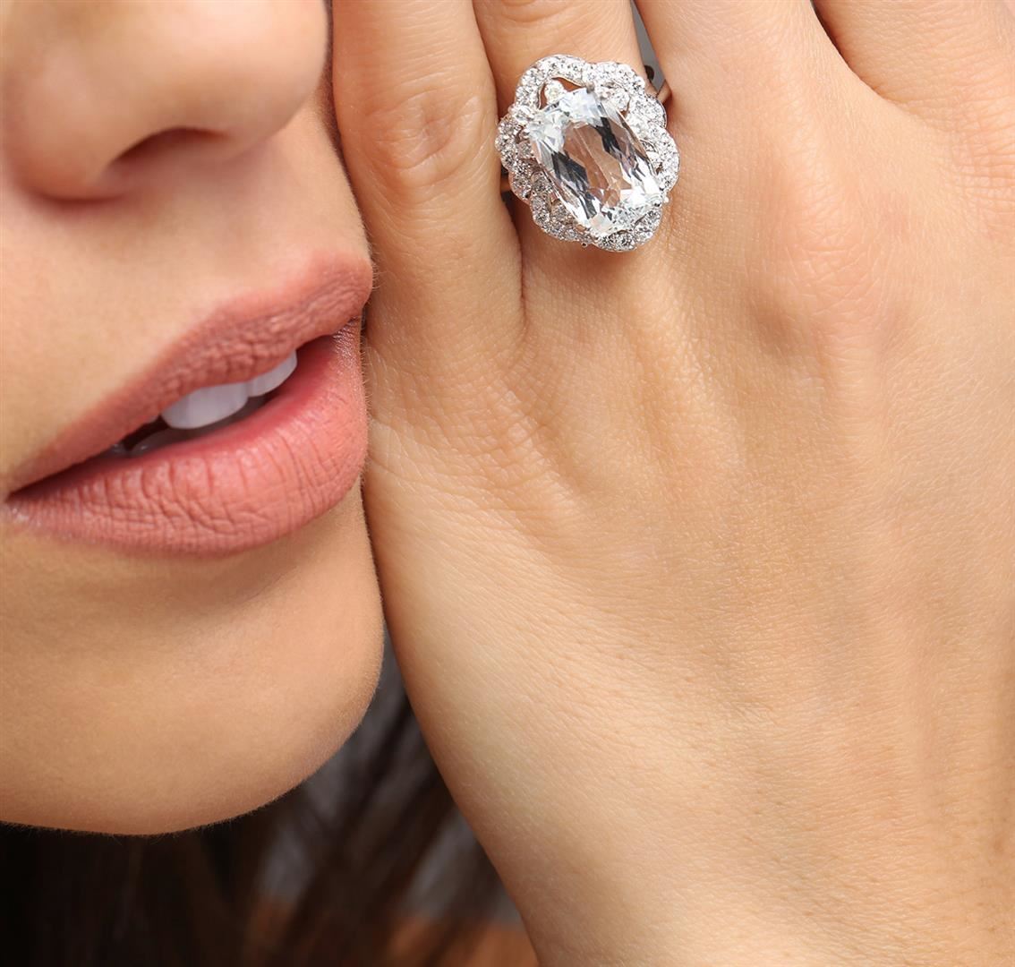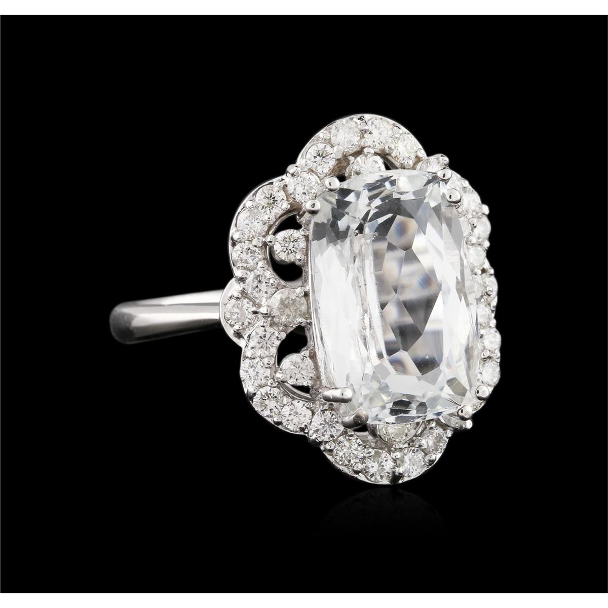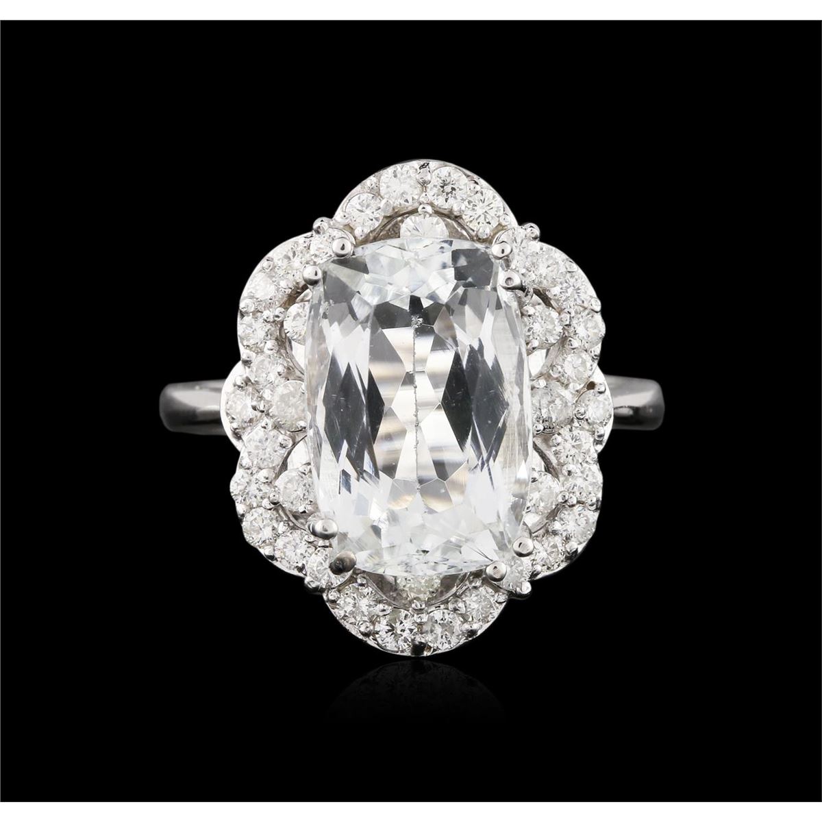 One electronically tested 14KT white gold ladies cast aquamarine and diamond ring with a bright polish finish. Identified with markings of "K14". Condition is new. Containing: One prong set rectangular cushion modified mixed cut natural aquamarine, measuring 13.37 x 8.96 x 6.70mm, approximate weight of 5.13ct., clarity is eye clean, type I, very light, slightly grayish, blue color, (GIA B 2/2), cut is good. Thirty-Nine prong set round brilliant cut diamonds, measuring 2.00 - 1.50 x 1.05mm (depth est.) approximate total weight of 39 Stones = 0.76ct. Clarity: SI-1 to I-1. Color: I - J, Cut is Good. Colored gemstones are presumed to have been subjected to commonly used enhancement processes. All diamonds and colored gemstones are graded in the mounting, unless otherwise stated. Total Weight of Colored Stones 5.13ct. Total Weight of Diamonds 0.76ct. Total Weight of Ring 6.20 grams. GGL Appraised at $3,910.00.