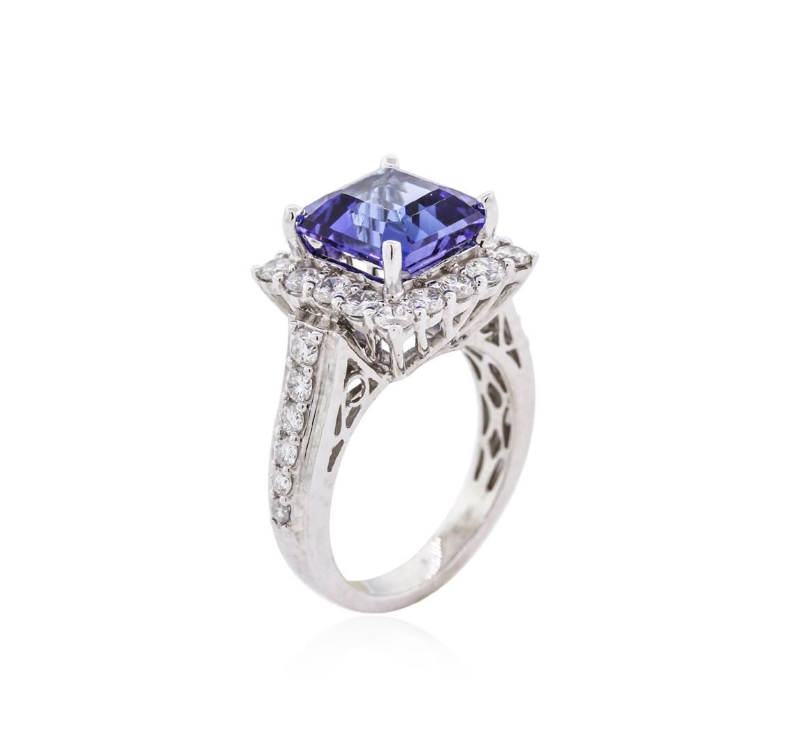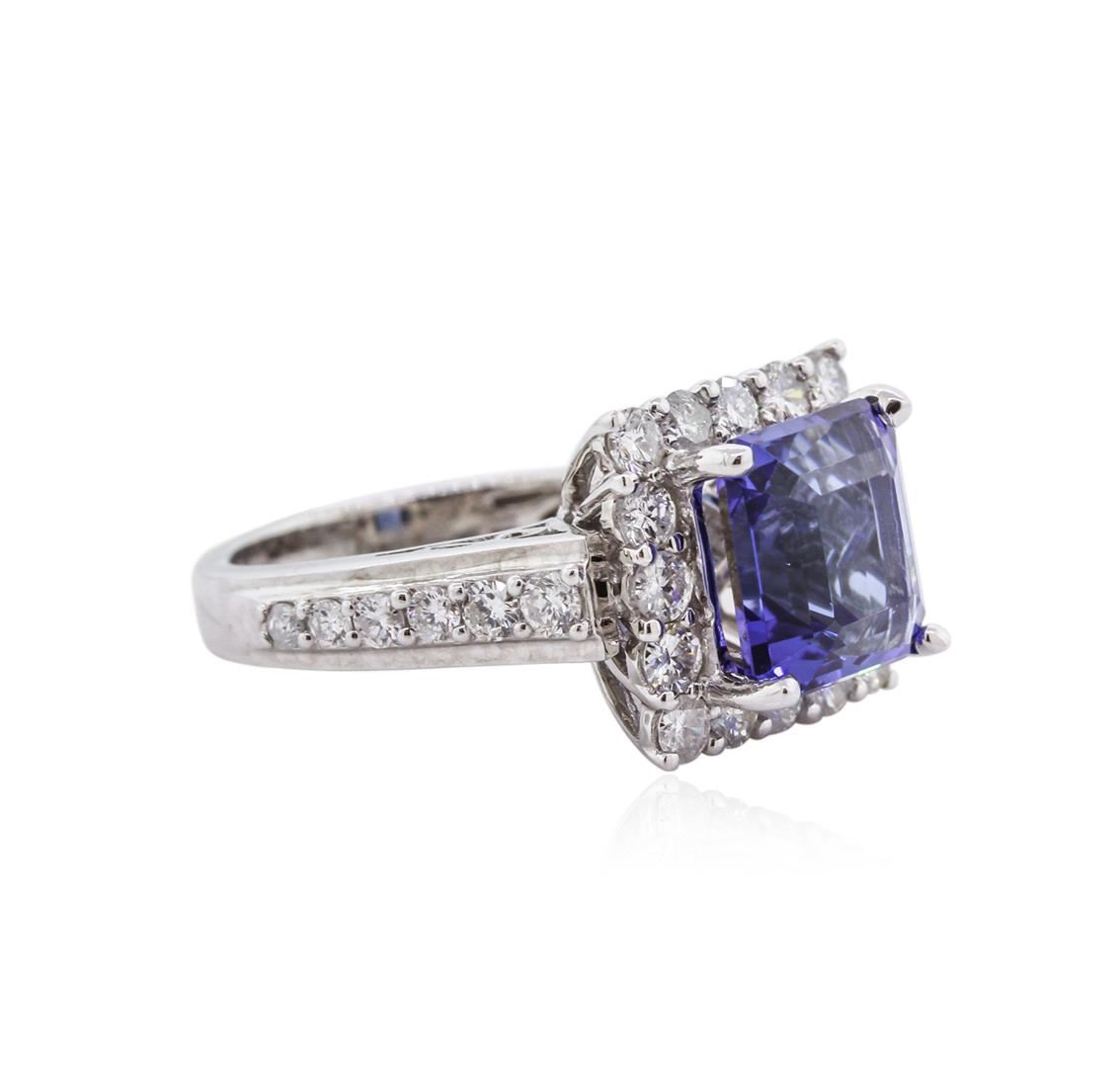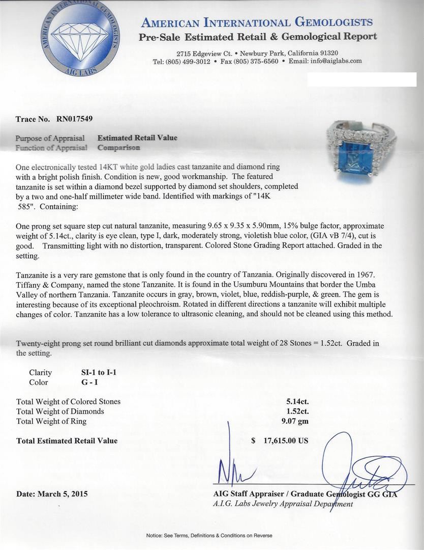 One electronically tested 14KT white gold ladies cast tanzanite and diamond ring with a bright polish finish. Condition is new, good workmanship. The featured tanzanite is set within a diamond bezel supported by diamond set shoulders, completed by a two and one-half millimeter wide band. Identified with markings of "14K 585". Containing: One prong set square step cut natural tanzanite, measuring 9.65 x 9.35 x 5.90mm, 15% bulge factor, approximate weight of 5.14ct., clarity is eye clean, type I, dark, moderately strong, violetish blue color, (GIA vB 7/4), cut is good. Transmitting light with no distortion, transparent. Tanzanite is a very rare gemstone that is only found in the country of Tanzania. Originally discovered in 1967. Tiffany & Company, named the stone Tanzanite. It is found in the Usumburu Mountains that border the Umba Valley of northern Tanzania. Tanzanite occurs in gray, brown, violet, blue, reddish-purple, & green. The gem is interesting because of its exceptional pleochroism. Rotated in different directions a tanzanite will exhibit multiple changes of color. Tanzanite has a low tolerance to ultrasonic cleaning, and should not be cleaned using this method. Twenty-eight prong set round brilliant cut diamonds approximate total weight of 28 Stones = 1.52ct. Graded in the setting. Clarity: SI-1 to I-1. Color: G-I. Total Weight of Colored Stones 5.14ct. Total Weight of Diamonds 1.52ct. Total Weight of Ring 9.07 grams. AIG Appraised at $17,615.00.