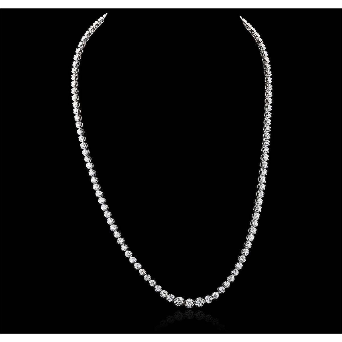 One electronically tested 14KT white gold ladies cast diamond necklace with a hidden box clasp with safety closer with a bright polish finish. Measurements: 17" in length Identified with markings of "14K". Condition is new. Containing: Fifty-Two prong set round brilliant cut diamonds, measuring 3.50 - 2.50 x 1.80mm (depth est.) approximate total weight of 52 Stones = 5.14ct. Clarity: SI-2 to I-1. Color: I - J, Cut is Good. All diamonds are graded in the mounting, unless otherwise stated. Total Weight of Diamonds 5.14ct. Total Weight of Necklace 26.90 grams. GGL Appraised at $19,645.00.