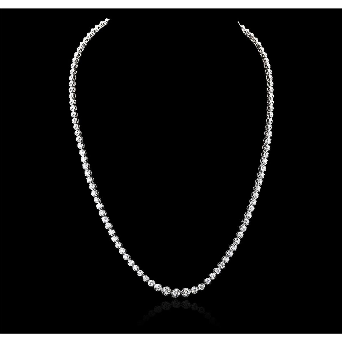 One electronically tested 14KT white gold ladies cast diamond necklace with a hidden box clasp with safety closer with a bright polish finish. Measurements: 17" in length Identified with markings of "14K". Condition is new. Containing: Fifty-Two prong set round brilliant cut diamonds, measuring 3.50 - 2.50 x 1.80mm (depth est.) approximate total weight of 52 Stones = 5.14ct. Clarity: SI-2 to I-1. Color: I - K, Cut is Good. All diamonds are graded in the mounting, unless otherwise stated. Total Weight of Diamonds 5.14ct. Total Weight of Necklace 28.00 grams. GGL Appraised at $19,080.00.