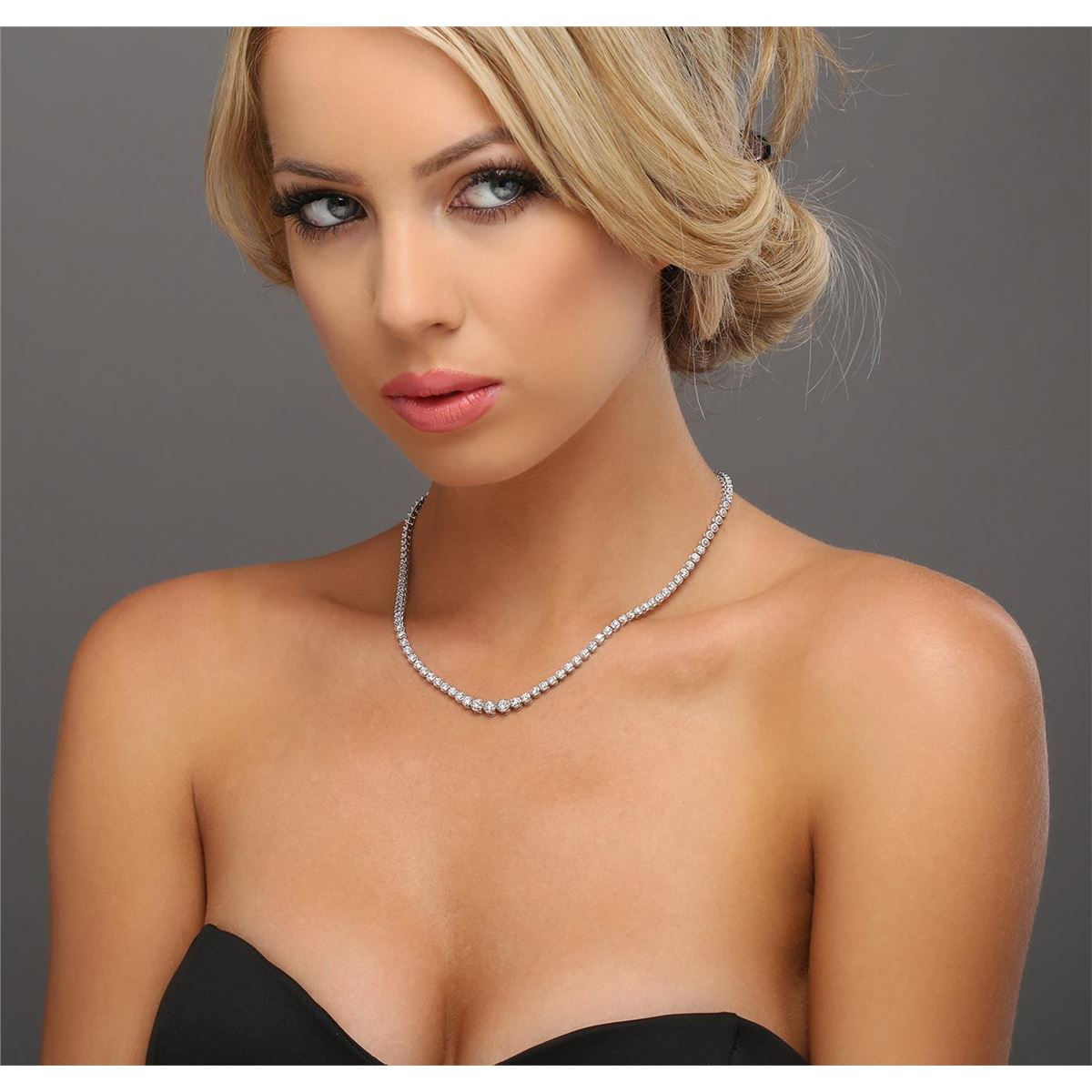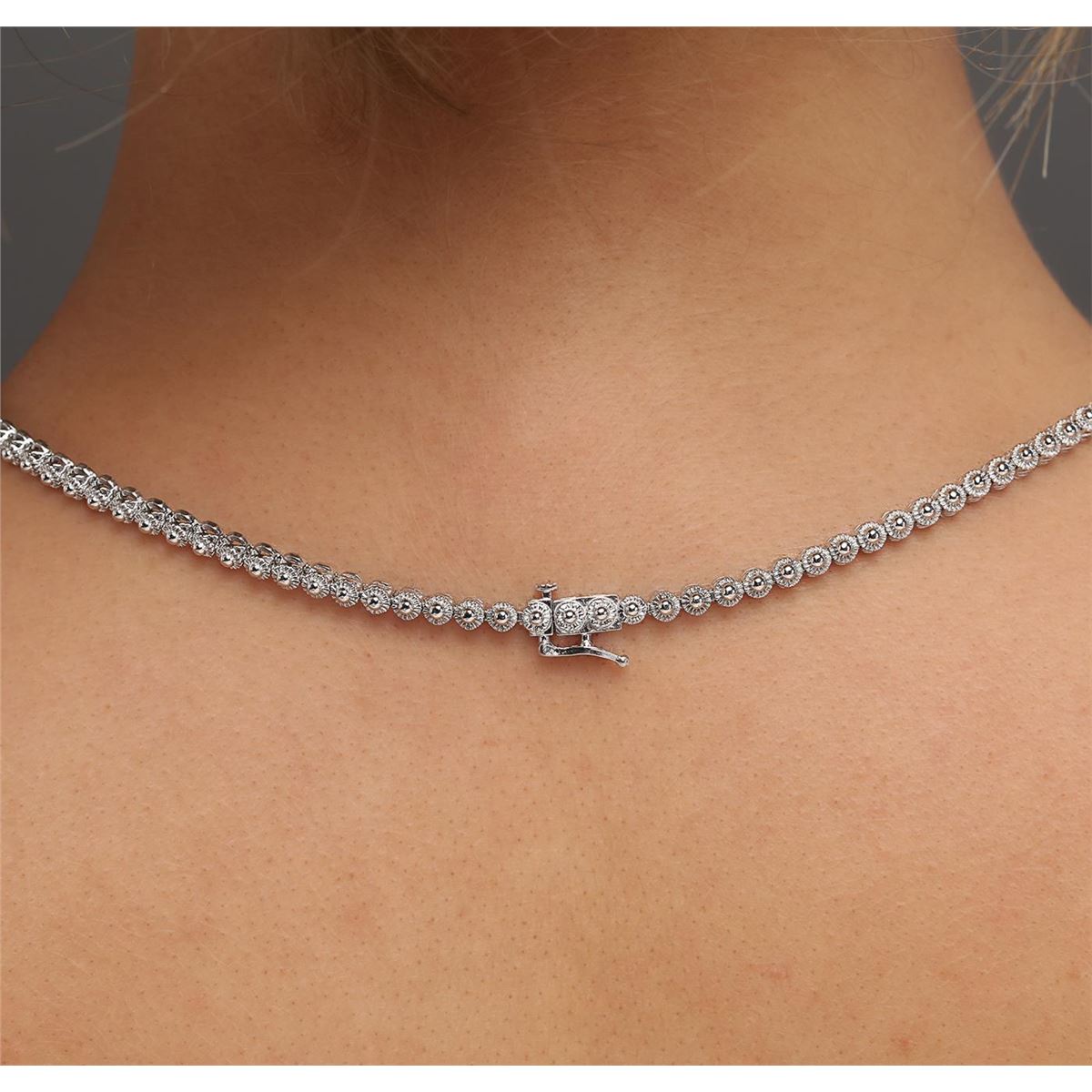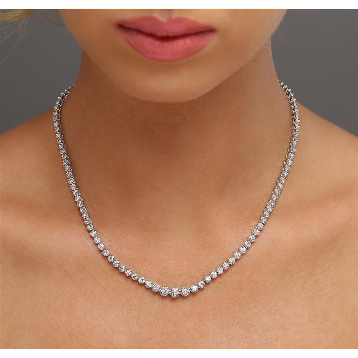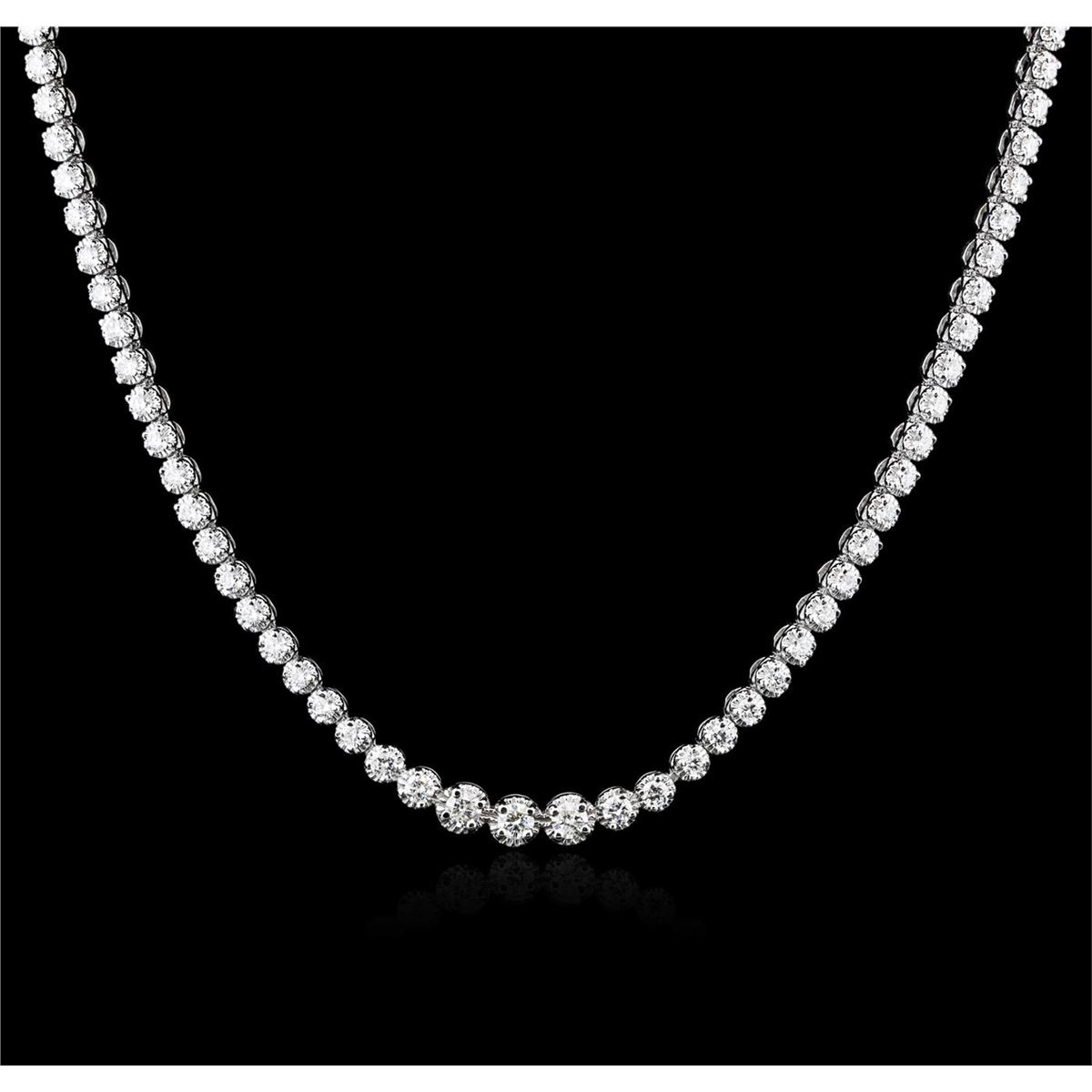 One electronically tested 14KT white gold ladies cast diamond necklace with a hidden box clasp with safety closer with a bright polish finish. Measurements: 17" in length Identified with markings of "14K". Condition is new. Containing: Fifty-Two prong set round brilliant cut diamonds, measuring 3.50 - 2.50 x 1.80mm (depth est.) approximate total weight of 52 Stones = 5.14ct. Clarity: SI-2 to I-1. Color: I - K, Cut is Good. All diamonds are graded in the mounting, unless otherwise stated. Total Weight of Diamonds 5.14ct. Total Weight of Necklace 28.00 grams. GGL Appraised at $19,080.00.