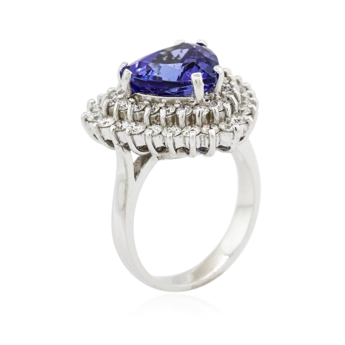 One electronically tested 14KT White Gold ladies cast tanzanite and diamond ring with a bright polish finish. The featured tanzanite is set within two tiered diamond bezels, completed by a three millimeter wide band. Identified with markings of "K14". Condition is new, good workmanship. Containing: One prong set triangle mixed cut natural tanzanite, measuring 10.95 x 10.90 x 6.75mm, 6% bulge factor, approximate weight of 5.15ct., clarity is eye clean, type I, medium dark, moderately strong, violetish blue color, (GIA vB 6/4), cut is good. Transmitting light with no distortion, transparent. Colored Stone Grading Report attached. Graded in the setting. Tanzanite is a very rare gemstone that is only found in the country of Tanzania. Originally discovered in 1967. Tiffany & Company, named the stone Tanzanite. It is found in the Usumburu Mountains that border the Umba Valley of northern Tanzania. Tanzanite occurs in gray, brown, violet, blue, reddish-purple, & green. The gem is interesting because of its exceptional pleochroism. Rotated in different directions a tanzanite will exhibit multiple changes of color. Tanzanite has a low tolerance to ultrasonic cleaning, and should not be cleaned using this method. Forty-Six round brilliant cut diamonds, measuring 2.20 - 2.00 x 1.26mm (depth est.) approximate total weight of 46 Stones = 1.56ct. Total Weight of Colored Stones 5.15ct. Total Weight of Diamonds 1.56ct. Total Weight of Ring 9.89 grams. AIG Appraised at $14,655.00.