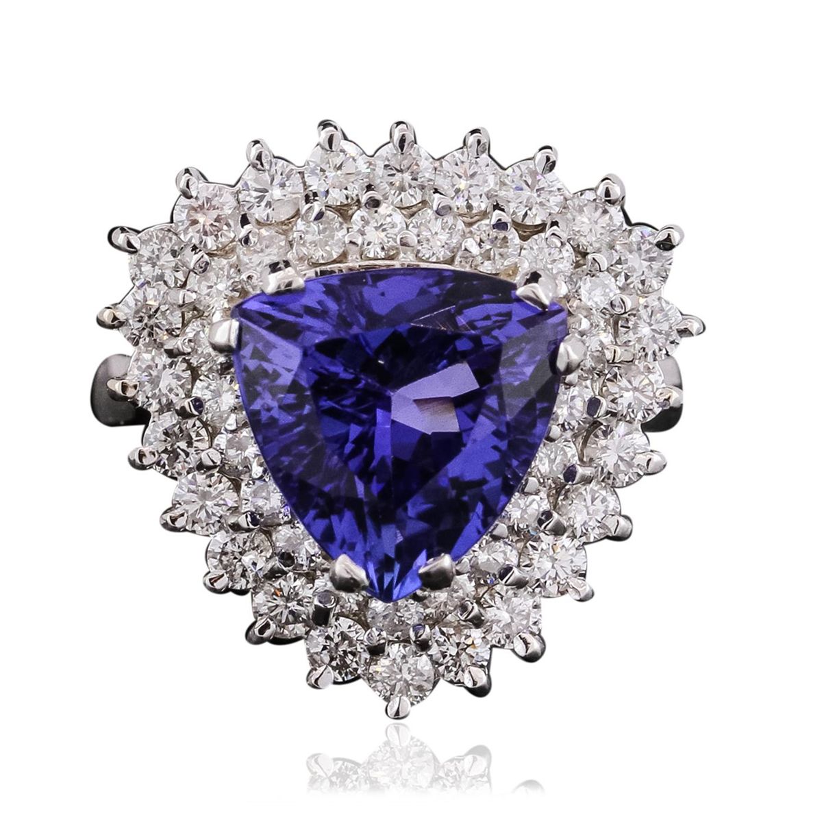 One electronically tested 14KT White Gold ladies cast tanzanite and diamond ring with a bright polish finish. The featured tanzanite is set within two tiered diamond bezels, completed by a three millimeter wide band. Identified with markings of "K14". Condition is new, good workmanship. Containing: One prong set triangle mixed cut natural tanzanite, measuring 10.95 x 10.90 x 6.75mm, 6% bulge factor, approximate weight of 5.15ct., clarity is eye clean, type I, medium dark, moderately strong, violetish blue color, (GIA vB 6/4), cut is good. Transmitting light with no distortion, transparent. Colored Stone Grading Report attached. Graded in the setting. Tanzanite is a very rare gemstone that is only found in the country of Tanzania. Originally discovered in 1967. Tiffany & Company, named the stone Tanzanite. It is found in the Usumburu Mountains that border the Umba Valley of northern Tanzania. Tanzanite occurs in gray, brown, violet, blue, reddish-purple, & green. The gem is interesting because of its exceptional pleochroism. Rotated in different directions a tanzanite will exhibit multiple changes of color. Tanzanite has a low tolerance to ultrasonic cleaning, and should not be cleaned using this method. Forty-Six round brilliant cut diamonds, measuring 2.20 - 2.00 x 1.26mm (depth est.) approximate total weight of 46 Stones = 1.56ct. Total Weight of Colored Stones 5.15ct. Total Weight of Diamonds 1.56ct. Total Weight of Ring 9.89 grams. AIG Appraised at $14,655.00.